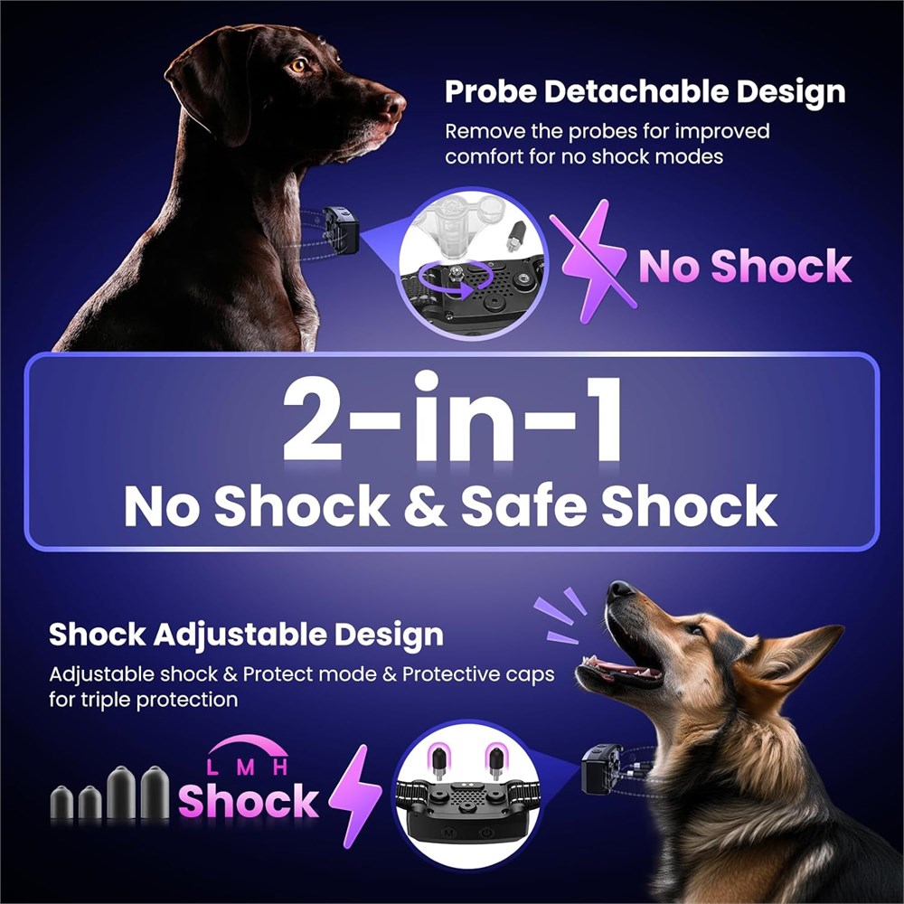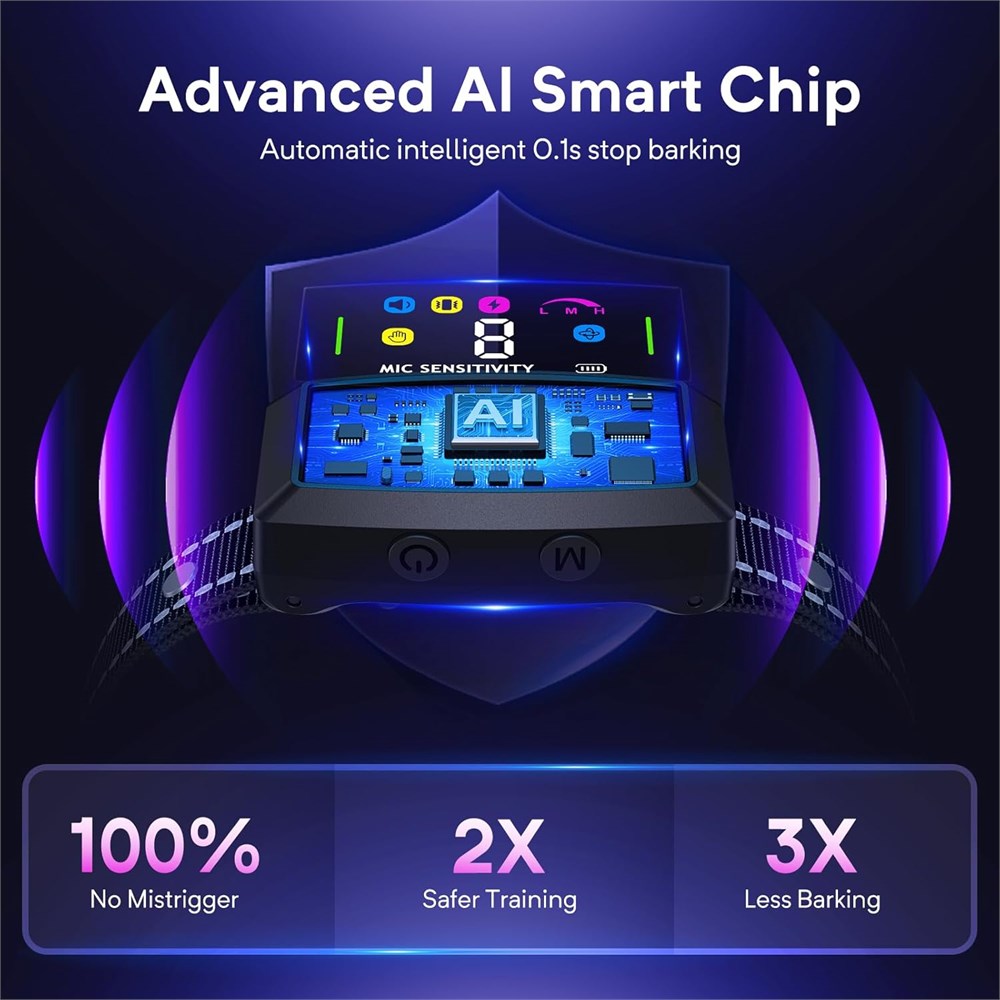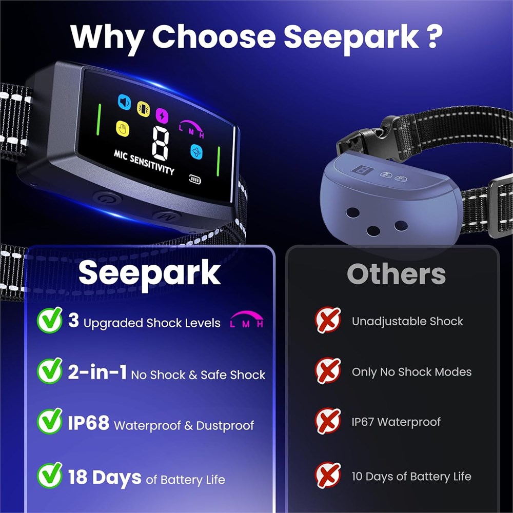 Smart AI Chip for 100% Anti-mistrigger Leveraging a sophisticated AI chip, SEEPARK's bark collar for large dogs integrates motion and voiceprint analysis to provide accurate feedback and guidance. Through real-time analysis and recognition of your dog's barking and movements, this collar delivers effective correction and training to tackle excessive barking. Eliminate unnecessary triggers and relish in a quieter, more peaceful environment. 2025 Upgraded AI - Empowered, False Trigger Free The Seepark smart bark collar for medium dogs designed specifically for small dogs is equipped with a state-of-the-art AI-powered smart dog bark recognition chip, combined with advanced motion detection technology. When set at sensitivities 1-7, it will only activate when both the dog's movement and barking are detected simultaneously. At sensitivity level 8, it responds solely to the detection of the dog's barking. This innovative technology ensures that barks from other dogs are safely and effectively filtered out. IP68 Water & Dust Proof Featuring the highest IP68 waterproof and dustproof design, SEEPARK's bark collar for medium dogs is ideal for a range of outdoor activities, ensuring your furry companion can swim or play at the beach worry-free. With an upgraded chip, it boasts lower energy consumption for extended battery life of up to 18 days, promoting sustainability. Moreover, the innovative magnetic charging design enhances waterproof and leak-proof capabilities, providing added safety for your beloved pets. Fits ALL Dogs & Reflective Trim Design Crafted from soft and odor-free nylon, the adjustable leash is designed to comfortably accommodate dogs weighing 8-120lbs of any breed. Featuring reflective trim, our anti-barking collar for dogs offers enhanced visibility from all angles in low light conditions, ensuring your furry friend stays visible and safe whether you're strolling along a bustling street or a tranquil trail at night. Note: Do not trim the leash; if necessary, please burn the end to prevent fraying.