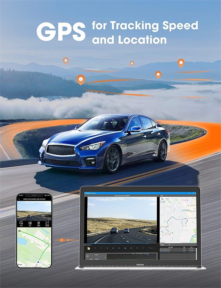 Real Ultra HD 4K & 1080P Dual Dash Cam The dash cam offers top quality 4K 3840*2160P with Sony IMX335 sensor on the front camera and 1920*1080P on the rear camera that captures the super clear view. Help you read most details from street signs, license plates, etc. Wide-angle dual-camera capture all pedestrians and vehicles around the car, providing sufficient evidence for rear-end collisions or collisions, etc. Built-in Wi-Fi & GPS The 4K backup car camera has built-in Wi-Fi with an easy connection to your smartphone app. With the app, it's very convenient to operate live preview, playback, and device management on your smartphone. What's more, Video files can be downloaded to a smartphone and shared with your friend by social media. Built-in GPS, which records your route and driving speed in videos. GPS module attached to the dashcams, no need to wire the GPS cable separately. 3" OLED Touchscreen Display Easy to connect the dashcam with the phone App via built-in WiFi. You can playback and download videos and adjust the settings directly via phone App (Work with Android and iOS devices). Easy operation on setting/functions at your fingertips without fiddly buttons. Sony Sensor & Super Night Vision Dual dash cam adopts the industry-leading Sony IMX335 STARVIS sensor. With super night vision, f/1.8 aperture, and WDR technology, you can record stunning details even in low-light environments. With front 170 and rear 170 super-wide viewing angles, it gives you maximum coverage of the road and greatly enhances night vision, providing sharp and clear images and videos. 24 Hours Parking Monitor/G-Sensor/Loop Recording With the dedicated Hardware Kit, the recorder can automatically monitor the surrounding environment. When the built-in G-sensor detects a sudden shock or collision, the camera will automatically lock video. Seamless loop recording will automatically overwrite old files. The recording will be looped automatically.