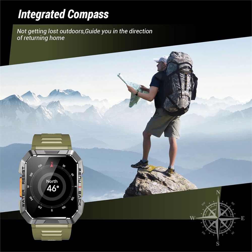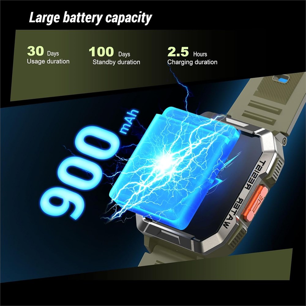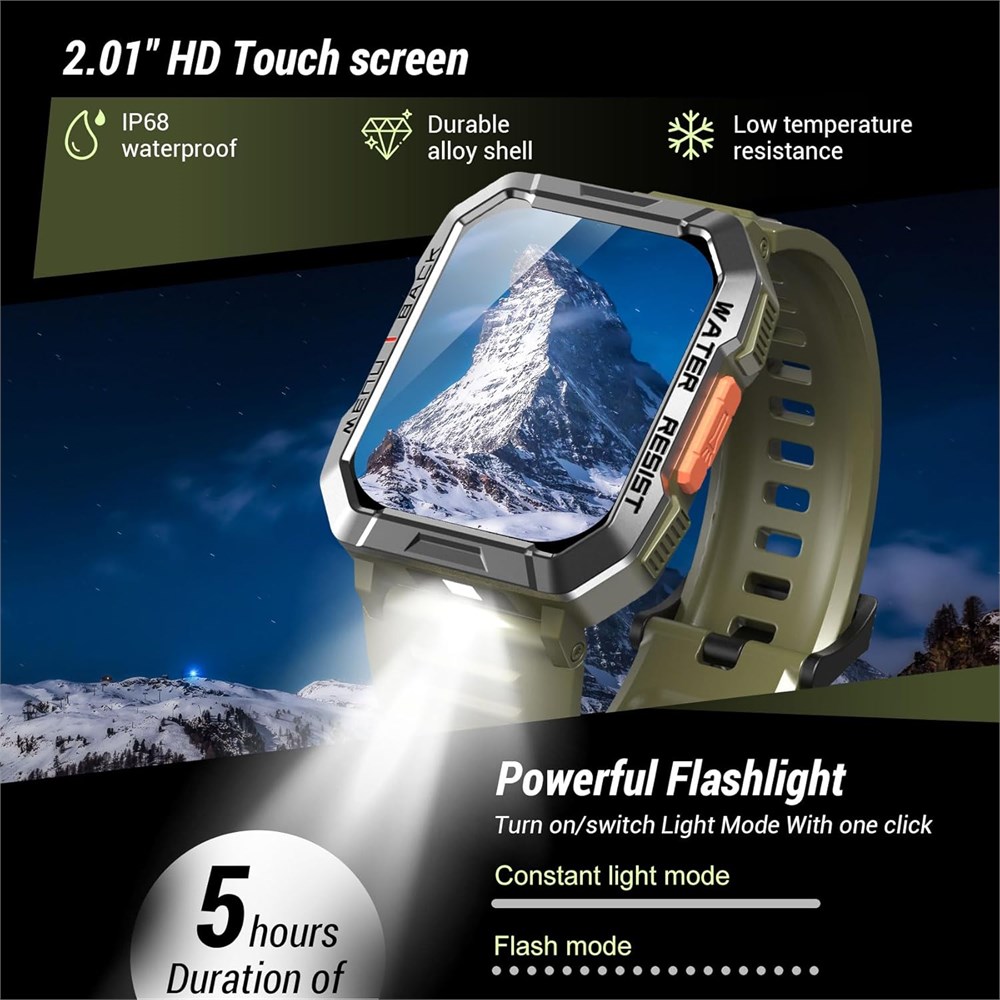 Military Grade Standard - The frame of the military smart watch for men is made from a special aluminum alloy material, and successfully passed 12 military tests. Military-grade Stainless Steel materials make it indestructible and most durable. it not only withstands drops and shocks, making it the perfect companion for outdoor adventures, such as climbing, skiing, crossing deserts, glaciers, or jungles. It also can easily cope with any harsh environment. 100 Day Ultra-Long Life Battery - This smart watch is equipped with a large-capacity polymer high-capacity high-voltage battery with a battery capacity of up to 900mAh, that delivers up to five times the performance and longevity of traditional batteries and minimizes power consumption. Under normal use, the battery life is up to 30 days. In standby mode, can be used continuously for up to 100 days. With our smartwatches for men, you can say goodbye to battery anxiety. LED Flashlight and Compass - The smart watches for men have an LED flashlight( Lighting range up to 6-10m), It can be used on some dim occasions or in emergencies. Equipped with an independent flashlight button, you can switch between constant light and flash mode at will. At the same time, the smartwatch also is equipped with a compass device, magnetically resistant, designed for professional outdoor exercise, it can provide you with accurate orientation in the wild. With these features, You can take on any adventure no matter day or night. This is exactly the companion for the adventure you were looking for! 2.01' Ultra Big Screen and DIY Watch Faces - The 2024 new IOWODO W60 Smart Watch is equipped with a 2.01-inch extra large HD LCD, and a TFT high-resolution color display. Display TP glass is tempered and reinforced, and the surface is anti-fingerprint treated. Watch Built-in 7 watch faces, We also offer you a variety of online dials, connect to the APP to freely download different styles of watch faces in the watch face center and support custom watch faces. You can personalize your watch face by choosing your favorite photos, such as your family, pets, or anything else you like. Bluetooth Calls and AI Voice Assistant - The fitness watch adopts Bluetooth 5.3 technology. Comes with built-in HiFi stereo speakers and a microphone. Once connected to Bluetooth(Compatible with most Android 6.0&iOS 9.0 or above smartphones.), you can receive and make calls. The "GloryFitPro" app can store multiple contacts, ensuring you stay connected with family and friends anytime, anywhere. Receive real-time notifications on the smartwatch for incoming calls or messages (WhatsApp, Facebook, Instagram, etc.). You can also make calls through the voice assistant, and play your desired music. This makes the (For example: while driving) in daily exercise and life more concise and smart. 24/7 Health Monitor - The IOWODO smartwatch has a built-in optical tracking sensor that automatically monitors health levels for heart rate in real-time 24/7, It can also accurately track your personal sleep and detect blood oxygen saturation and stress levels. The app even offers a detailed sleep quality analysis report (light/deep/awake sleep stage), you can view further health data to help you analyze your health status and make appropriate adjustments in good time towards a healthier lifestyle. (*NOTE: This watch cannot be used as a medical diagnostic tool.) 100+ Sports Modes - The fitness watch with more than 100 sports modes, this fitness tracker supports treadmill, walking, outdoor training, running, cycling, climbing, yoga, skiing, football, and more. It precisely tracks your daily data such as steps, time, distance, and calories, and connects to the GPS on your phone to record all your training routes and fitness using the "GloryFitPro" app to further motivate yourself to complete your exercise plan. It's an IP68 waterproof device that can meet your daily needs. (*NOTE: Not for sauna, hot water, swim, diving) More Efficient life and 2 straps - The outdoor sports watches has many built-in functions including smart notifications, music control, camera control, weather forecast, sedentary reminders, alarm clock, stopwatch, timer, etc. Lift your wrist and read all the incoming calls, text messages, and messages sent to the smartwatch screen directly. In addition, equipped with 2 comfortable and skin-friendly wristbands (silicone strap and nylon strap), the length can be adjusted freely. Users with sensitive skin can use the nylon strap, which Directly helps you solve skin sensitivity problems, and Smart watches for men to help you exercise scientifically.