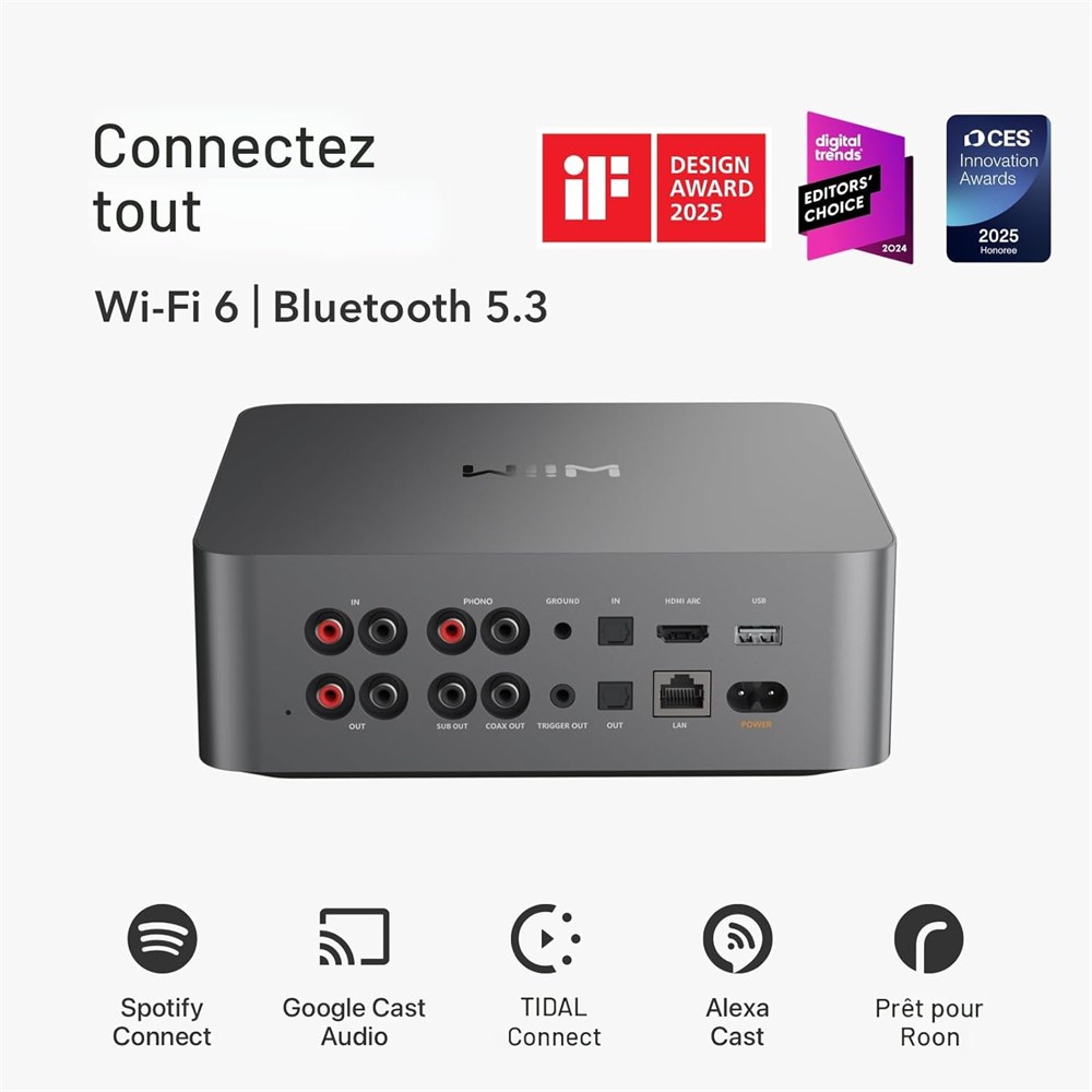 Belle apparence, son superbe : le WiiM Ultra red finit votre exp rience audio avec son design l gant en aluminium et ses composants haut de gamme. Ce streamer de musique tout-en-un dispose d'un DAC ESS ES9038 Q2M, d'un cran tactile vibrant de 3,5 pouces, d'un Wi-Fi 6 de pointe et d'une connectivit Bluetooth 5.3. Con u pour l'excellence, il offre une clart audio exceptionnelle avec un THD+N de -116 dB et un SNR de 121 dB, ce qui en fait un compl ment parfait tout syst me audio. Options de connectivit polyvalentes : le WiiM Ultra offre une int gration audio polyvalente avec son large ventail d'options de connexion. Il dispose d'un port USB, optique, coaxial, RCA, d'une sortie casque d di e ; HDMI ARC et d'entr es pour RCA, phono et optique. Il s'int gre parfaitement aux sources num riques et analogiques, offrant une flexibilit in gal e pour toute configuration audio. La magie du cin ma maison, en toute simplicit : am liorez rapidement votre divertissement avec la sortie HDMI ARC et le caisson de basses WiiM Ultra. Profitez d'un son st r o riche pour les films, les missions et les jeux. Personnalisez votre exp rience sonore avec des param tres d' galisation personnalis s. Ajoutez un caisson de basses aliment pour des basses profondes et cin matographiques. Le WiiM Ultra garantit que votre configuration audio domestique est la fois puissante et simple, apportant une superbe qualit sonore avec un minimum d'effort. Audio multipi ce transparent : cr ez sans effort un syst me audio unifi dans votre maison en utilisant le WiiM Ultra avec les appareils Amazon Echo, Google Home et WiiM existants. G rez facilement la musique en streaming dans tout votre espace avec l'application intuitive WiiM Home : contr lez le volume, synchronisez les haut-parleurs, enregistrez vos morceaux pr f r s, d finissez des alarmes et personnalisez les param tres, le tout partir d'un seul hub central. Son haute r solution fa onn par vous : diffusez de la musique cristalline jusqu' 24 bits/192 kHz partir de plateformes telles que Spotify, Amazon Music, TIDAL, Qobuz ou votre propre biblioth que. Profitez d'une lecture sans espace et d'une qualit sonore sup rieure. Personnalisez votre audio avec une correction de pi ce avanc e et des param tres d' galisation ind pendants adapt s votre espace. Remarque : cet appareil est incompatible avec AirPlay et ne peut pas fonctionner comme un r cepteur AirPlay.