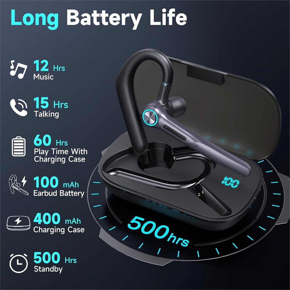 Long Playtime with LED Charging Case --- Headset equipped with a 400mAh charging case and USB C charging cable to make carrying the headset and charge more conveniently. 500Hours super long standby bluetooth headphone.It can be fully charged in single 1.5H for continuously 12h call/music.With the charging case,you can totally get 500hrs standby.With LED display,you can easily know the remain power of the charging case Noise Cancelling Headset with Microphone --- Combined with 2 built-in high-resolution omnidirectional HD microphones and professional bluetooth v5.3 technology,our bluetooth wireless earpiece can blocks out noise easily. Hand-free headset with dual noise cancelling mic allows you can enjoy the high clear call quality of phone calls or music while driving or listening. Bluetooth V5.3 Quick Pairing --- Take out the bluetooth headset from charging case and it will automatically enter pairing mode. Then activate the phone bluetooth function to search and connect. Adapt the V5.1 bluetooth low latency technology, it could provides quickly and stable connection with most iOS/Android smart phones or laptop with bluetooth up to 33 feet away. Mute Call & Handsfree Call --- This wireless earpiece supports voice assistants function. Click the MFB button for 3 times can quickly activate siri/google voice to make hands free calls. You don't need operate on your phone.Voice alerts for low battery, connection status. Press the power button 2 seconds to enter the mute/unmute status during the call, the other party can not hear you under the mute mode. (This function do not support PC). Ergonomic & Confortable Wear Design --- Ergonomic design ultimate comfort eartips are available in 2 different sizes for a perfect fit on each ears. The bluetooth headset designed to fit in either ear with rotates earhook and flip-boom microphone. Either types of ears will not fatigue even after one day wearing.In-ear & earhook design makes the headset more stable.
