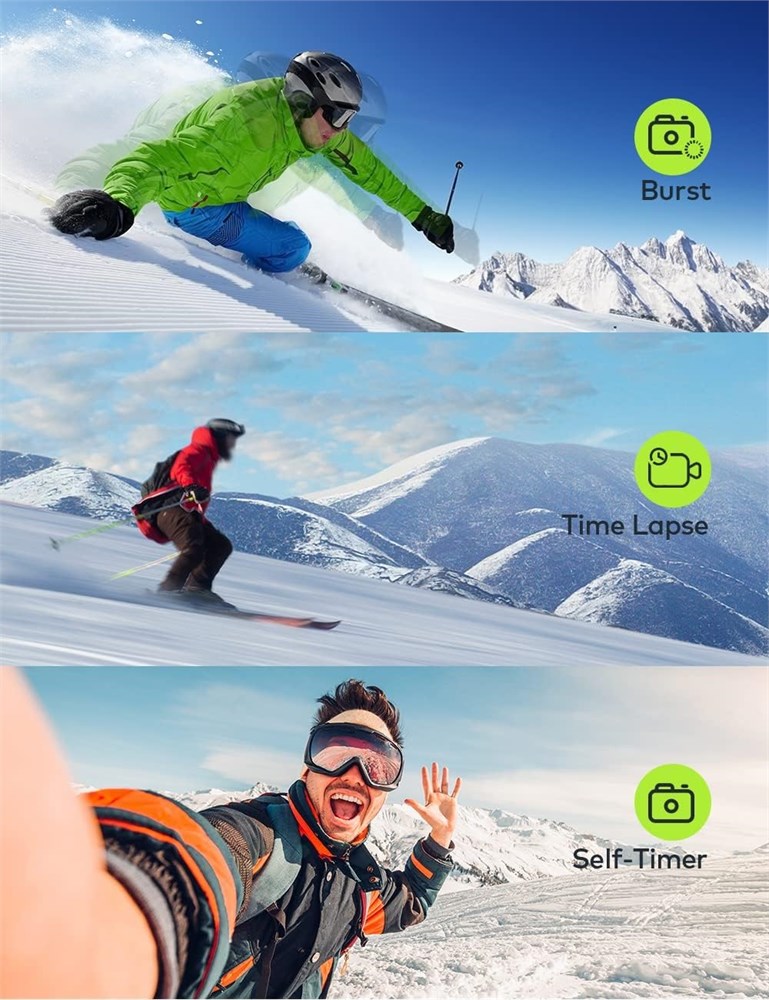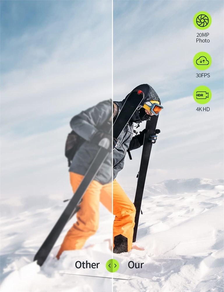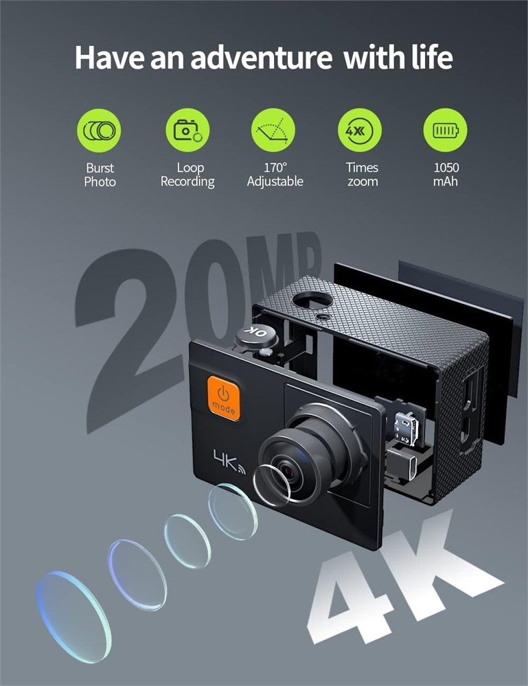 4K/30fps video and 20M image With 4K/30fps video quality and 20MP image definition, this 4K action camera clearly records your fun moments. And it supports SD cards (not included) up to 128GB, larger storage space allows you to take multiple photos and videos at once. Anti-shake gyroscope and 4X zoom: this action camera is equipped with gyroscope technology, which makes it more effective in anti-shake and perfect for capturing fast moving objects or recording high-speed sports. And it can realize image zoom adjustment up to 4X, never missing any small moment in your record. Adjustable and waterproof 40m angle: you can adjust the angle between 170 , 140 , 110 and 70 according to your needs, massively avoiding distortion and fisheye effects caused by a single wide angle. The action camera is equipped with a 40m waterproof case that allows you to record during diving, surfing, swimming, etc. Variety Functions and Wifi Sport Camera . The action camera has a variety of functions including Loop Video, Burst, Time Lapse, Motion Detection, 4Xzoom, etc. And it supports wifi so you can control images and videos on your phone or easily share them with family or friends. The action camera comes with a 40m waterproof case, a handy camera bag and 2 x 1050 mAh batteries. All in one, suitable for sports enthusiasts and action camera beginners.