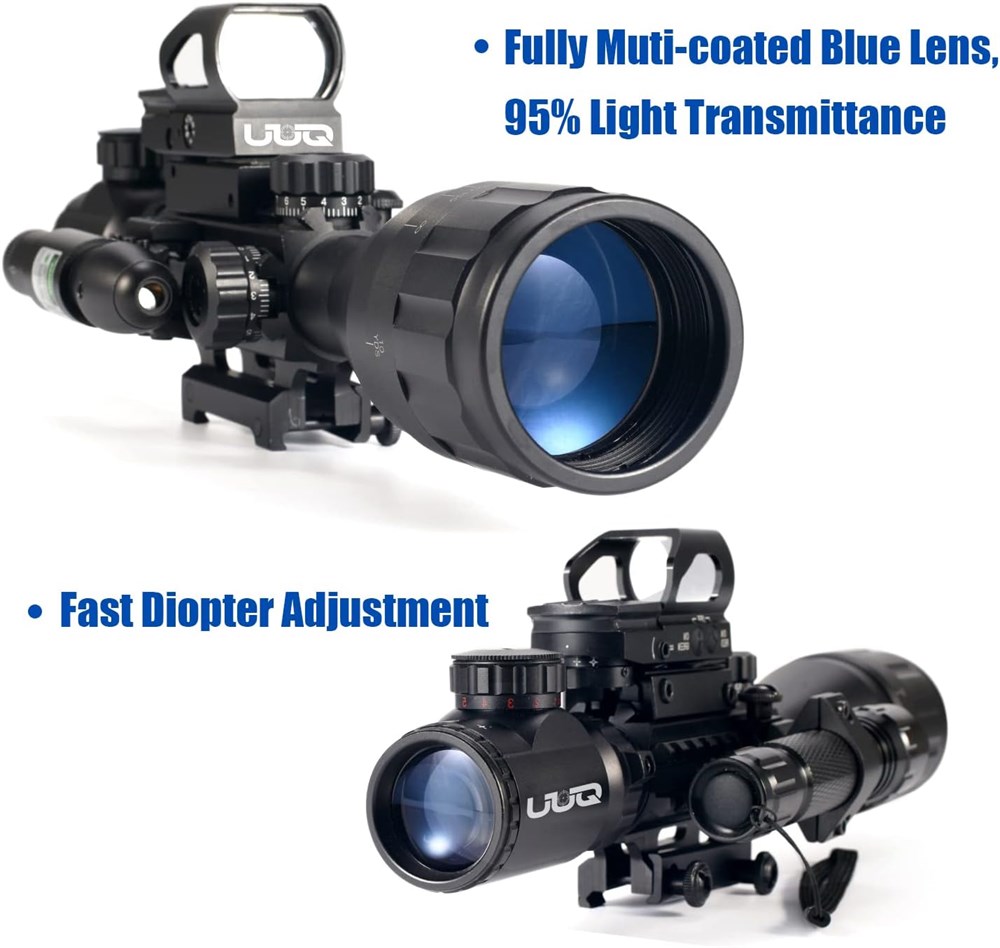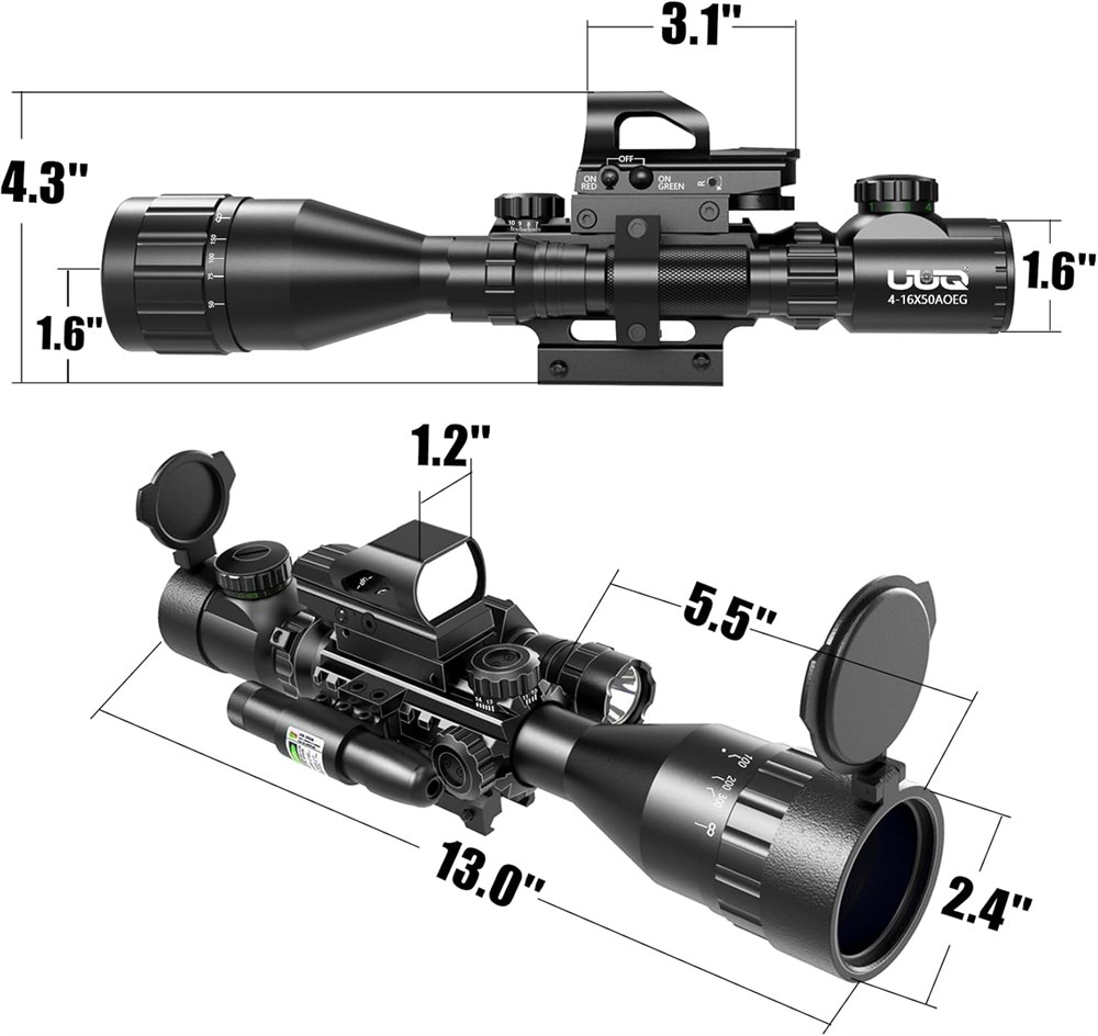 NEW ADD ON: 5 lighting modes LED flashlight (high/ medium/ low/ strobe/ SOS) can satisfy your hunting needs in dark environment. NEW UPGRADE: Adjustable objective with parallax from 15 Yds. to infinity, providing ultra-clear and accurate vision to you. Magnified from 4X up to 16X, range finder reticle with 5 levels R&G illuminations. NEW Control System: Reflex sight uses new electronic button control system for easier setup and operate. Detachable GREEN laser sight, reaching over 300M, can be switched ON/OFF via Rat Tail Remote Pad. Each scope part has universal 20mm mount individually, detachable and fit standard 20mm picatinny or weaver rail. Made of high-strength aluminum alloy. Completely sealed and nitrogen filled makes it 100% fog & water proof; 1000G shockproof test before release.