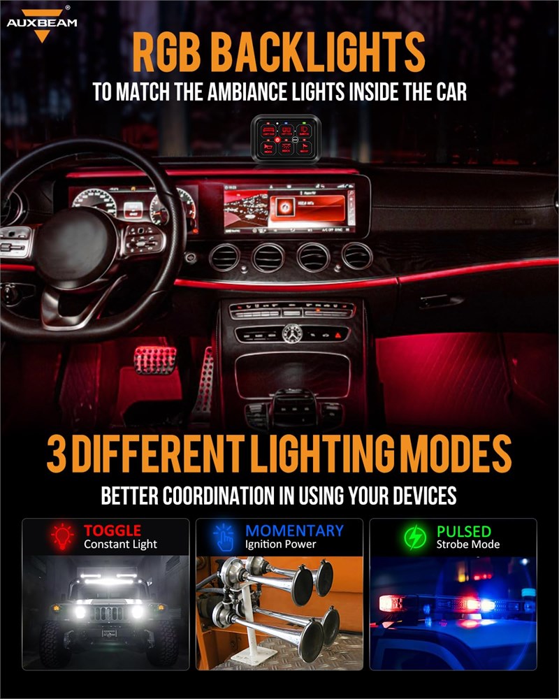 Specifications: This professional 6 gang switch panel is designed for DC 12V~24V accessories, with a power range of 720W~1400W, a working temperature range of -40~221 F, and a maximum current of 60A. Without APP. New Upgrade: Not only enhanced switch performance, but also added RGB functionality and a one-click backlight off feature. The RGB function allows you to adjust the panel display color to better decorate your car. You can also press the "mode" button to turn off the backlight during the daytime. Automatic Dimmable: The backlight will be dimmer or lighter depending on the environment to reduce visual distraction. Multifunction: The Auxbeam 6 gang switch panel has 3 utility functions: Toggle (constant light), Momentary (press and hold to turn on, release to turn off), and Pulsed (strobe mode). The memory function can keep your settings and help you quickly open the devices. Comfortable Control: Choose between an adjustable bracket or double-sided tape to install the panel for a comfortable user experience. Silicone buttons provide good tactile feedback and responsiveness. The aluminum material and sleek design complement your vehicle. The panel measures 3.7' x 2.6' and can be placed in various locations inside the car. Safe Protection: The car switch panel is highly sensitive and stable due to its solid-state relay. It is equipped with a circuit breaker that provides over-voltage protection, reverse polarity protection, over-current protection, and thermal protection. It will automatically disconnect the power supply when the internal temperature is too high. The panel also comes with a waterproof cover for better device protection. Widely Use: It is great to control multiple devices with one switch panel! You can add multiple devices to your car, such as lights, exhaust fans, speakers, stereos, etc. It is widely used in RVs, trucks, sports cars, boats, UTVs, ATVs, and more.