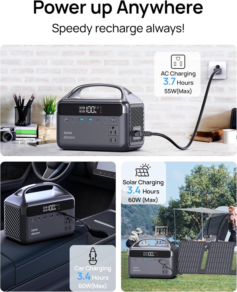 3 Fast Charging Methods: Recharge via AC wall outlet, car charger, or solar panel (11-60V/10A). Solar charging is 50% faster, ideal for off-grid adventures and emergencies. Long-Lasting & Safe Battery: 192Wh LiFePO4 battery with 3,500+ life cycles ensures stable, efficient power for outdoor adventures, emergencies, and daily use. Durable, safe, and reliable. Multiple Charging Options: 300W pure sine wave AC output + 6 ports (2 AC, 1 USB-C, 2 USB-A, 1 DC5521) safely powers laptops, drones, and mini-fridges. Protects devices from unstable power. Ultra-Light & Portable Design: Only 5.5 lbs with a compact design, perfect for camping, RV trips, or home backup. Easy to carry, balancing portability and performance. Smart Safety & Quiet Operation: Built-in BMS with real-time protection (overcharge, short circuit, etc.). Silent, zero-emission operation for offices, bedrooms, or campsites.