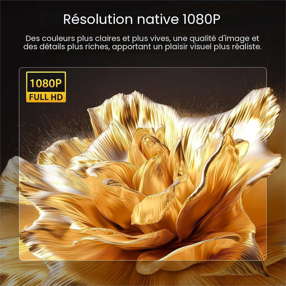 R solution Full HD native 1080p : si vous tes la recherche d'un projecteur de haute qualit avec une image claire de 1920 x 1080, le projecteur HAPPRUN H1 natif 1080p doit tre votre meilleur choix. Vous pouvez profiter de films Full HD et de s ries TV avec des images HD plus nettes, plus lumineuses et plus riches la nuit. Projecteur H1 quip d'une r solution native de 1920 x 1080, d'une excellente luminosit et d'un rapport de contraste dynamique lev de 10 000:1 Fonction Bluetooth 5.1 et haut-parleur st r o HiFi : regarder des films et des vid os avec effet surround de niveau cin ma vous plaira plus, et tout ce dont vous avez besoin est un projecteur Bluetooth 1080p. Connexion sans fil au casque, haut-parleurs, barre de son et autres quipements audio via Bluetooth pour une qualit sonore claire et nette. Ou vous pouvez galement profiter dans votre petite salle de cin ma/chambre coucher avec un mini projecteur haut-parleurs st r o Hi-Fi int gr s. (Ne peut se connecter qu' des appareils audio Bluetooth) Plug & Play, connectez-vous au smartphone : nous savons tous que le WiFi causerait un retard de signal, mais une connexion filaire du t l phone au projecteur HDMI fournirait un signal plus stable. Surtout lorsque vous sortez en voyage ou faites une f te en plein air, il est difficile de trouver le WiFi. Mais vous pourriez toujours avoir un moment facile avec un projecteur de t l phone. Passez un bon moment lors de f tes dans le jardin, d'une soir e cin ma dans le jardin, du camping en plein air et plus encore. Vous le m ritez Taille de projection de 101,6 508 cm pour toutes les pi ces Vous cherchez un mini projecteur portable qui fonctionnerait dans vos chambres ? Vous voulez galement qu'il soit portable pour fonctionner pour une soir e cin ma en plein air ? Alors vous devriez essayer les projecteurs HAPPRUN cran de projection de 40 200 pouces une distance de projection de 2,1 5 m, la maison ou l'ext rieur votre guise. Le projecteur portable prend en charge le placement de bureau/plafond suspendu/tr pied. La correction Keystone 15 et le zoom de 50 % facilitent la configuration et l'obtention de la position de visualisation parfaite. Int rieur et ext rieur en une seule fois Compatible avec TV Stick, divertissement sans fin : un t l viseur qui peut aller jusqu' 200 pouces co te des milliers, mais pas un projecteur TV HD. Le projecteur vid o home cin ma est quip de ports HDMI/USBx2/AV/prise casque 3,5 mm, compatible avec Fire TV Stick, Roku, DVD, ordinateur portable, cl USB, ordinateur, casque, haut-parleur externe, iPhone, Android, Apple iPad, PS5, PS4, etc. Le mini projecteur HAPPRUN est parfait pour le divertissement domicile, le jardin, les jeux, le yoga, la musique et les f tes Contenu : votre prochain t l viseur pourrait tre un projecteur de film, portable pour une utilisation en int rieur et en ext rieur. Avec haut-parleur Bluetooth et TV Stick ou smartphone connect s, un home cin ma est fait n'importe o . Contenu de l'emballage : 1 projecteur natif 1080p, 1 c ble AV, 1 c ble HDMI, 1 t l commande, 1 manuel d'utilisation (vid o d'op ration incluse). HAPPRUN vous garantit une exp rience agr able de 24 mois et un service client de premier ordre. Projecteur HAPPRUN essayer.