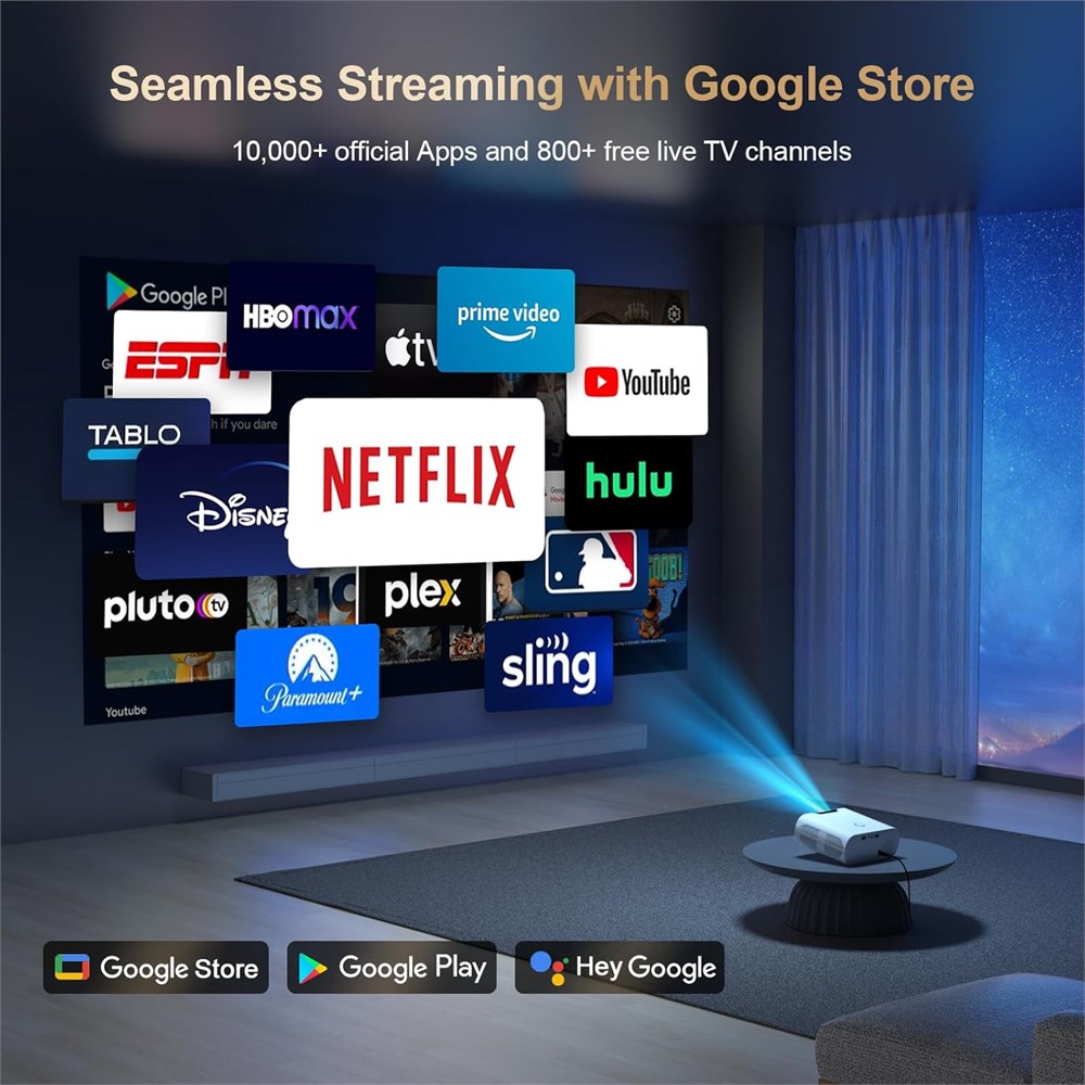 Official Unlimited Streaming Apps---Goiaey C26 mini projector built in official licensed googIe TV system, it can directly access to 10,000 Apps, like NetfIix, Youtube, prime video, etc. No extra streaming devices needed. Navigating apps and streaming content feels effortless. Just download your favorite apps in the GoogIe Play Store . And the on-screen menu is beginner-friendly, which is a huge plus for those new to projectors GoogIe Voice Assistant & GoogIe Cast---With GoogIe Voice Assistant, we could control the smart projector with our voice. Just hold the voice button and give commands like Open NetfIix Play Movies , which is super convenient and saves the hassle of clicking the remote hundreds of times. With GoogIe cast function, it can seamlessly cast the contents on your phone/tablet to our C26 projector with 0ms delay. (All WiFi mirroring may have some lag) 800 ANSI Lumens & Projector 4K Support---For a better movie experience, we advise to use our C26 projector in dark environments even though it still works well in slightly brighter environments. Besides, it offers full HD native 1080P resolution with superb image and vivid clolr. What sets this 4K projector supported is its deep contrast that makes night scenes pop without crushing detail, delivering fast motion smoothly, which brings an immersive stunning home theatre experience to us. WiFi 6 and GoogIe Cast & HDMI ARC and CEC Function---Equipped with Wi-Fi 6 technology, Our C26 wireless projector delivers faster and stronger screen mirroring from our smartphone to the screen. Note:Please go the google play store first, search and download the airplay cast if you wanna to mirroring through your phone or laptop. and you can also watch our instruction video in our product page. In addition, it has the unique HDMI ARC (Connect with external speaker via HDMI cable) and CEC function (One remote control can control multiple devices) while most projectors in the market don t have this function, which can simplify operations and enhance smart home experience. Electric Focus and Auto Vertical Keystone---With just one click on the bluetooth remote, the whole image will become clear. Our C26 small projector avoids the issue which auto focus projector have that the auto focus can t focus the whole image. And with TOF vertical keystone, when we move this video projector in vertical direction within 15 the image instantly corrects itself without interrupting the film. And for larger range correction, we could use the 4P keystone correction in both vertical and horizontal direction. Important Note for Bluetooth Function---Goiaey C26 bluetooth projector offers an unparalleled audio feast with built-in 15W Speakers, delivering rich, immersive sound.You can connect external speakers for enhanced audio output. But please note that bluetooth is only available once you are signed into your GoogIe account. Portability and 3-year Leading Service---With a size of 7.4 x 6.3 x 2.9 inch and a weight of 2.2lb, this portable outdoor movie projector is easy to move from room to room or even outdoors for backyard movie nights. The sleek, modern design fits well in any setting. Be confident of our quality, we offer 1 years free replacement and 2 years free repair for it. We ll reply to any questions within 24 business hours. Bluetooth and Infrared Remote---With a Bluetooth remote, just pair it with Our C26 tv projector, we could control this movie projector in any corner of the room, no need to stand close to projector and point at certain area of this home projector.