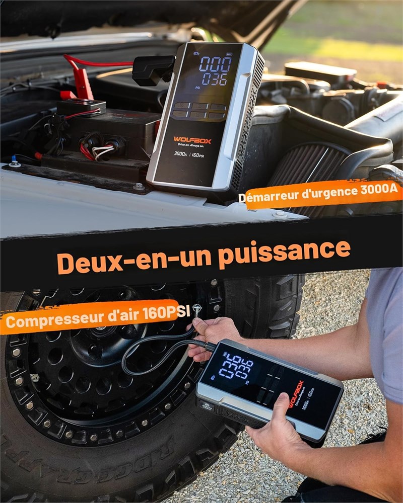 D marreur tout-en-un et pompe gonflable : cet appareil combine un d marreur de saut et un compresseur d'air, conomisant de l'espace et simplifiant l'assistance routi re. C'est une solution conomique, fusionnant deux outils essentiels en une seule unit compacte, de sorte que vous tes toujours pr t sans les tracas de transporter plusieurs appareils D marreur 3000 A pour v hicules 12 V - Ce d marreur de batterie de voiture avec compresseur d'air est quip d'une batterie puissante d'une capacit de 16000 mAh pour les v hicules 12 V tels que les voitures, camions, bateaux et grands v hicules. Il peut r tablir efficacement l'alimentation de la voiture dans les situations d'urgence et prend en charge les voitures essence avec une cylindr e allant jusqu' 8 L et les voitures diesel avec une cylindr e allant jusqu' 6 L Gonfleur avec affichage num rique intelligent - Facile utiliser avec des pr r glages intelligents, d tection de pression et arr t automatique. Turbo augmente jusqu' 45 litres/minute (160 psi) et gonfle jusqu' 45 fois avec une seule charge. Le d marreur portable avec compresseur d'air gonfle les pneus 315/70 R17 36 PSI en 2 minutes et 30 secondes. Grand cran LCD de 3,8 pouces lit la pression des pneus en temps r el, 4 unit s s lectionnables (PSI, bar, kPa, kg/cm ), 5 modes de gonflage (voiture, moto, v lo, basket-ball, et gonflage personnalis , s lectionnez Gonflage personnalis pour gonfler plus de 60 psi, gonfler plus de 60 psi, jusqu' 160 psi), 3 buses diff rentes et tuyau d'air d'extension amovible pour gonfler les voitures, v los, balles et plus Booster et lumi res de 400 lumens : la fonction booster aide d marrer votre v hicule dans des conditions de basse tension, et l'alimentation de la bo te de d marrage est galement quip e d'une lampe de poche LED de 400 lumens qui comprend SOS, stroboscope et feux de route, 3 5 fois plus lumineuse que les autres d marreurs portables pour voiture. En cas d'urgence, il peut fonctionner comme votre appareil d'urgence essentiel Charge rapide de 65 W : avec un port USB-C PD65W, des ports USB-A (12 W/18 W) et une sortie continue de 160 W CC am lior e, il peut tre compl tement charg en une heure et demie. Ce chargeur de batterie de voiture portable peut servir de banque d'alimentation de 16 000 mAh, fournissant de l' nergie aux tablettes, t l phones et autres appareils tout moment Protections IP64 et 10 types : le d marreur de batterie portable avec compresseur d'air, valu IP64 pour la protection, assure la r silience dans les environnements difficiles. l'int rieur, il dispose de 10 caract ristiques de s curit essentielles, y compris la protection contre les tincelles, la protection basse temp rature et la protection contre les hautes temp ratures.