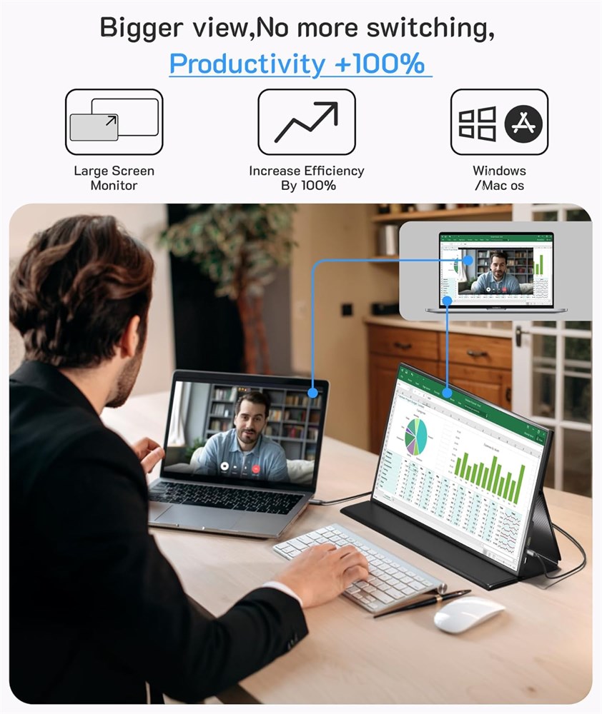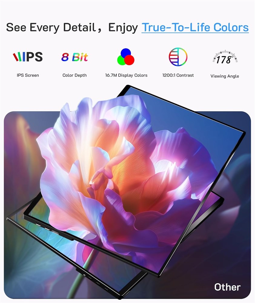 Enhanced Screen Real Estate: Ingnok 18.5" Portable Monitor offers ample space for better visibility and task organization; it's ideal for expanding your workspace, whether managing spreadsheets or editing photos on the go. Vibrant Visuals with Perfect Clarity: Enjoy stunning 1080P resolution with 100% sRGB on the Ingnok Laptop Screen Extender; suit for professionals needing precise color accuracy in detailed work, ensuring your creative projects look exactly as intended. Simple Plug and Play: The Ingnok Monitor Portable offers USB-C and Mini HDMI options for versatile connectivity; easily link your laptop, tablet, or game console for an efficient workspace setup, ensuring hassle-free transitions between different environments. Universal Mount Compatibility: VESA-compatible for easy mounting to stands or arms; customize your setup by adjusting the Ingnok portable monitor to suit your ergonomic needs while efficiently reducing desk clutter. Eye Comfort Technology: The Ingnok Portable Computer Monitor includes blue light reduction tech to reduce eye strain; perfect for long sessions, ensuring comfort and sustained productivity throughout the day.