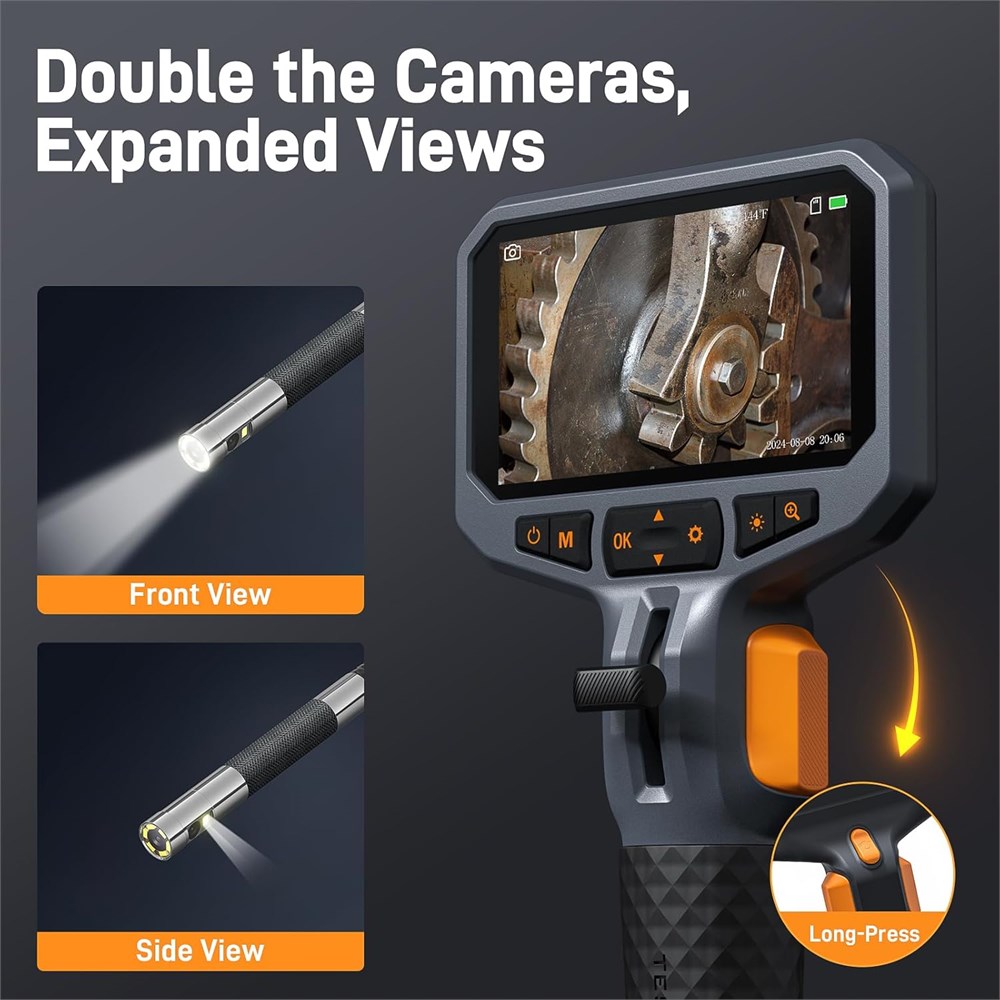Easily Maneuver Your View: Say goodbye to inspection challenges in tight spaces. This two-way articulating borescope, equipped with a flexible probe and dual cameras a front-view and a side-view lens offers comprehensive visibility without repositioning. With crystal-clear feedback, it s perfect for automotive maintenance or household inspections, simplifying your tasks and saving valuable time and effort. See Every Detail in Vivid Clarity: Experience the exceptional image quality of our 4.5-inch IPS LCD color screen, delivering sharp, high-resolution visuals. Whether you re in bright sunlight or dim conditions, this display ensures you won t miss a thing. Plus, with no app required, it's ready to go whenever you are! Master the Most Challenging Inspections: Equipped with a 5FT semi-rigid gooseneck cable, this borescope provides the ideal combination of flexibility and stability, allowing you to navigate tight, intricate spaces with ease. The cable retains its shape as you guide it, giving you precise control for thorough inspections. Designed for versatility, it adapts effortlessly to various environments, ensuring no detail goes unnoticed. Light Up the Darkest Corners: Equipped with built-in high-brightness LED lights on the camera probe, you ll have the visibility you need even in the darkest environments. The adjustable illumination allows you to customize the brightness for every inspection, ensuring that no detail goes unnoticed in tight or confined spaces. Ergonomics Meet Efficiency: This borescope is thoughtfully designed for maximum comfort and usability. The centrally located articulating joystick allows for effortless one-handed operation with either hand. A multifunction button, positioned at the back near the index finger, doubles as both the photo and lens-switch button, enabling seamless camera switching or photo and video capture during inspections. Lightweight and compact, this borescope ensures prolonged use without fatigue, perfect for on-the-go inspections.