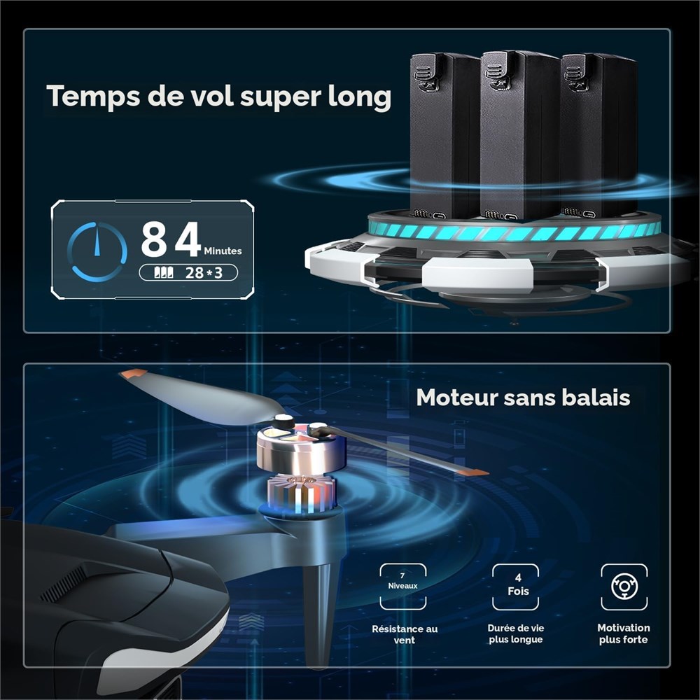 Drones WiFi longue port e avec cam ra HD 4K CHUBORY A77, moteur sans balais de 807,7 m/84 minutes, survol automatique et suivi Port e de 800 cm : volez 10 fois plus loin que les drones de base, d bloquant la libert cr ative. Endurance du moteur sans balais : moteurs r sistants au vent + 84 minutes de temps de vol total (3 batteries) pour une action sans arr t. Plus de 15 modes de vol intelligents : suivez-moi/vol de trajectoire/selfie gestuel automatisez les prises de vue sans effort. Cam ra a rienne 130 4K : objectif inclinable r glable (90 ) filme des perspectives immersives sous n'importe quel angle. Enregistrement sans FAAA : < 249 g + design pliable + tui = parfait compagnon de voyage.
