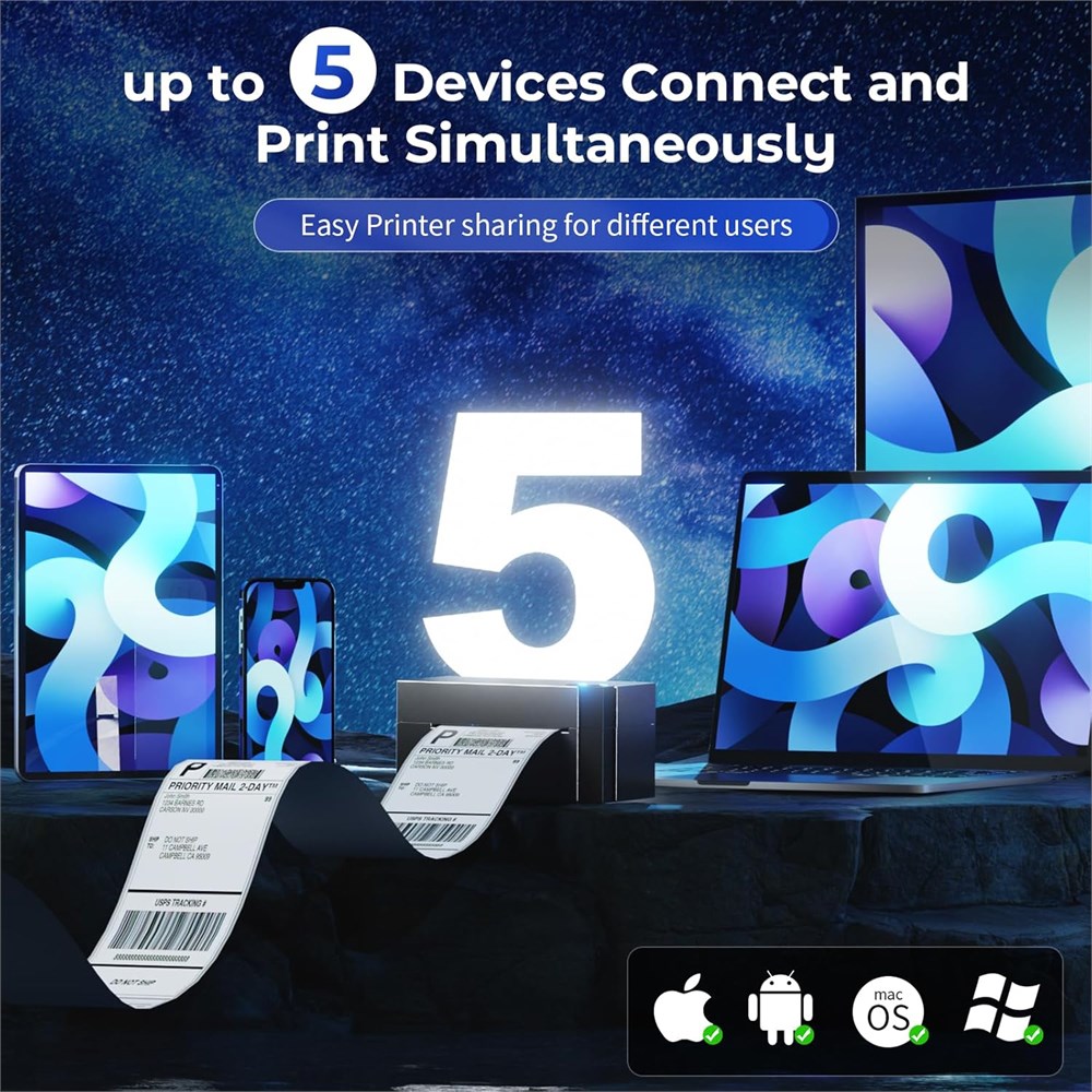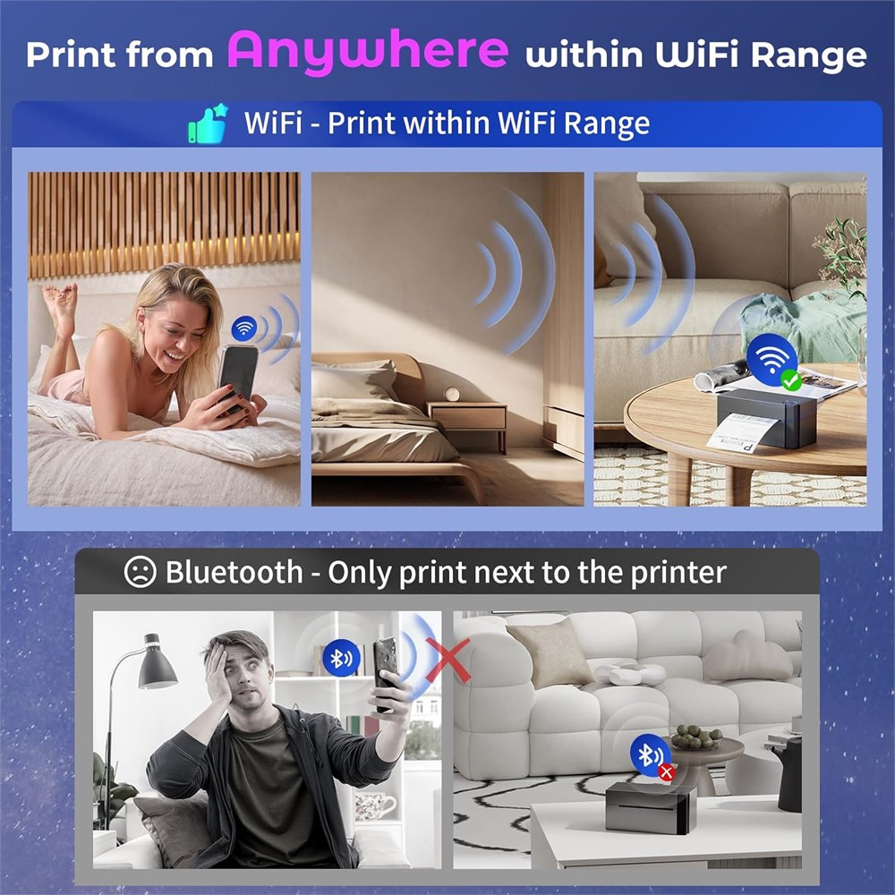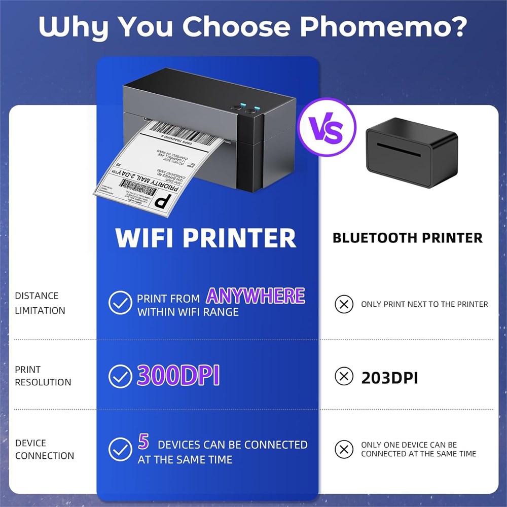 Phomemo Upgraded Wi-Fi Label Printer: Wireless printing with the Phomemo Upgraded WiFi shipping label printer! This advanced thermal label printer boasts seamless WiFi connectivity compatible with Android/iOS, Mac/Windows, Linux, and Chrome OS. Get rid of the tangled cables and embrace the convenience of true wireless printing. Besides, if you prefer a USB connection, this label printer for small business also offers USB connectivity, supporting all computer systems, even compatible with Google devices Ultra-fast and Stable 5GHz Wi-Fi: This 344-WF shipping label printer is equipped with a superior 5GHz Wi-Fi connection, surpassing the 2.4GHz and Bluetooth label printers in terms of speed and stability. Besides, this WiFi label printer allows for printing flexibility within the WiFi range and supports simultaneous connections from up to 5 devices. Even with 5 devices using the printer at once, the 344-WF WiFi thermal label printer also maintains a stable and fast network connection and prints out labels Versatile Compatibility and Applications: This desktop label printers can support the width of 1 - 4.6 inches labels, helps you print shipping labels, logo labels, thanks labels, address labels and more. Print online without going to the post office Morever, you can enjoy per-designed label templates, created for retail store and crafting businesses to help make products stand out. As a result, this WiFi thermal printer compatible with all major sales platforms including eBay, Shopify, Amazon, Etsy, Poshmark, UPS, USPS, FedEx, ShipStation, DHL, Shippo. Save time and effort by avoiding trips to the post office 300DPI Printing for Superior Clarity: Thanks to this thermal shipping label printer's high-resolution 300 DPI printhead, printed labels are clearer and easier to read and scan! No more worrying about problems caused by unclear printing. In addition, With enhanced thermal printing technology, label printer 4x6 can produce labels at a pace of 100mm/s, averaging up to 72 sheets of 4"x 6" labels per minute. Undoubtedly, This wireless label printer is an invaluable helper for your small business, significantly reducing the time spent on label printing and enhancing overall operational efficiency.