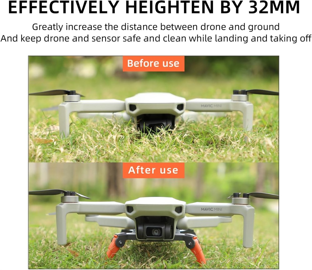 Effective Height Protection: the mini 4k landing gear can be effectively increased by about 32mm/1.3inch, greatly increasing the distance between the fuselage and the ground, and effectively preventing ground debris from damaging or contaminating the fuselage, sensors, etc. during use. take off and land, and allow landing and take off on grass or other rough surfaces, protect the bottom of the drone and the gimbal camera. Unique Spider Landing Feet Design: the landing gear for dji mini 4k drone has this domineering spider shape and unique design style, which can make your drone very cool and add visual beauty. Ultra-light Weight: it is an ultra-light landing gear at only 0.073 lbs, ensuring smooth flight as usual. no extra burden. precise mold opening, tailor-made, firmly lock the body and install it securely without affecting bottom of the fuselage the sensors, power button, indicator lights etc. Foldable Mini 4k Landing Leg: precision ratchet structure, ingenious, and the details show the quality; the foldable design improves the portable of the landing gear and reduces the space occupied by the landing gear. portable storage,easy to store in a drone suitcase or bag when disassembled and folded after each flight, let you travel easily and enjoy a good leisure time. Applicable Models: for dji mini 4k accessories, for dji mavic mini/ mini 2/ mini se/ mini 2 se users, please confirm carefully before purchasing.