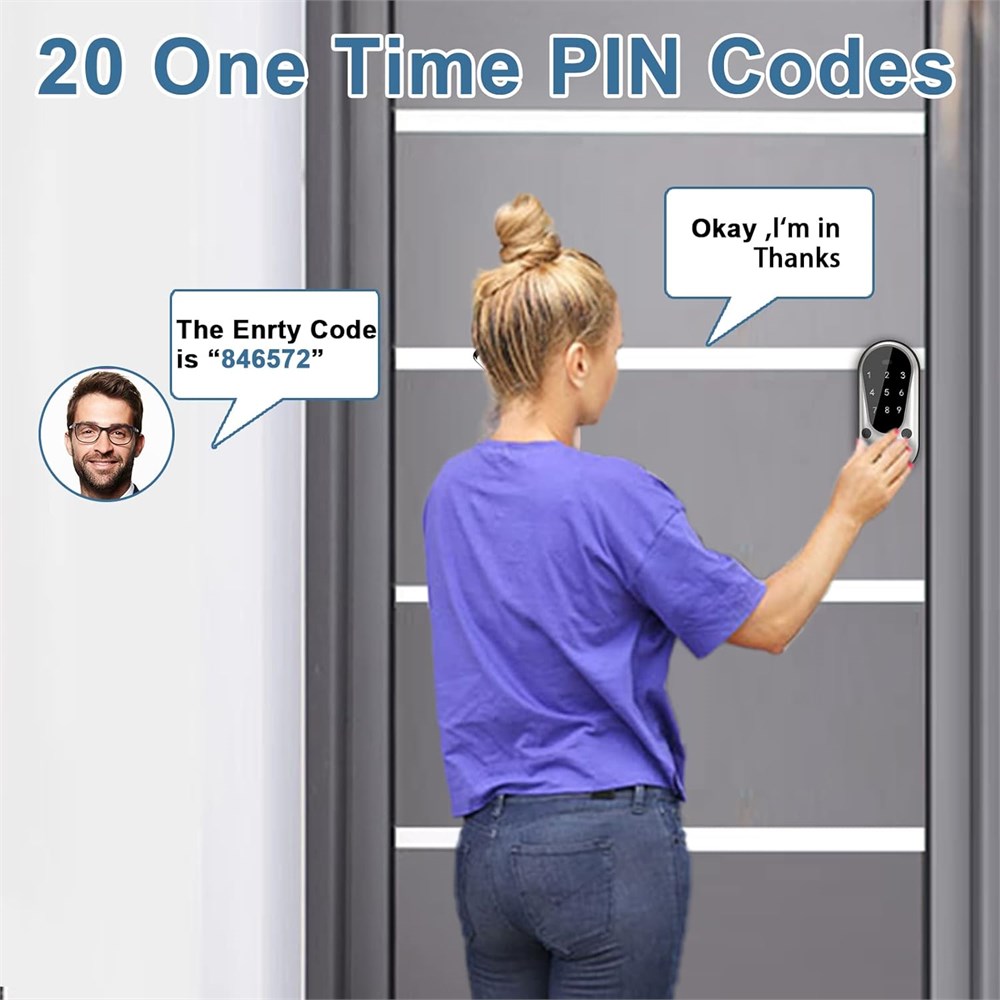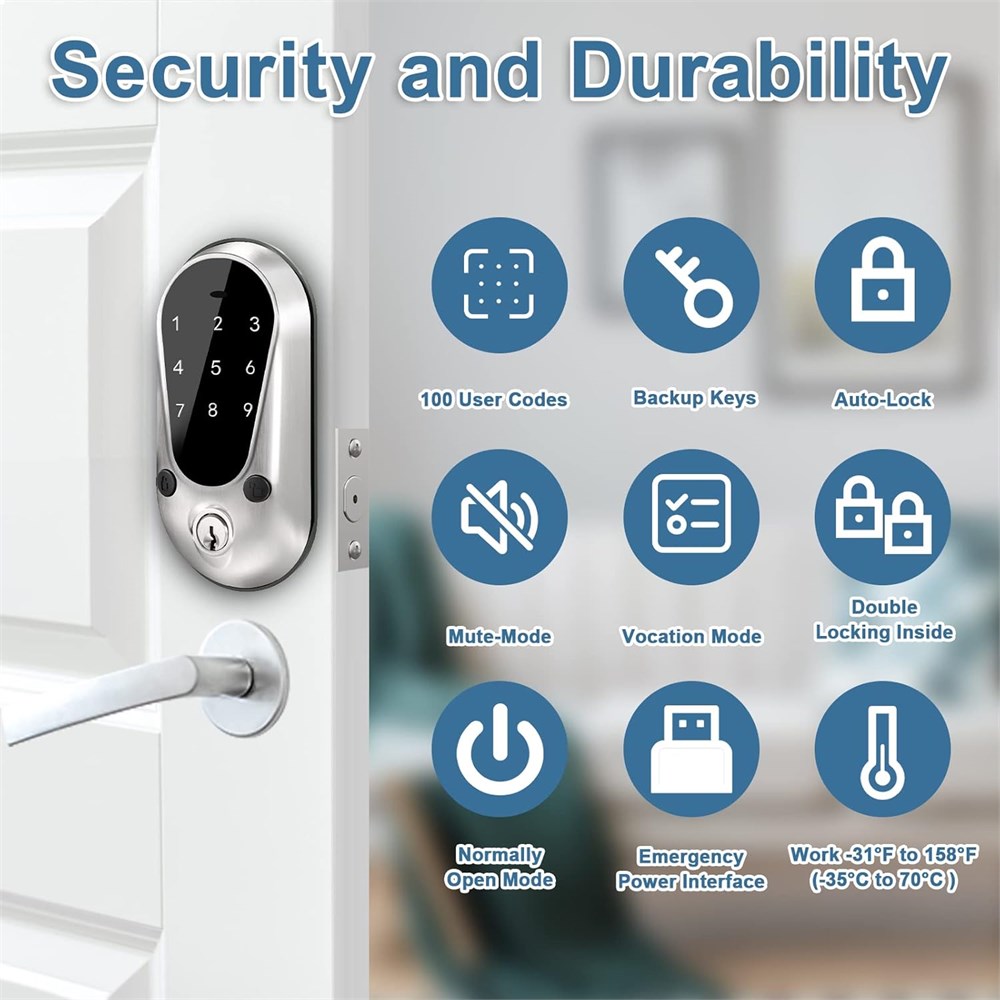 Password Entry This touchscreen lock provides 100 user codes for family use and 2 spare brass mechanical keys. Security Deadbolt ANSI Grade 3 standard, qualified life test, zinc front panel, solid brass cylinder. Protection to your home. Multifunction Passcode anti-peeping, low battery indicator, Emergency power interface, mute mode, vocation mode, normally open mode, auto locking, locking inside mode. Easy Installation For men or women, just with a screwdriver, you can install and program easily by yourself. It's powered by 4 AA batteries, with patent adjustable latch in 2.36"(60mm) to 2.76"(70mm), suitable for the door thicknesses from 1.3"(33mm) to 2"(50mm) and the hole diameter in 2.13" (54mm).