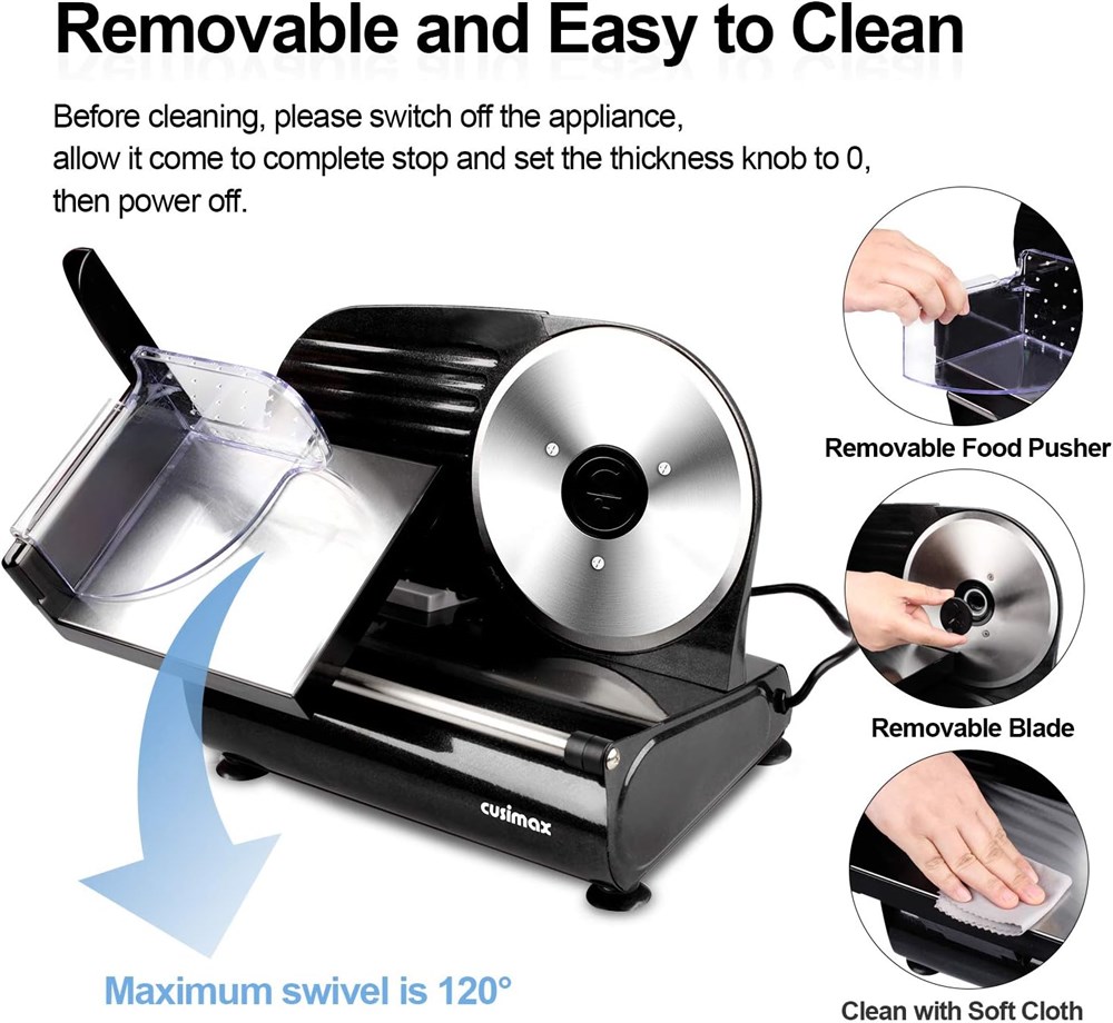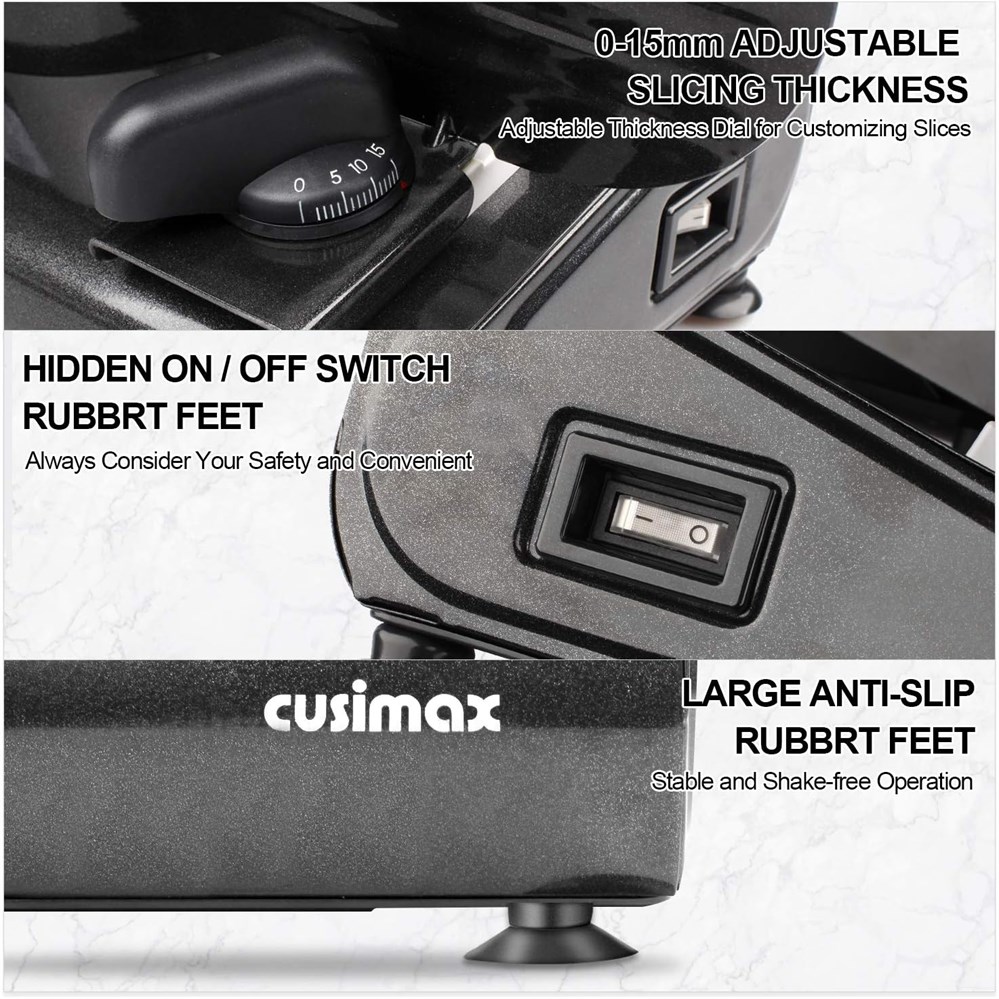 Easy Clean & Safe - CUSIMAX meat slicer never worry about how to clean up the food hidden in it. Hidden track design and removable blade make it easy to clean the food slicer machine. Sturdy non-slip feet, blade safety guard and food pusher ensure that the food slicer will stay in place so you can keep a firm grip while operating Advanced Design - We adopt the most advanced bearing and belt drive structure for blade processing. The slicer operation does not require lubricant. Compared with gear drives, it's more durable and easier to maintain and operate. It helps manage your work in the kitchen to be easier and more efficient Upgraded Workmanship - We understand that blade of the slicer is one of the core components, so we have upgraded 7.5 inch stainless steel 420 cutting blade by exquisite craftsmanship, which can help you to cut food in an orderly manner and evenly without getting stuck Different Thickness - Precise adjustable thickness from super thin to approximately 3/4 thick for slicing various of food. Powerful 200 watt AC motor and stainless steel blade make it easy to slice beef jerky, ham, deli sandwiches, charcuterie boards, cold cuts, hard cheeses, fruit, vegetable and bread, sliced fruits for dehydrating, party platters, appetizers and more Get Yours Now, Risk-Free - CUSIMAX offer a outstanding 30-day hassle-free policy & 18-month promise. We assure you that no other food slicer beats our products' high-caliber quality & efficiency. All CUSIMAX products are covered by Product Liability Insurance of the United States. Please refer to the instruction manual for more information.