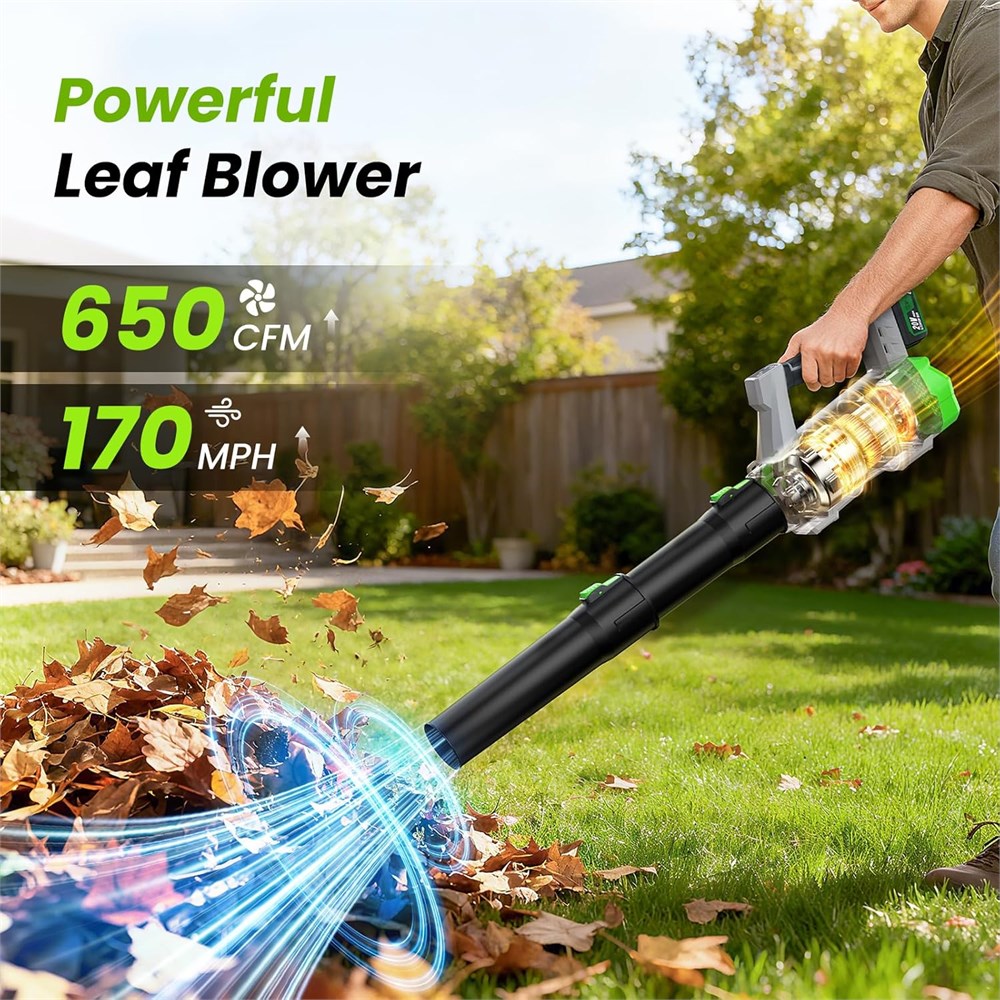 650CFM & 170MPH Powerful Turbo Blower The cordless leaf blower offers 650 CFM airflow and 170 MPH air speed and 5 adjustable wind speed settings, enabling it to efficiently complete different types of cleaning tasks, such as dealing with dust, leaves, pebbles,snow, etc. 23000 RPM Upgraded Powerful Motors The upgraded motor is more stable and durable than normal motors, and it deliver stronger power. Battery leaf blower with its advanced turbo-boosting technology. With a maximum wind speed reaching 170 mph and an impressive 23,000 RPM, this cordless electric leaf blower effortlessly tackles even the most stubborn debris. It easily clears leaves, dirt, and other accumulations from yards, lawns, and all other outdoor spaces. 4000mAh Long Endurance battery The battery leaf blower is equipped with a new-generation 4000mAh battery, featuring short-circuit protection, overheat protection, and overcharge protection.Its usage duration is 20 to 50 minutes, and the runtime varies at different wind speeds. Note: The indicator light is red during charging and turns green when fully charged. For a better user experience, please fully charge the battery before the first use. Double Tube Design & Easy assembly This electric leaf blower features a dual-tube design, allowing the two tubes to be easily extended or used individually. It is easy to assemble and use simply attach the battery and tube to get started. The cordless design avoid the hassle of wires, making it suitable for various daily scenarios. Lightweight Design Featuring an lightweight design, it minimizes arm fatigue during use, and comes with an adjustable shoulder strap for added comfort, making it effortless to handle for extended periods.