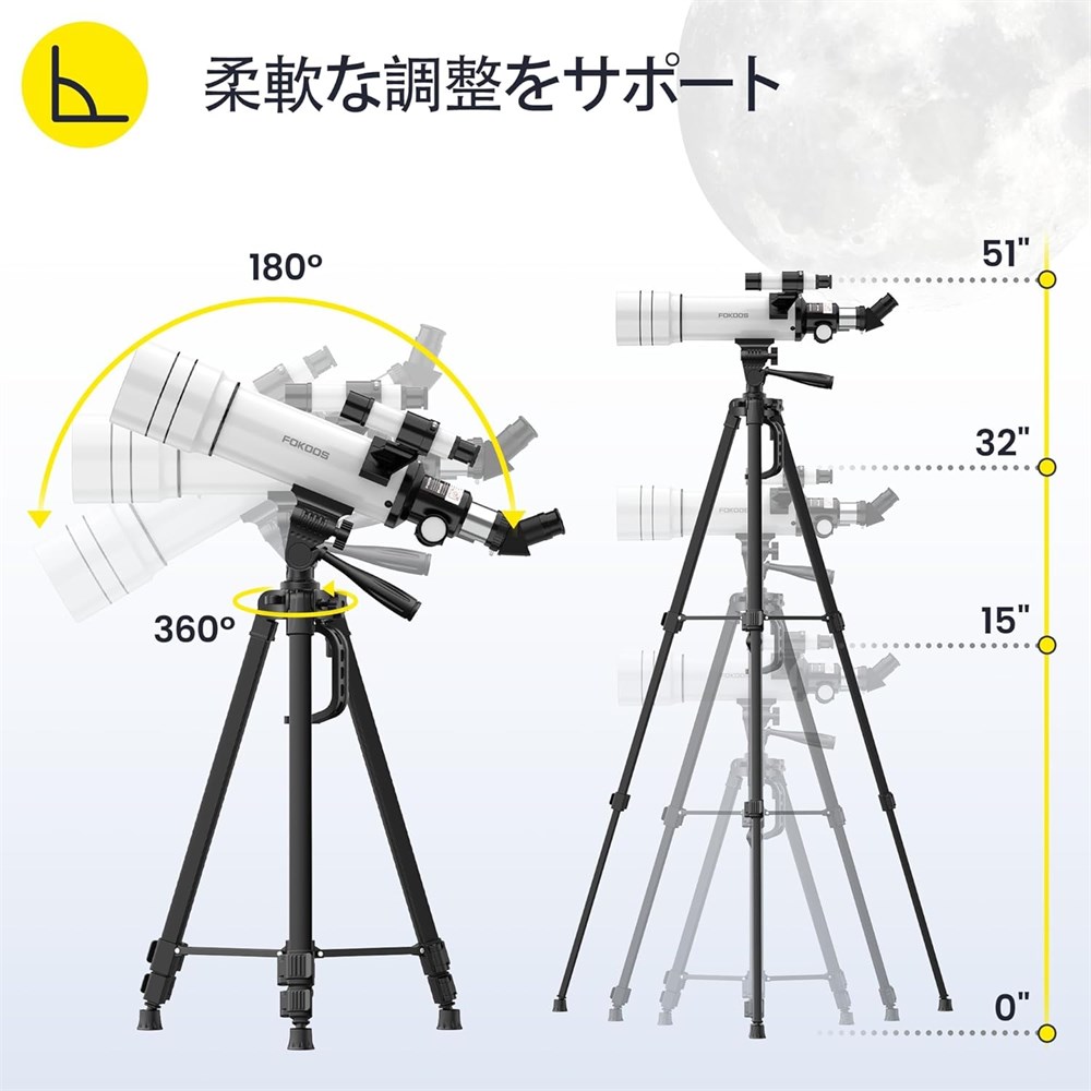 70mm Aperture 400mm Focal Length: The Telescope boasts a substantial 70mm aperture and multi-layer optically coated lenses, capturing more light to deliver vivid and clear images for both nature sceneries and the vast expanse of outer space. It s a great telescope for adults and astronomy beginners. 5x24 Finderscope And Diversified Eyepiece Group: The Telescope for adult is equipped with a high-magnification 5x24 Finderscope and a versatile eyepiece group (H6mm/F12mm/H20mm) complemented by a 5X Barlow Lens. This combination offers a broad range of magnifications (20X-333X), meeting your diverse observational needs. Extensive Auxiliary Accessories: Our Telescope for adults & astronomy beginners is equipped with a stable aluminium tripod with handle for easy position adjustment, three adjustable heights (19"-32"-54") perfect for users of different ages, with phone adaptor you could record any beautiful moment with our telescope. Easy To Install And Use: A detailed installation guide and online video streamline installation and field-of-view adjustments, making your telescope experience hassle-free. Best Gift For Fun & Interest: Not only suitable for adults, we also hope that the FT10 Telescope could help inspire kids to explore the unknown universe and discover more beauties in daily life.