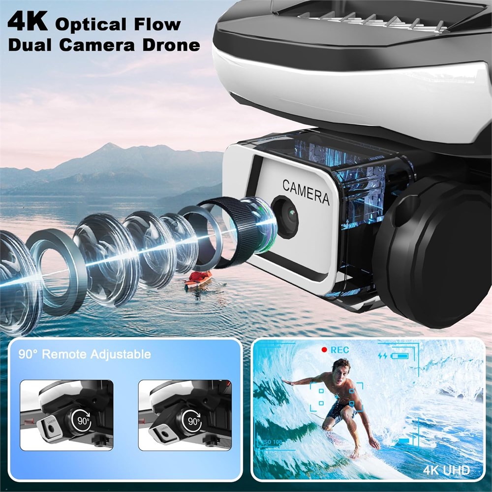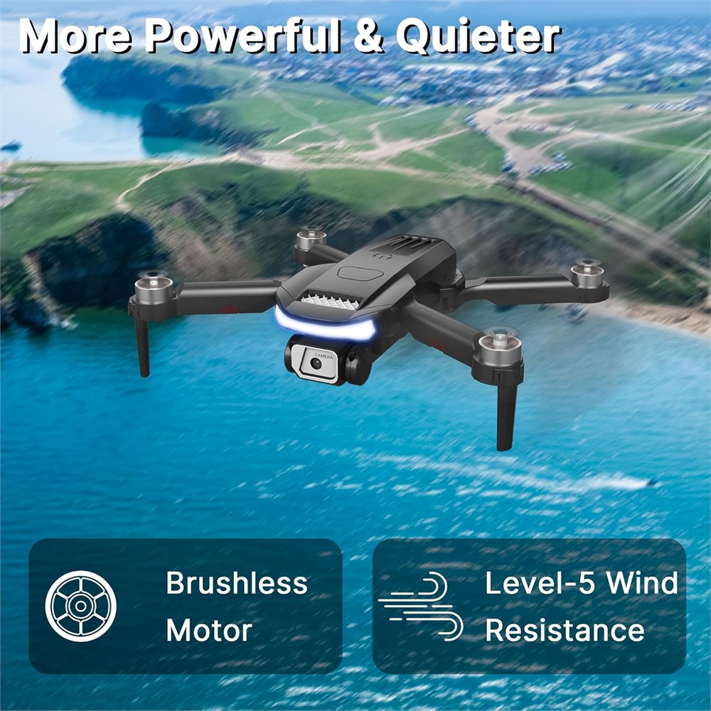 Strong Brushless Motors: Durable alloy brushless motors feature strong wind resistance, providing faster, quieter, and more powerful flight. Equipped with 2 upgraded batteries, it can provide up to 28 minutes flight time, let your drone traveling in the sky freely. Strong Brushless Motors: Durable alloy brushless motors feature strong wind resistance, providing faster, quieter, and more powerful flight. Equipped with 2 upgraded batteries, it can provide up to 28 minutes flight time, let your drone traveling in the sky freely. HD Adjustable Camera: Equipped with a 4K HD camera that can be adjusted within 90 by your remote control or the app, dual cameras can give you an exciting experience of aerial scenery , and assist you to catch every wonderful moment from a birds-eye perspective. HD Adjustable Camera: Equipped with a 4K HD camera that can be adjusted within 90 by your remote control or the app, dual cameras can give you an exciting experience of aerial scenery , and assist you to catch every wonderful moment from a birds-eye perspective. Extra Spare Fan Blades and Storage Bag: The package includes a carrying case, making it convenient for outdoor travel. the casing and exterior burnish have been strengthened to eliminate the plastic feel. It is equipped with a controller, propeller guard, and spare fan blades, making it an excellent choice for gifts.