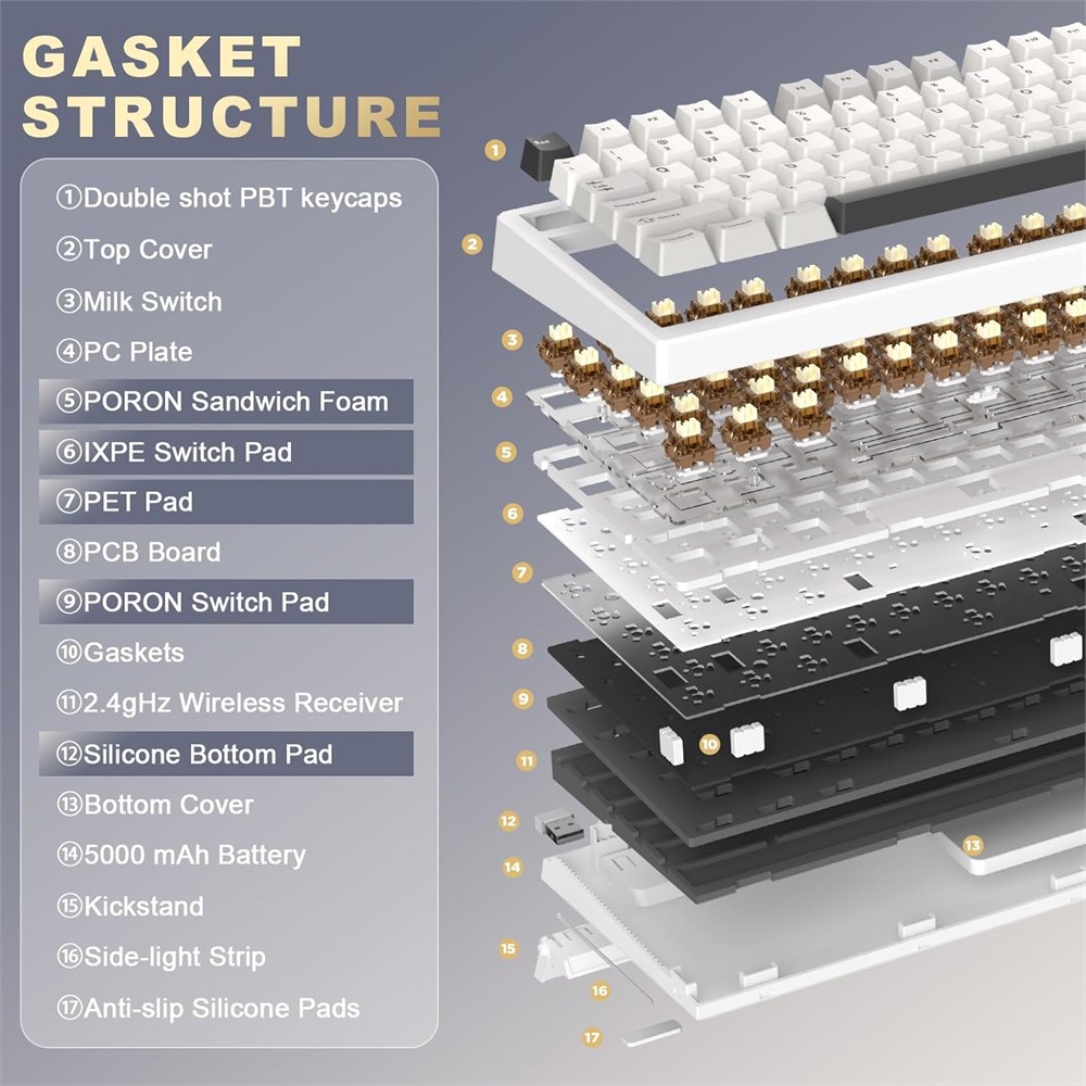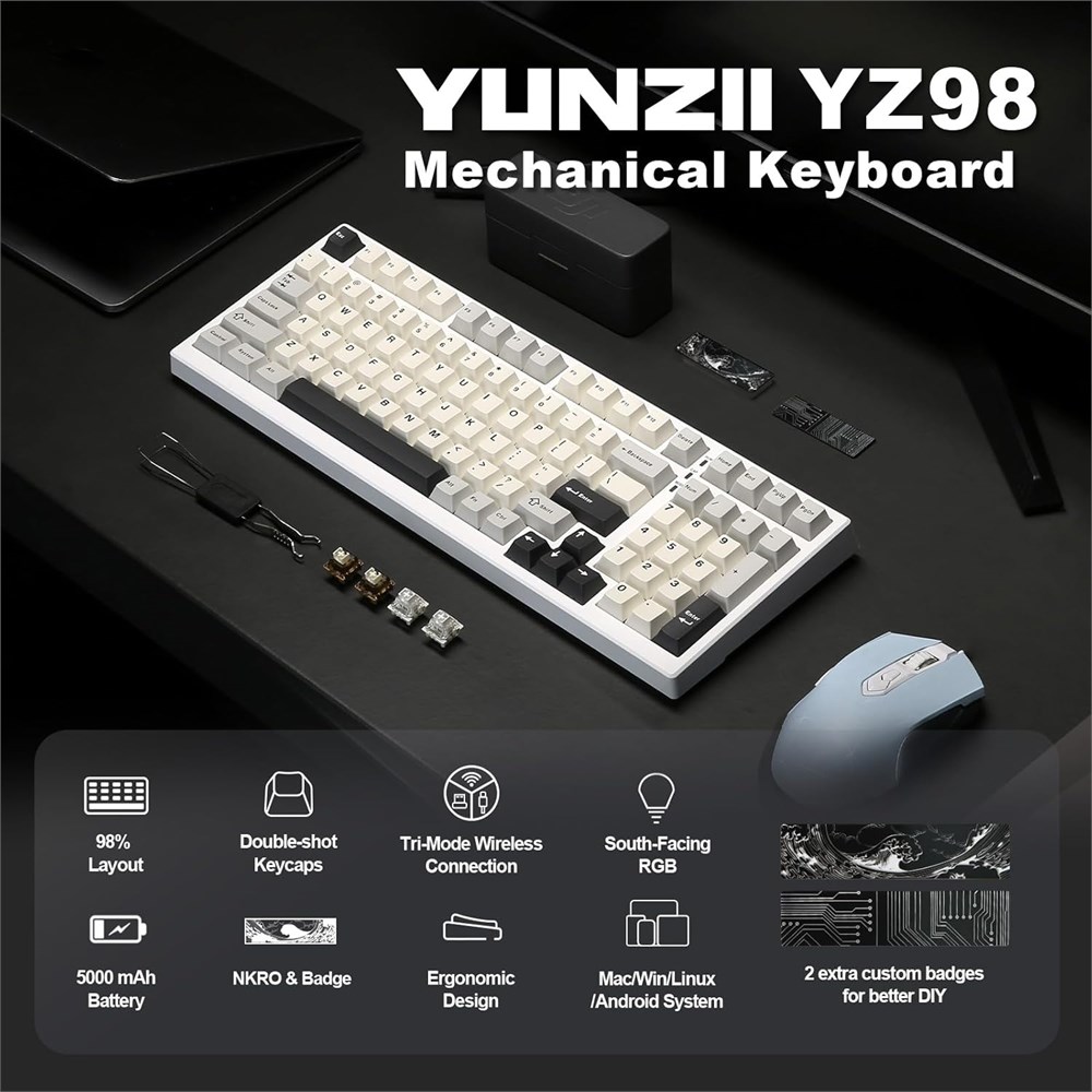 Tri-mode Wireless Connectivity &Multi-Device Connection: YUNZII YZ98 wireless mechanical keyboard built-in 5000mAh large-capacity battery to provide more power and longer battery life. including BT5.0, 2.4GHz wireless mode, and USB wired mode. Compatible with Laptop, iPad, IOS, Windows, Mac or Android. No fussy connection process, the wireless connection is quick and stable. The fast 2.4gHz wireless mode has the polling rate of 1000hz Hot-swappable Custom Keyboard & NKRO: As a customizable keyboard, YZ98 mechanical keyboards build in a hot swappable PCB that support both 3 or 5 pins mechanical switches. You can freely change the keycaps and switches according to your needs and enjoy the fun of DIY keyboard. All keys with full n-key rollover, which provides a faster response and a better keystroke feeling. It's great for gaming and office South-facing RGB with Music Rhythm RGB Effects : To maintain premium RGB backlights on your desk space,YZ98 has up to 8 Colors, 16 Modes RGB Backlight effects .16.8 million colors, adjustable brightness and speeds. All the RGB and keys can be customized with the software. The acrylic metal badges bring more fun and aesthetics to YZ98 Gaming Keyboard 99 keys 98% Layout Gasket Keyboard with 5-Layer Sound Filling: This computer keyboard adopts gasket structure, which provides a consistent, softer, and more comfortable typing feel and pleasing acoustic feedback. Equipped with PC plate, PORON sandwich pad, IXPE switch pad, PET sound absorbing pad, slot PCB board, PORON switch pad, and silicone button pad, the mechanical keyboard reduces hollow sound and fatigue, it is an ideal keyboard for long-term gaming keyboard use and gamers Double-shot PBT Keycaps &Ergonomic Design: Double-shot PBT keycaps make this keyboard more durable with premium, clear and do not fade.Ergonomic keyboard with cherry profile keycaps and tri-stage foot support allows you to adjust the angle of the keyboard according to your personal preference, providing a more comfortable typing experience.