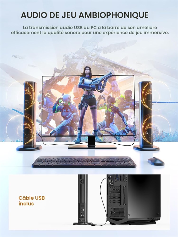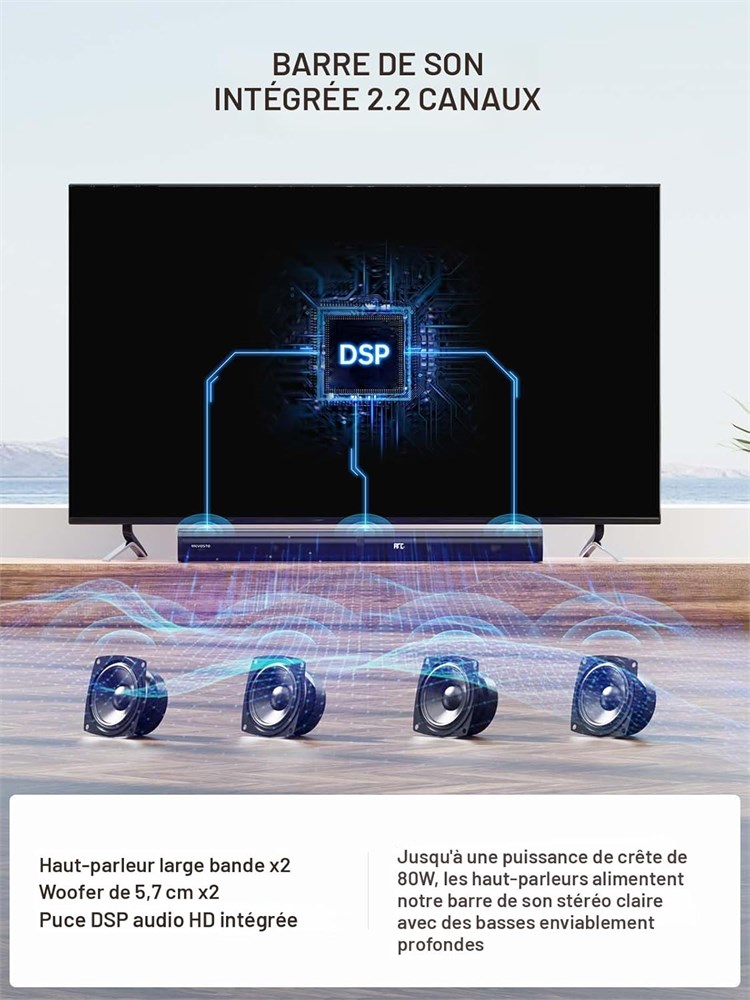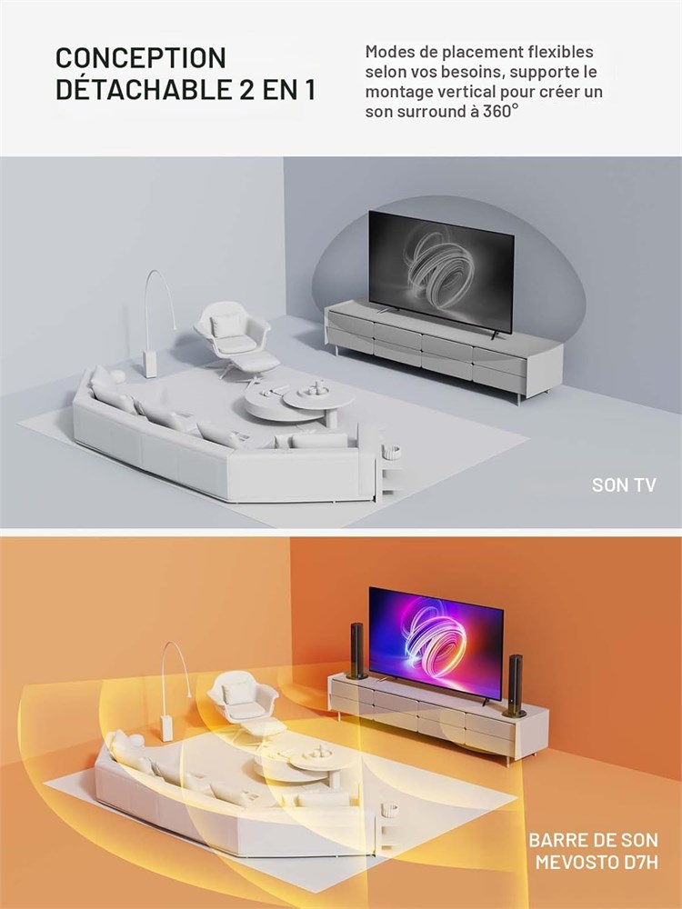 D couvrez la mise niveau 2025 : les haut-parleurs rectangulaires am lior s maximisent la profondeur du son, r duisant la distorsion et am liorant la clart . La compatibilit am lior e se connecte facilement avec les ordinateurs et les consoles via USB, transformant votre espace en un v ritable home cin ma ou un hub de jeu 2.2 canaux avec des chambres sonores ind pendantes pour une r verb ration puissante. Design amovible peu encombrant : avec son design fin et s parable, la barre de son MEVOSTO prend en charge plusieurs m thodes d'installation (tout-en-un/division verticale/placement horizontal/montage mural), et est le compl ment parfait toute configuration home cin ma. Une mise niveau audio de la t l vision : dites adieu au son plat de 2.0 CH, les haut-parleurs pleine gamme x2 et les doubles caissons de basses int gr s dans la barre de son MEVOSTO 2.2CH offrent un son coh rent et une clart brillante, apportent des basses plus profondes, et le volume maximum peut atteindre 102 dB. Une seule barre apporte tout le son. Connexion filaire et sans fil : via un c ble HD-ARC de qualit sup rieure, vous pouvez facilement vous connecter votre t l viseur et passer l'audio avanc , galement compatible optique/AUX/BT 5.0/USB (cl USB et c ble USB pris en charge). Con ue pour correspondre votre t l viseur Le profil bas et le design l gant de la barre de son D7H MEVESTO ne masquent pas votre vue et peuvent tre facilement mont es au mur (dimensions : 80,5 x 8,9 x 7,1 cm). L' cran LED prend en charge l'extinction automatique sans op ration manuelle, de sorte que vous pouvez profiter d'une image r aliste avec un son authentique lors d'une soir e cin ma. Son personnalis : fournit 3 modes d' galisation classiques : film/musique/actualit s au choix, les aigus et les basses sont r glables pour fournir un son dynamique aux audiophiles en accordant le volume sonore entre -5 et +5 (55 Hz 20 kHz). Poss de votre propre pr f rence sonore Veuillez noter que la barre de son MEVESTO D7H ne prend pas en charge le son Dolby DTS. Veuillez noter que les parties gauche et droite de la barre de son doivent tre connect es par des c bles audio, que ce soit en mode int gr ou s par .