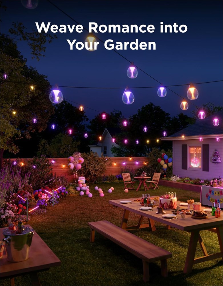 Extensive Color Options: Govee outdoor string lights offers 16 million color options and 111 preset scene modes. Decorate your patio with colorful accents or set vibrant lighting for romantic evenings and lively parties. Built to Last: These string lights for outside ensures IP67 waterproof protection, with led bulbs made with high-impact resistant PC material to prevent cracking and shattering, offering a long lifespan of up to 25,000 hours. Please Note: This product does not support extension or splicing. Bright Warm White: With a total brightness of 2400 lm, these patio lights are dimmable for outdoor focused illumination. Bright and warm lighting creates a cozy and romantic atmosphere for any outdoor space. Elegant Transparent Design: With a unique teardrop-shaped design and the transparent casing, these string lights blends seamlessly with the surroundings, reducing visual clutter and maintaining an elegant look. Music Sync: Turns your patio into a lively dance floor as the lights react to your favorite songs through the built-in mic, bringing them to life with stunning, dynamic lighting effects. AI-Powered Lighting Effects: Simply share your ideas or chat with the AI bot to create custom lighting effects effortlessly. Tips: Please upgrade the Govee Home APP to the latest version to connect and use the product. Smart Control: Connect the product to Alexa and Google Assistant for the convenience of voice control. Matter compatibility ensures a more seamless, flexible, and secure smart home experience. Exquisite Outdoor Decor: A fascinating display of colors will appear on the smart LED Bulbs, which elevates your outdoor decoration aesthetic and suitable for anniversary gift. Caution: The power adapter should be placed indoors or connected into a socket with an IP65 protective enclosure.