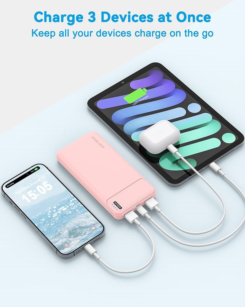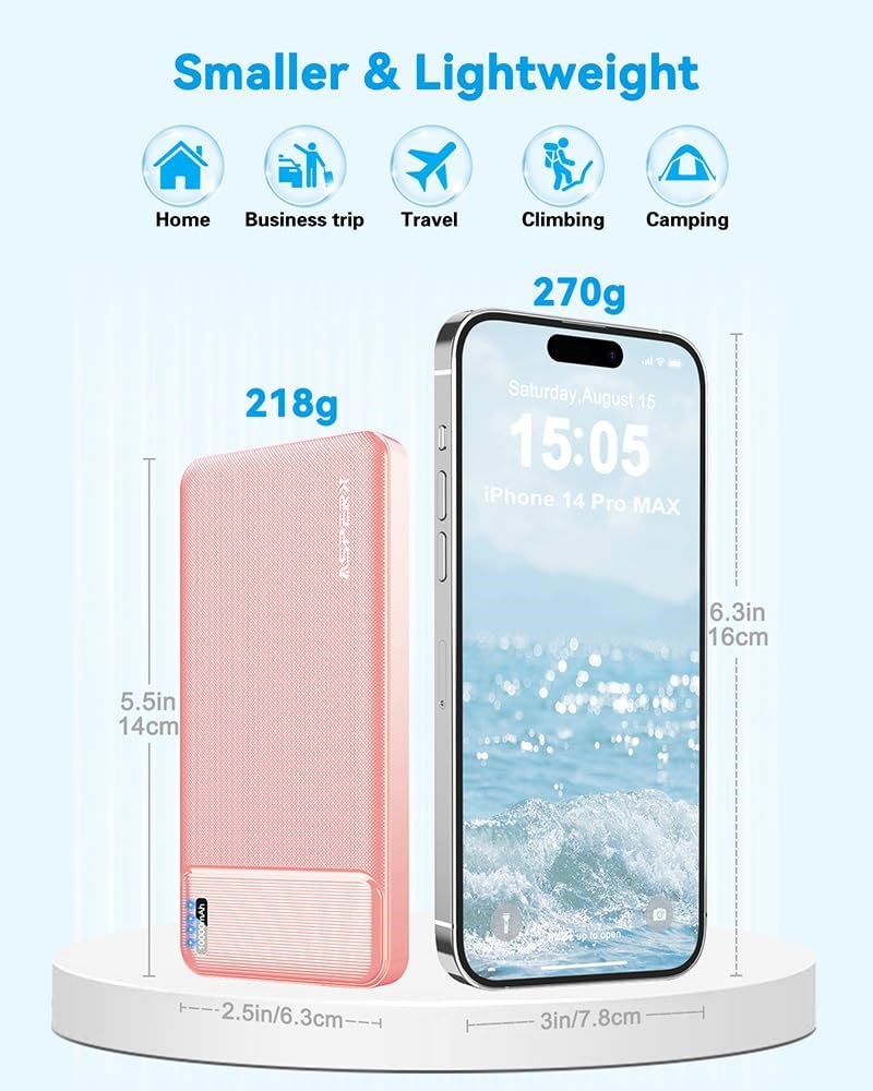 10000mAh Power Bank Pack of 2 Never run out of battery again! Our 2-pack USB Power Bank has a total capacity of 20000mAh, and compatible with almost all USB-rechargeable devices. You can stay connected all day long! Charge THREE Devices Simultaneously Our battery pack power banks come with one USB-C output and two USB outputs, boasting 2.4A outputs that are faster than 2.0 outputs. you can charge up to three devices simultaneously. The triple-port design allows you to share a portable power pack with your family and friends USB C Input & Output Our upgraded portable battery charger has a USB C In & Out port that perfectly fits all your newer iPhones, iPads, and upcoming USB-C devices. It also has two USB-A output ports that recognize all connected devices and distribute load up to 5V 2.4A effectively. This USB C portable charger can work with not only all phones and tablets, but also smaller devices such as AirPods, Bluetooth headphones, fitness trackers, and smartwatches Safe Travels The outer shell of the ASPERX battery pack power bank is made with safe and NON-Flammable materials. The high-quality Li-ion battery included in the USB battery bank helps charge it safely and prevents over-voltage, over-charging, over-current, and short circuits, among other things. It won't become too hot or put a lot of strain on your phone's battery. These phone charger battery pack portables are also airline-approved for safe travels Super Slim Our compact and portable power bank is just the size of a mobile phone. At only 0.5 inches thick and weighing only 218 g, this external battery power bank can slide easily into your pocket or bag. It's lightweight and compact, making it essential for business, travel, hiking, and camping Package Contents The package includes 2* USB C power banks, 2* USB A to C charging cables, and 1* user manual. Note 1. Please use an adapter or charging cable with a power lower than 5V*2A to charge the mobile power bank, and avoid using the USB port of a computer to charge the USB battery pack. 2. If you don't use it frequently, please charge it at least once a month. 3. In order to protect the health of the mobile phone battery, when the mobile phone is charged to 80%, the power bank will activate the trickle mode to slowly charge the mobile phone. 4. The data cable we provide is USB A to C. If you need to charge for iphones, please configure the corresponding data cable yourself.