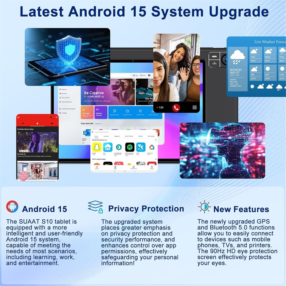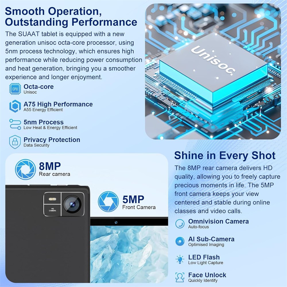 ANDROID 15 + OCTA-CORE: The S10 tablet runs on Android 15 and is powered by a 2.0 GHz octa-core processor, boosted by integrated Gemini AI for personalized support with complex tasks. SUAAT tablet offers performance and privacy for faster launches and seamless operation across all apps 30GB + 128GB + GMS: With 30GB of RAM (8GB + 22GB virtual) and 128GB of ROM (expand to 1TB), you ll have plenty of space for photos, videos, and files. Android tablet is GMS certified, giving you seamless access to all your favorite apps.The built-in Parental Controls allow you to manage your children's content, set screen time limits 10.1 HD EYE-CARE DISPLY + WIDEVINE L1: This 10.1-inch tablet delivers vibrant visuals on its screen, featuring 1280x800 resolution, 350 nits of brightness, and an 85% screen-to-body ratio. Widevine L1 certification enables HD 1080p streaming on popular platforms for a premium viewing experience 8000mAh BATTERY + 5G Wi-Fi + BT 5.0: Stay unplugged longer with an 8000mAh battery that significantly reduces charging frequency. Encased in a slim metal body weighing only 1.1 lbs, the SUAAT tablet is highly portable. Equipped with GPS, 5G Wi-Fi, and Blue/tooth 5.0, it is ideal for travel, navigation, home use, and more DUAL CAMERAS: Capture sharp selfies and clear video calls with the 5MP front-facing camera. The 8MP rear camera is equipped with smart features, allowing you to easily translate text and identify objects around you. Additionally, enjoy the convenience and security of facial recognition for quick and easy device unlocking DUAL SPEAKERS + FM RADIO: Android tablets immerse you in rich audio with dual speakers. The AI noise cancellation technology significantly reduces background noise for clearer calls, videos, and gaming. Simply plug in your headphones to access the built-in FM radio and enjoy your favorite stations on the go.