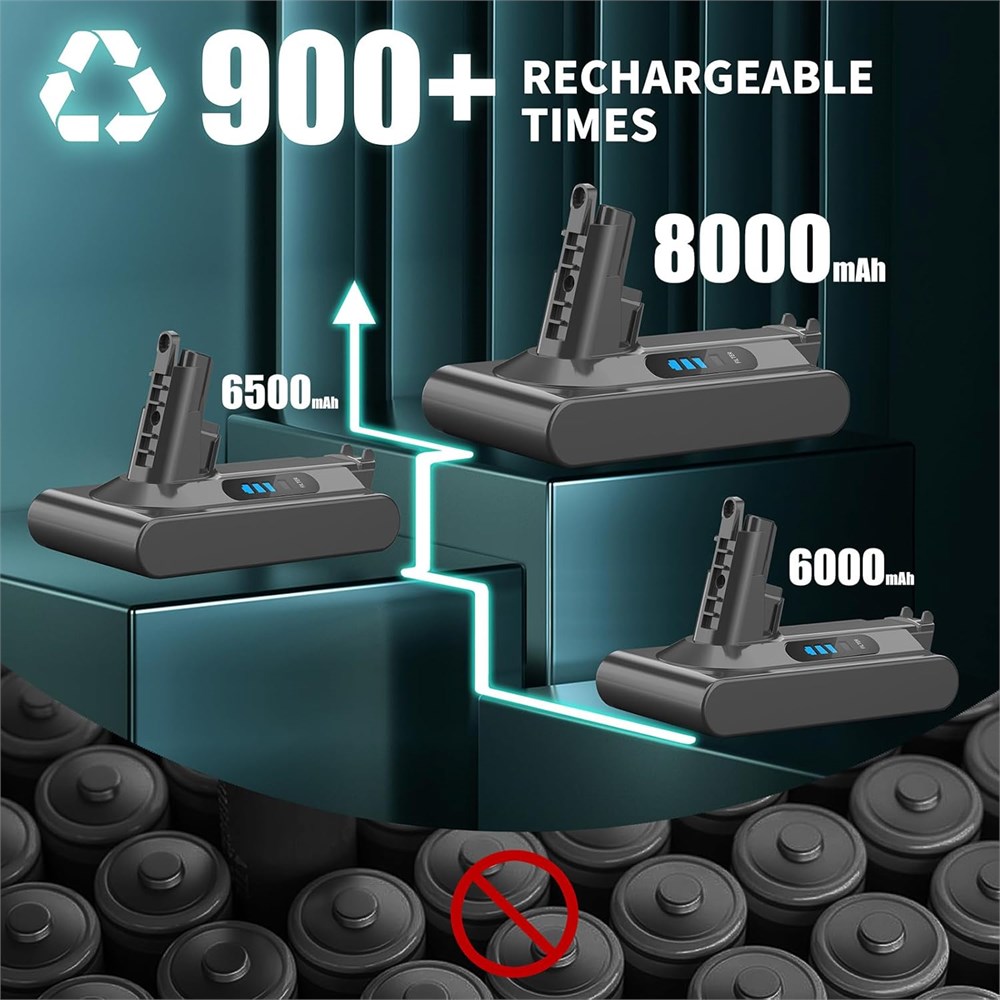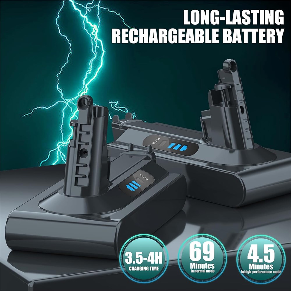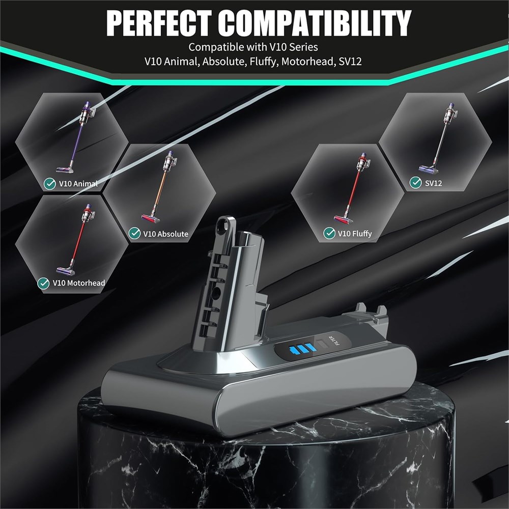 Perfectly Compatible The V10 battery is designed for Cyclone V10 Animal,V10 Absolute, V10 Motorhead,V10 Fluffy, SV12 cordless vacuum and the V10 wall charger.(NOT FOR SV10) 6500mAh High-Capacity V10 Battery Pack Rechargeable Our V10 battery replacement is long lasting and durable, each V10 battery replacement can reach 900+ charge life, Long battery life for V10 series make you save the cost of batteries and the amount of waste going into the landfill. More Safety SV12 battery replacement built in intelligent chip. Say goodbye to worries about overcharging, over-current, over-voltage, and short circuits.. It provides 4 minutes and 30 seconds for use in high-performance mode and about 69 minutes for use in normal mode. But it only takes 3.5-4 hours to charge. Meet the needs of battery enthusiasts for SV12 battery replacement. LED Indicator There are LED indicators on both sides of the cyclone V10 battery replacement. When the battery is less than 100%, two blue lights light up and the other blue light flashes slowly. When charging overcurrent, the red light flashes quickly, which matches the V10 original charger very well.(Note: Please cool down the battery before charging) Non-slip The cyclone v10 battery replacement is equipped with a non-slip strip. The non-slip strip can play a good anti-skid effect when the vacuum cleaner is leaned against the wall and prevent the vacuum cleaner from falling down. Quality Assurance It has multiple safety test certification standards of FCC ROHS and CE. The package of this V10 rechargeable battery includes: 1 x 6500mAh V10 rechargeable battery , 2 x Post-filter, 1 x Screwdriver and 3 x screws.