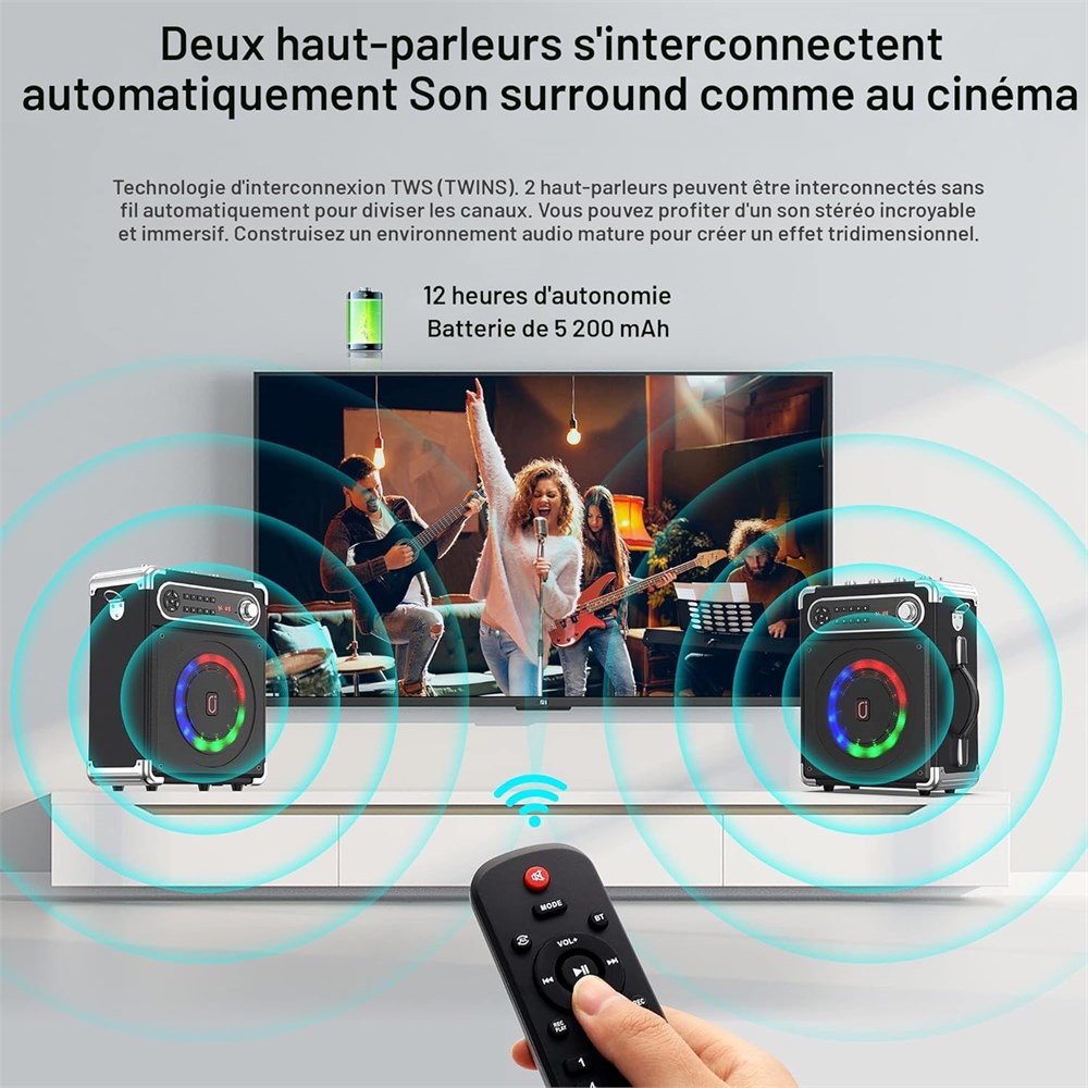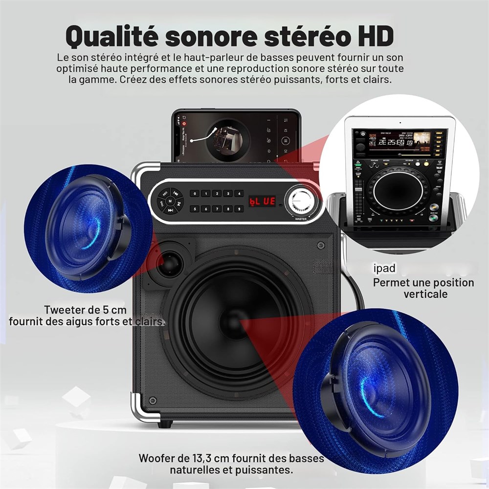 Superbe qualit de son st r o HD : le haut-parleur Bluetooth portable est quip d'un pilote audio haute performance et d'un processeur de signal num rique avanc , ce qui rend le son plus clair, les basses plus fortes, le volume plus mod r , et limine tout le bruit. Caisson de basses int gr de 5,3 cm et tweeter de 5,1 cm, qui peut amplifier votre voix, jouer la radio ainsi que diffuser des chansons et il ne d forme pas l'audio m me des volumes plus lev s. Vous pouvez profiter de basses et d'aigus forts, forts et transparents. Machine de karaok multifonction : la derni re puce Bluetooth 5.0 int gr e pour le streaming sans fil assure un couplage instantan et offre une transmission plus stable et une plus longue distance. Ce grand haut-parleur prend galement en charge une carte Micro TF, USB Flash et une connectivit AUX-in. Compatible avec t l phone mobile Android, TV, iPad, tablette, PC. Il y a une entr e microphone de 6,35 pouces sur le panneau de commande, qui fonctionne galement pour les guitares. Le design unique de rainure sur la machine de karaok vous permet de placer votre t l phone. Batterie l g re et grande capacit : la coque du haut-parleur JYX est fabriqu e en bois/cuir massif exquis et durable. Il p se 2,96 kg et est attach une bandouli re. L ger, portable et compact. Vous pouvez facilement le transporter la plage, en plein air, etc. Batterie haute performance (batterie lithium-ion rechargeable int gr e de 3,7 V/5200 mAh de grande capacit ), et faible consommation d' nergie, garantissent 6 8 heures de lecture de musique continue sur une charge compl te. (veille pendant 72 heures, 10 heures pour une lecture normale) Lumi res disco color es : ce syst me de sonorisation est quip de lumi res disco color es. Bouton ind pendant pour changer les lumi res. Les lumi res LED color es cr ent une ambiance agr able et romantique pour un karaok et une f te. Avec cette machine de karaok , vous pouvez profiter d'une f te color e et joyeuse. Mode TWS : en connectant deux m mes syst mes st r o, le son st r o puissant sera synchronis et vous entoure de 2 canaux. Vous pouvez profiter de la musique avec le meilleur sens de la pr sence, de la puissance et du volume. (Remarque : si vous n' tes pas satisfait de ce syst me de haut-parleurs ou si vous avez d'autres questions, n'h sitez pas nous contacter avant de le retourner. Nous nous engageons vous offrir des solutions satisfaisantes.)