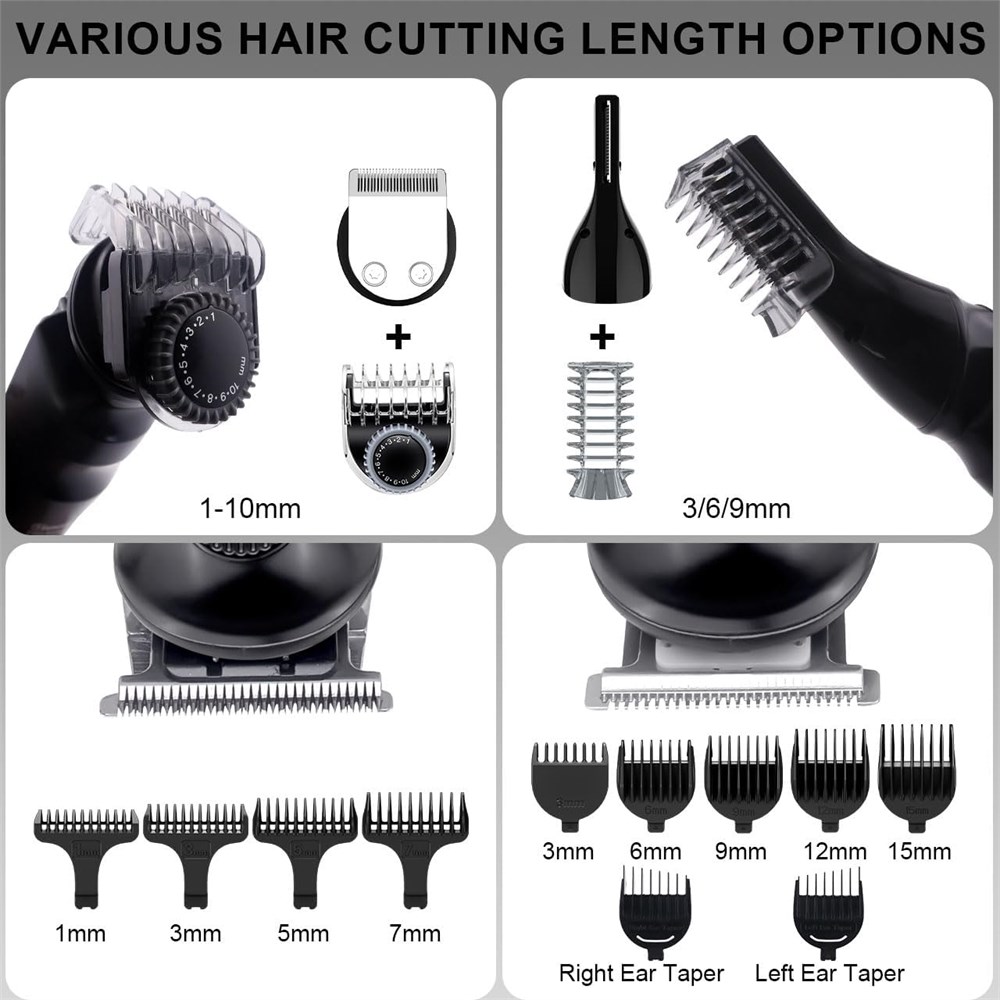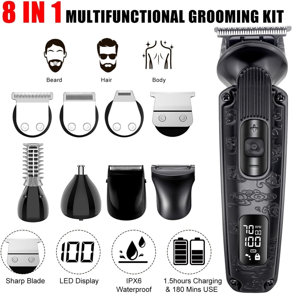 8-in-1 Multi-Functional Grooming Set The grooming set includes T-blade groomer with 4 guide combs (1mm, 3mm, 5mm, 7mm), hair clipper with 7 guide combs (3mm, 6mm, 9mm, 12mm, 15mm, left and right comb row), precision trimmer, razor, beard trimmer, nose/ear hair trimmer, body groomer, and body trimmer, which can be used to meet all your grooming needs according to hair length. Adjustable Motor Speed / Extreme Trimming The kit's motor features an adjustable push-button speed control (6000RPM, 6500RPM, 7000RPM) for a quiet and efficient shaving experience. The R-Type 360 Skin-Friendly Blunt-Edge Blades provide a fast, safe trim without irritating the skin. USB Charging and LED Display The trimmer is USB rechargeable and can operate for 180 minutes on a full charge in 1.5 hours. Cordless design, LED display and one-touch locking function for your business or travelling convenience. This beard trimmer is ergonomically designed for ease of use. 100% Waterproof and Easy to clean The trimmer is easy to clean and can be completely washed. All attachments are removable and can be quickly cleaned after shaving by first cleaning the blades with the included brush and then rinsing with tap water. The beard trimmer comes with a base and storage pouch for easy storage after use! Gifts for Men This electric trimmer set can meet the need of daily hair trimming, it is a multi-functional set, which can be used as a birthday gift, Christmas gift, Valentine's Day gift, Father's Day gift and so on for your loved ones and friends.