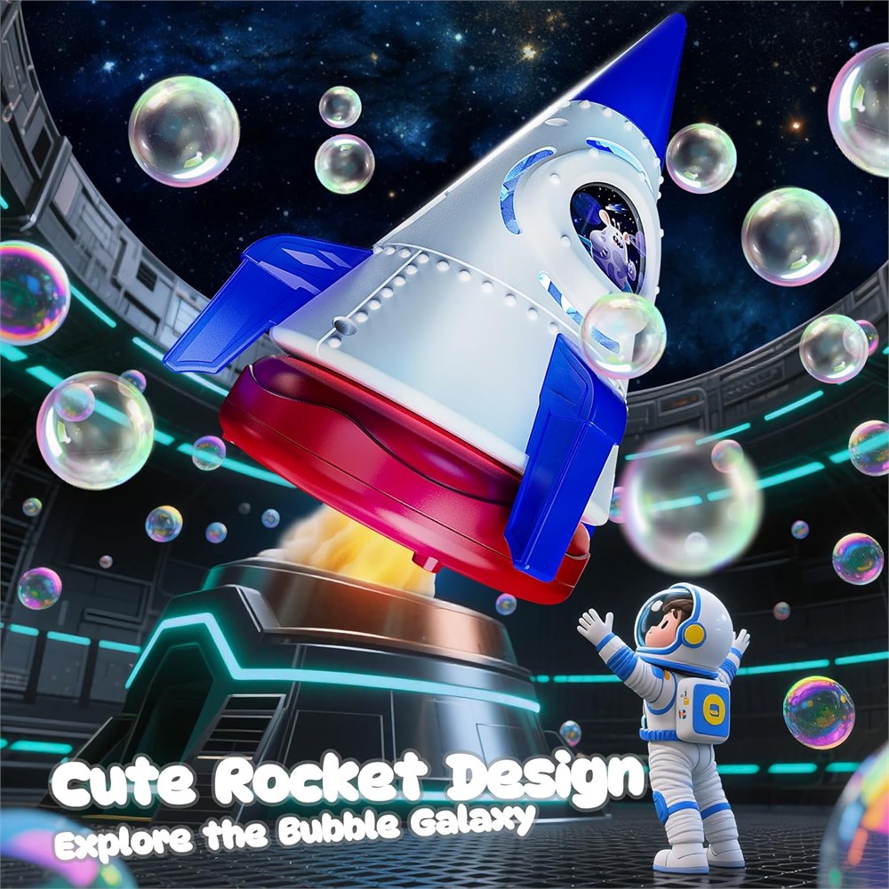 Rocket Launch Bubble Fun Blast off into bubble-filled adventures! This rocket-shaped bubble machine spins 360 while glowing with colorful lights and playing cheerful music. A fun and magical way to spark children's imagination at any party, playdate, or backyard event. Tap to Glow, Tap to Bubble Simple one-touch operation kids just tap to activate bubbles, lights, and rotation. Watch as thousands of shimmering bubbles fill the air, turning any space into a dreamy bubble galaxy that delights toddlers and even pets! Easy to Use & Kid-Friendly Controls This bubble machine features simple two-button operation: the left button activates bubbles, lights, and rotation, while the right button controls lights and rotation only perfect for indoor play without the mess. Large, soft-touch buttons make it easy for little hands to operate independently and confidently. Sensory & Social Play Designed for toddlers and kids, this bubble toy encourages active movement and supports sensory development with lights and motion. Great for sharing and social play at parties or outdoor gatherings. Safe & Durable Design Made from child-safe, non-toxic ABS plastic with smooth edges. Comes with 10 packs of bubble solution. Built for durability and safety perfect for birthdays, holidays, or everyday playtime fun.