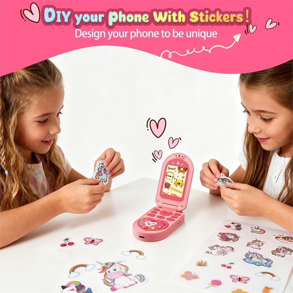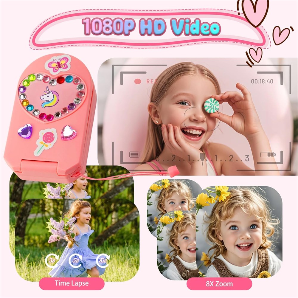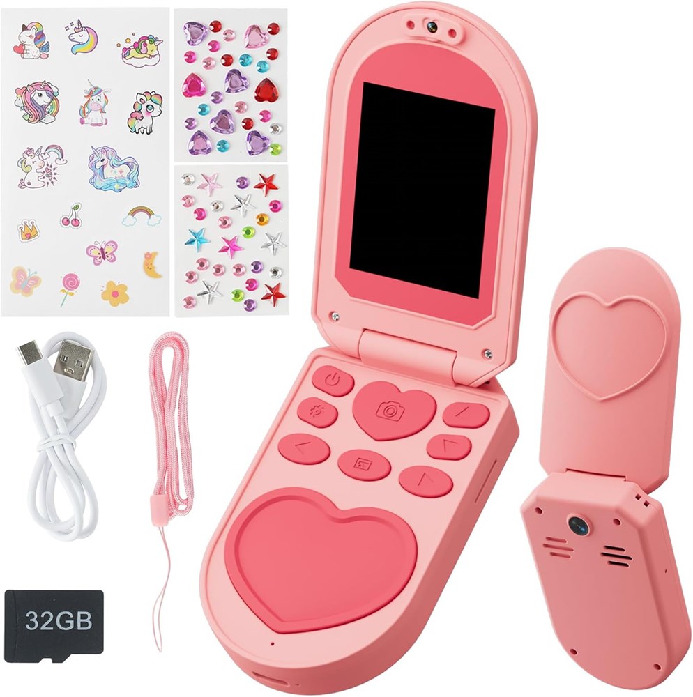 RETRO DESIGN, FUN DIY STICKERS This kids' camera features a flip phone design in a playful pink and retro flip. It comes with a magical collection of stickers, including unicorns, cute designs, and two sheets of sparkling rhinestones. Girls can personalize their phone to make it a one-of-a-kind treasure, encouraging imagination, self-expression, and sparking creativity! DUAL CAMERAS FOR CREATIVE PHOTOGRAPHY Let your girls explore the world of photography! The built-in dual cameras can be used for selfies and photos of friends. Girls can capture beautiful memories with 21 fun filters, 16 playful frames, and 6 lens effects. 8x zoom brings details to life, and 1080P HD video recording lets them become budding filmmakers! MUSIC PLAYER AND FUN LEARNING GAMES It's more than just a camera; it's a portable music player! The included 32GB SD card lets you load your child's favorite songs from your computer, turning the phone into a personal music player for on-the-go listening. Plus, it features five built-in educational games that challenge the mind while providing wholesome fun perfect for both learning and play. RECHARGEABLE BATTERY FOR LONG-LASTING FUN! Enjoy longer playtime without frequent battery changes! This kids' camera features a large-capacity rechargeable battery that provides hours of non-stop filming, music playback, and game play. It's eco-friendly and affordable, always ready for adventure! DESIGNED FOR KIDS Designed for little hands and growing minds, this flip phone-style camera offers a child-friendly experience without unnecessary complexity. It helps develop photography skills, artistic expression, and problem-solving abilities. Safe, convenient, and inspiring creativity! THE PERFECT GIFT FOR GIRLS AGES 3-10! Whether it's Christmas, a birthday, or any other occasion, this feature-rich kids' camera makes a great gift! It combines limitless creativity, safe technology, and endless fun, designed to delight and spark every little girl's imagination. Give them a gift that inspires joy and creativity!