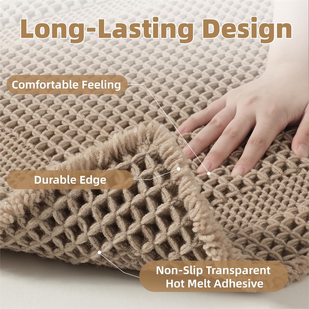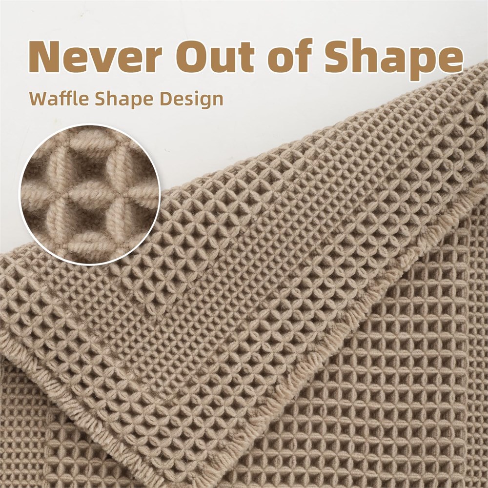 Upgraded Waffle Bath Mat Featured with a unique waffle design, our subtle yet stylish bath mats for bathroom non slip washable complement various decorative styles, adding a touch of sophistication to your bathroom. The upgraded yarn and tighter weave enhances the absorbency and durability of the washable bathroom rug. Super Absorbent Bath Mat Made with upgraded absorbent yarn, our boho bathroom mat can continuously absorb moisture like a sponge. The three-dimensional waffle texture and tightly woven design effectively prevents water from seeping onto floor, keeping your bathroom clean and dry. Non Slip Bath Mat The invisible but touchable non-slip hot melt adhesive backing firmly grips any surface, preventing the beige bath mat from shifting. Our bathroom floor mat can effectively prevent slipping, giving you and your family double safety protection. Easy to Maintain Our machine washable bath mat is designed for effortless care. Simply machine wash the bath mat non slip in cold water with a laundry bag on the gentle mode. We recommend you hang it to dry, avoid tumble drying or ironing to maintain its softness and longevity. Soft & Comfortable Bath Rug The soft waffle surface provides a gentle and comforting touch, insulating your feet from cold floors. Our waffle bath rugs for bathroom bring you warmth after the bath, making every post-shower moment a delight.