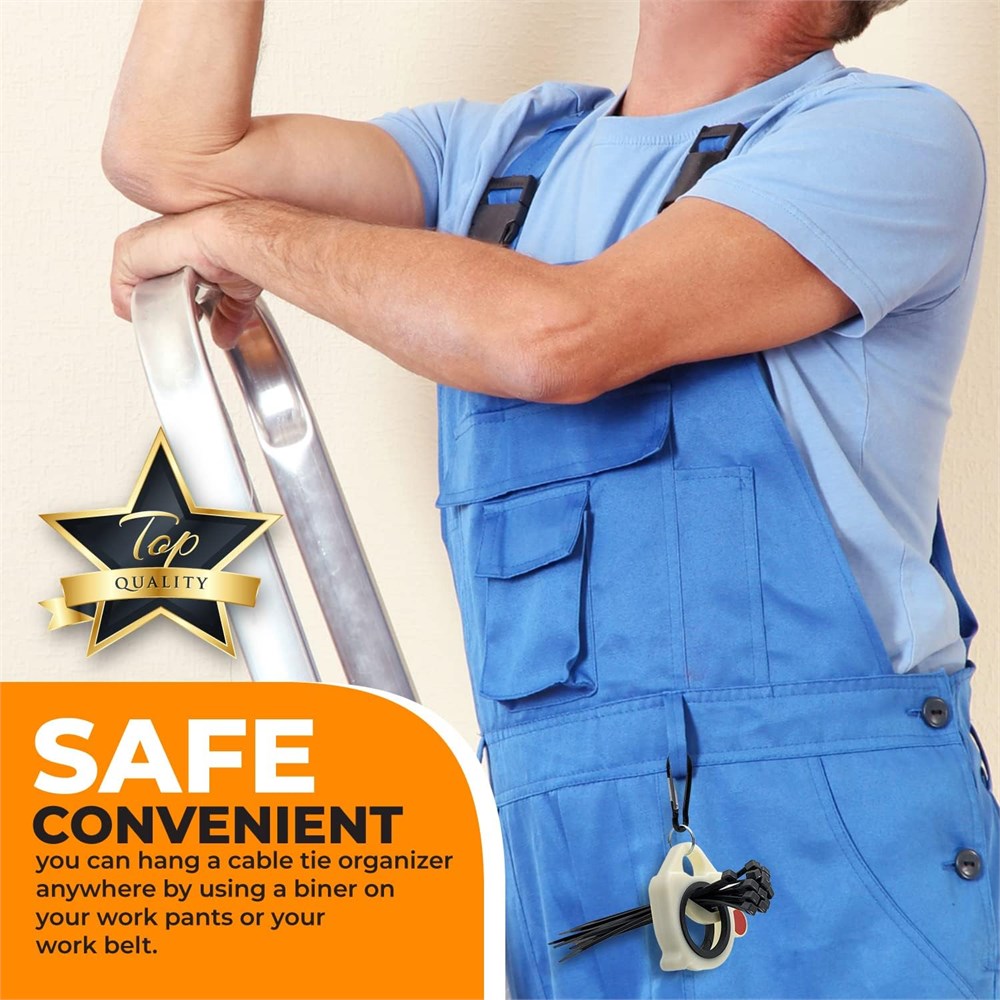 SAFE-When you climb a ladder or work in a high space, you don t need to hold a cable tie or find it in your pocket, so you can focus on your work safely. CONVENIENT-You can hang a cable tie organizer anywhere by using a biner on your work pants or your work belt. AUTOMATIC-Organizer's lever tightens automatically every time you use a cable tie, so the cable tie won't come off. LIGHT AND REUSABLE-This reusable cable tie organizer is made of plastic so it is very light. GLOW IN THE DARK-This organizer can glow in the dark for 30 minutes after light absorption.