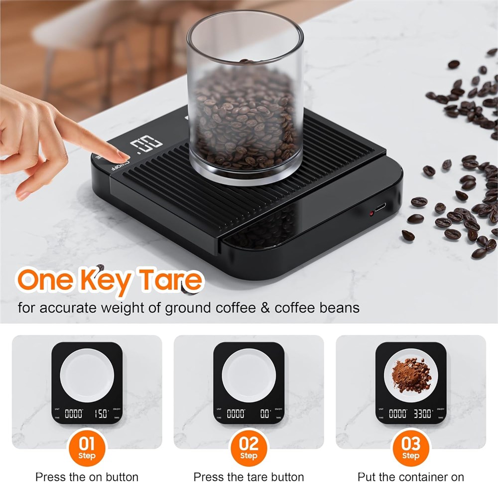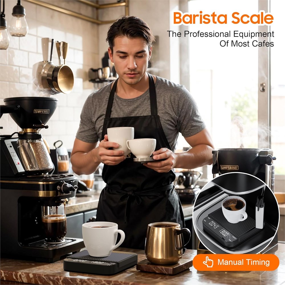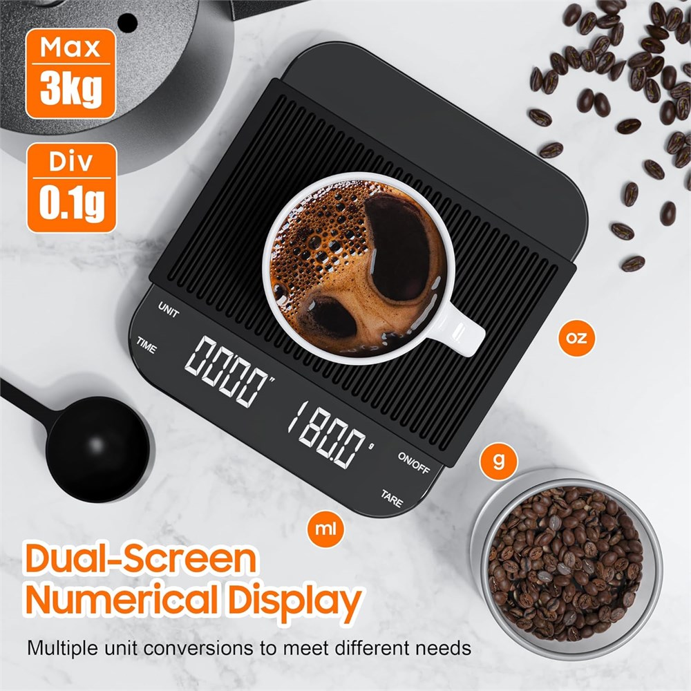 Professional Precision for Espresso Lovers 0.1g High Precision: This digital coffee scale offers accuracy up to 0.1g, with a range from 0.3g to 3000g. Equipped with high-precision sensors, it ensures accurate measurements every time. Perfect for espresso and pour-over brewing, giving you full control for the ideal taste Silent Operation & Auto Shutoff Noise-free design ensures quiet brewing sessions without disturbing others. The scale automatically powers off after 5 minutes of inactivity to save battery life. Versatile 3-Unit Display Switch seamlessly between grams (g), ounces (oz), and milliliters (ml) for flexible recipe measurements, catering to both home baristas and professionals. Sleek Glass Mirror Design Features a modern, easy-to-clean black glass mirror surface that complements any kitchen or coffee setup, blending functionality with aesthetics. Perfect for Espresso Machines Pro Tip: Before purchasing, verify the size of your espresso machine's tray to ensure compatibility. Ideal for precise coffee brewing and recipe development.