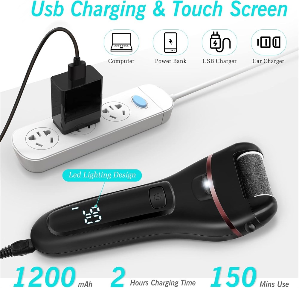 LED Display & Light Our electric pedicure foot file kit built-in LED touch screen, which is easy to operate and can show power display more intuitively. At the same time,This foot scrubber equipped with a light that you can use it in dark place. Waterproof & Easy to Clean The callus remover for feet has a very good waterproof effect. You may rest assured to use it in bathroom, swimming pool, bathhouse and other places. At the same time, the quartz grinding head is easy to disassemble and clean. You can clean it directly. Electric & Manual Foot File Set This pedicure kit contains 1 electric callus remover and 6 manual foot scrubber tools,including stainless steel coarse file, stainless steel fine file,nail file,cuticle fork,callus scraper,scraping knife, etc.Different parts to meet your different needs. 2 Speeds Adjustable This cordless pedi feet care tool has 2 speeds adjustable. 1700 RPM/min and 2000 RPM/min, Low speed is suitable for daily care or skin with less calluses. High speed is suitable for feet with severe calluses or dead skin.you can complete speed switching by pressing the touch button. 3 Quartz Roller Heads Electric feet callus remover has 3 different roller heads. Light Callus Roller suitable for daily foot care, Regular Callus Roller suitable for non serious dead skin and calluses.Heavy Callus Roller suit for stubborn horny dead skin, You can choose suitable roller head according to the situation of your foot.