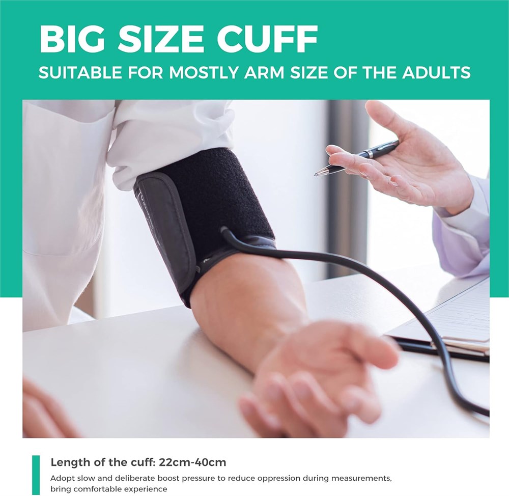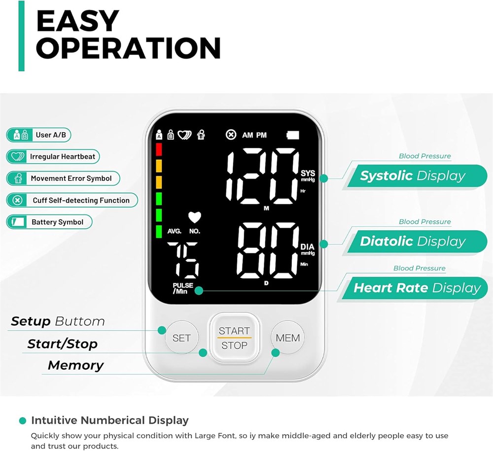 One-button Easy Use: Just need to press the START/STOP button, it will start to measuring and you will get the readings within 1 minute Large LED-backlit Display: Our Blood Pressure Monitor uses a large LED-backlit display, large fonts, bringing a more convenient user experience Dual Users x 120 Memory: Our bp monitor can store up to 240 readings for 2 users, with the date and time stamp; It also has the last 3 groups' average value function, great for home use 2 Power Mode: This BP supports 2 ways to use: 3AA batteries(batteries are not including), USB-C cord; 2 Power way can't used at the same time(Note: The USB-C cord is for plug-in use only and does not have a built-in battery, it s not a rechargeable device.) User friendly: With a big size cuff 22-40cm/ 8.7-15.7in, and a cuff self-checking function, comfortable to take measurements and obtain accurate readings.
