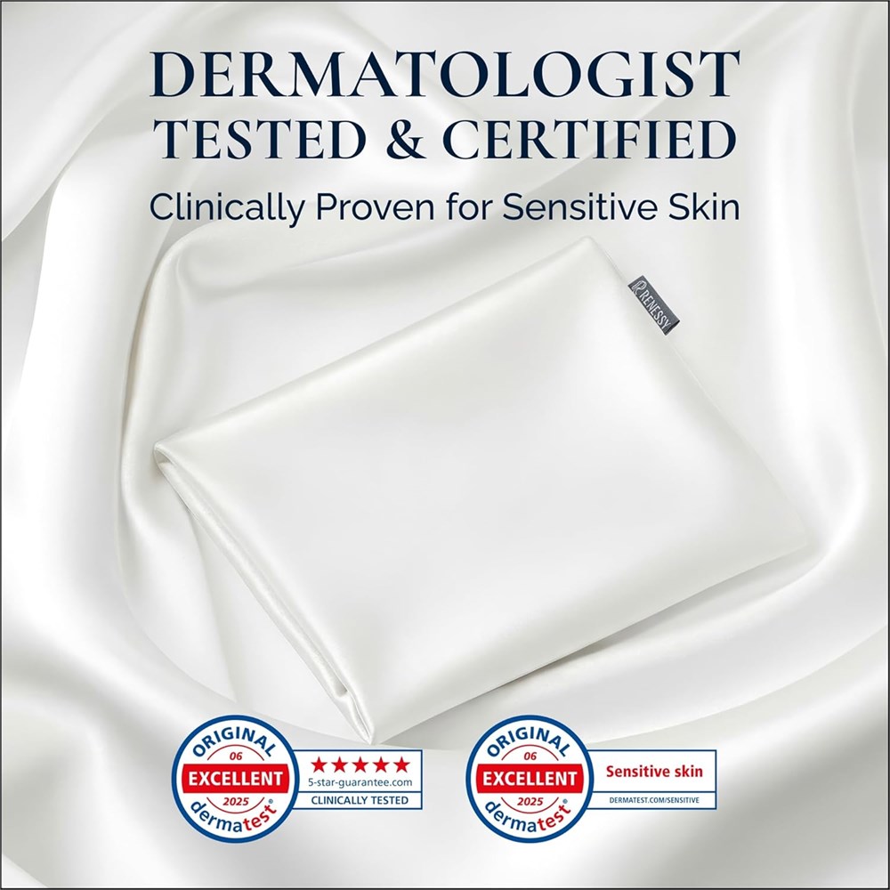 100% ORGANIC MULBERRY SILK, GRADE 6A | Our pillowcases are made from the finest organic silk, certified by GOTS. REAL 22 MOMME SILK | Did you know many silk products claiming to be 22 Momme aren t? At RENESSY, our pillowcases are laboratory-tested to ensure they meet the true 22 Momme standard, so you enjoy the quality and durability you re paying for. CERTIFIED SAFETY | OEKO-TEX certified in Germany, our silk is free from harmful chemicals. It s safe for everyone, including babies and those with sensitive skin. ALL-SEASON COMFORT | Whether it s warm summer nights or chilly winters, silk naturally adjusts to keep you cool or warm as needed, helping you wake up refreshed and sweat-free. PERFECT GIFT IDEA | Packaged in a stunning gift box, our pillowcase is a perfect gift for birthdays, weddings, or any special moment where you want to delight someone special. SIMPLE CARE | RENESSY silk is designed to maintain its softness and vibrant color over time. Just wash at 30 C/86 F with a pH-neutral detergent, and it dries quickly with minimal wrinkles - no ironing needed.