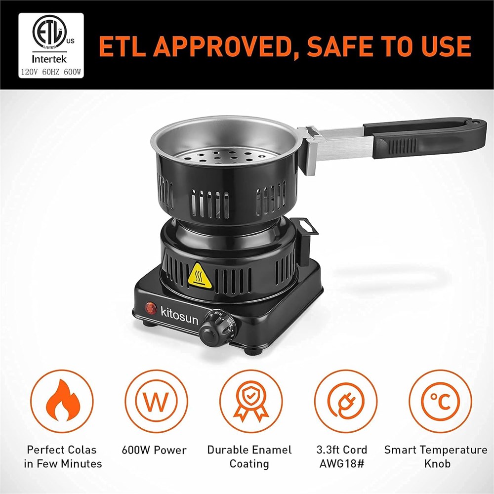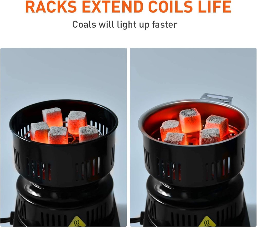 Easy to use & fast: The electric coals burner is very convenient. Just need to plug in the socket and twist the knob to MAX. It can heat up coconut charcoals very quick. Only 10-13 minutes, all sides of the coals blazed red. The quick light charcoal tablets will be ready to use in one minute. Powerful & ETL Approved: The Electric Coil Burner is 120V~600W, it heats up faster. ETL Approved. Its body is made of a durable steel housing that is highly resistant to high temperatures and fire. Rubber feet for stable cooking. AWG 18# heavy duty rubber cables. Safe and Durable. Durable: The solid enamel coated on the steel body, which keeps the body neither gets rust nor paint smell. To protect the coiled heat elements for a long life, a charcoal screen grill is provided. You can use it as a tray to move the burning coals. Or put it in the stove to heat coals, that keeps your charcoal slightly above the heating element. Another stainless steel rack also used to extend the coiled tube life. Widely use: This Electrical Charcoal Lighter not only use for the charcoals. With these provided grill & rack. You can also cook milk & cafe, boil water, and so on. User Friendly: The detachable handle is very useful, it can help you to move the stove, charcoal tray, and even it could be tongs to clip the coals. With a solid plastic coat. It will not be over heat. And you can adjust the heat by the smart control knob. Keep it dry and clean. After use, please remove the power plug from the socket to save electric energy and extend the life-span of coil elements.