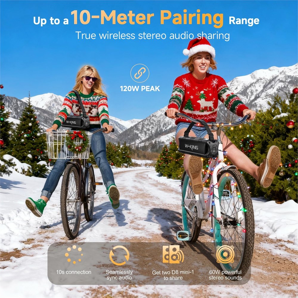 CRYSTAL CLEAR SOUND & DEEP BASS: Distinct mids and highs from our two precision acoustic drivers delivers excellent stereo sound and enhanced bass because of our proprietary passive bass radiator design, without distortion even at the highest volume. Providing 30% louder volume and richer bass than other speakers. The crystal clear deep bass 30W HD loud speaker is designed for both active outdoor and indoor use. ULTRA PORTABLE & LARGE BATTERY & 24H PLAYTIME: The W-KING D8 mini-1 portable Bluetooth speaker is built of lightweight, robust, and unibody construction to enjoy excellent sound whenever and wherever you may be. The adjustable and removable strap is tailored for comfortable carrying, so much better for travel & hiking. High-capacity rechargeable battery lasts for up to 24 hours of playing time at the lowest volume on a full charge. WATERPROOF IPX6 & POWERFUL STEREO SOUND: W-KING waterproof outdoor Bluetooth speaker is IPX6 certified to resist gentle water spray & splash but cannot be partially or fully submerged. It s perfect for splash-proof, rainproof, dust-proof, sand-proof, etc. Connect two W-KING D8 MINI-1 portable speakers wireless bluetooth at the same time, you can get a 30W superl surround sound effects, and enjoy a better music feast! BLUETOOTH 5.0 & 2 EQ MODES: Ensuring a fast connection to all Bluetooth-enabled devices from as far as 66 feet away, automatically reconnecting to the last paired device instantly. Bluetooth 5.0 works with all smartphones, Amazon's new Echo Dot, and plays audio from Laptops, TVs with the included 3.5MM AUDIO CABLE. W-KING D8 MINI-1 built-in TWO equalizers (indoor and outdoor mode), you can adjust to your favorite audio, find the right balance, and enjoy deep bass, clear midrange and crisp treble. MULTIFUNCTION: W-KING portable loud Bluetooth speaker built-in microphone also provides a HANDS-FREE of your call. The 3.5mm AUX cable, TF card and USB flash drive provide multiple choices for indoor and outdoor. Please use 5V/2A power adapter and our provided USB-C cable to charge the speaker. Power adapter is NOT INCLUDED.