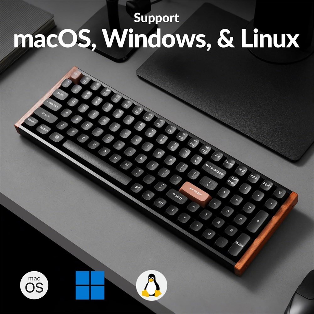 Next-Gen Magnetic Switches & Rapid Trigger: Experience lightning-fast response with Gateron Hall Effect Magnetic Switches. Unlock game-winning precision with Rapid Trigger technology and fully adjustable actuation points (0.2mm - 3.8mm in 0.1mm steps). Minimize mis-clicks and tailor every keystroke for peak gaming performance or comfortable typing. Seamless Tri-Mode Connectivity: Connect effortlessly via Bluetooth 5.2 (stable, low-energy, pair up to 3 devices), ultra-responsive 2.4GHz wireless (1000Hz polling rate for competitive gaming), or reliable USB-C wired mode. Switch instantly between your computer, phone, and tablet. Easy Browser-Based Customization: Remap keys, create macros, fine-tune actuation points, and enable Rapid Trigger anywhere, anytime, directly from your web browser with the Keychron Launcher. No software downloads required for a fully personalized setup. 96% Compact Layout & Premium Build: Get the essential number pad in a space-saving 96% form factor. Features durable double-shot PBT keycaps (resistant to shine) and a sophisticated frame combining natural wood side panels with robust aluminum for lasting beauty and stability. Enhanced Acoustics & Vibrant RGB: Enjoy a more satisfying and consistent typing sound thanks to built-in sound-dampening foam. Illuminate your workspace with 16.8 million color RGB backlighting and multiple dynamic lighting effects. Full Mac & Windows Compatibility: Works flawlessly with macOS, Windows, and Linux (via a simple toggle switch). Includes dedicated Mac keys (Command, Option) for seamless integration with Apple ecosystems. Magnetic Switch of Advanced TMR Sensors: Equipped with cutting-edge Tunneling Magnetoresistance (TMR) technology to detect precise distance and magnetic field variations through subtle resistance shifts. Every key features a dedicated TMR sensor for superior resolution, delivering pinpoint accuracy, ultra-low latency, and an unparalleled magnetic switch input experience. Magnetic Field Sensitivity: up to 100 mV/V/Oe.