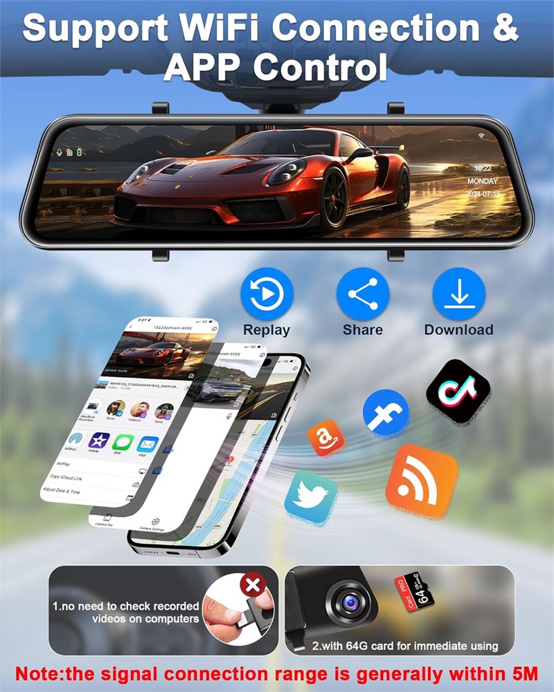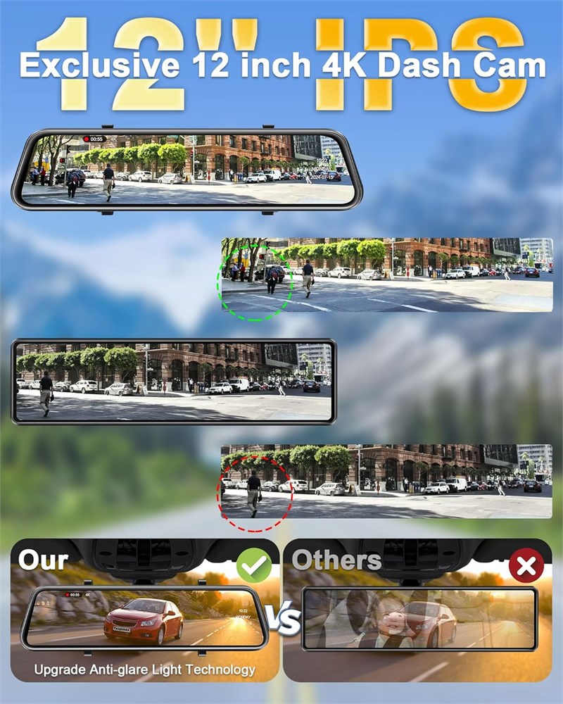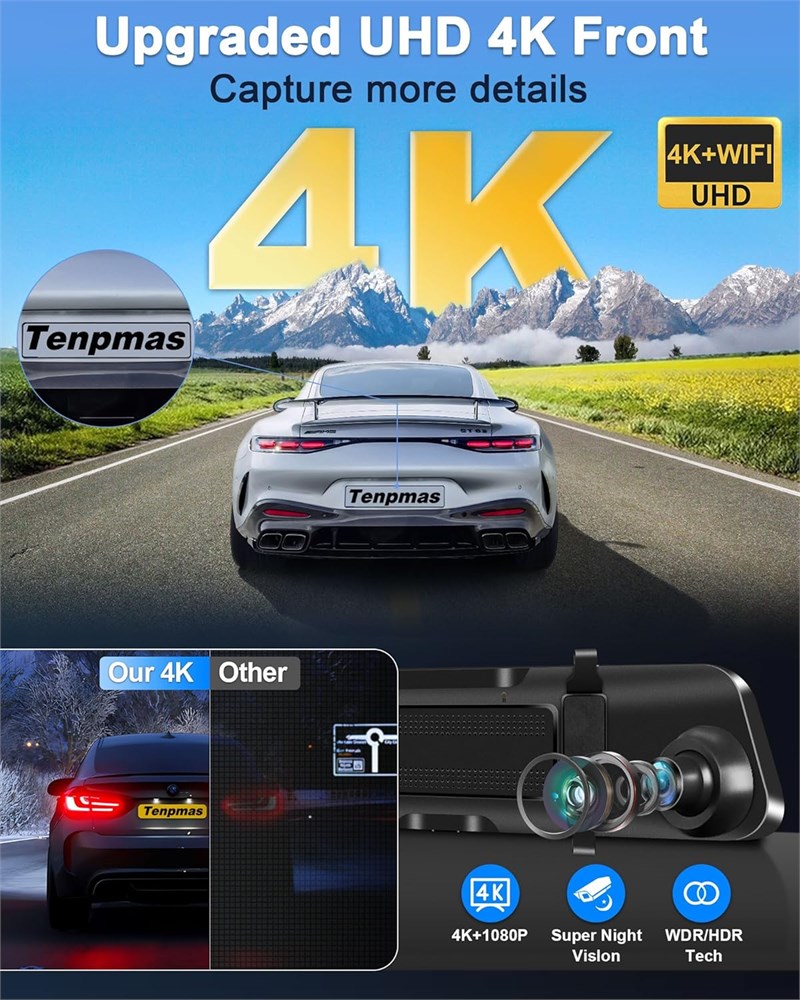 4K HD Quality Recording & Widened 12 inch Touchscreen: Tenpmas rear view mirror with 4K Ultra HD front camera, easy to see road signs, licence plates and other important details, major accidents can be documented, but also convenient for you to view more textured video clips of your self-driving trip at any time! The rear view mirror camera touchscreen adopts 12' IPS display, perfect coverage of the car original rearview mirror, large screen and large field of view, providing a wider field of view than 10 inch/11 inch dash cam mirrors! WiFi-APP Control: 4K mirror dash cam front and rear camera with WiFi for viewing videos directly on your mobile phone! You can change the options for the dashcam rearview mirror on the mobile APP. Share your travels and moments with friends and family with just one click. Save the hassle of removing the SD card and reading it on your computer, and provide video directly as key evidence in an emergency! Our rearview mirror dash camera comes with a 64GB memory card, so there's no need to buy an additional one. 170 Ultra Wide Angle and 2 Types of Reverse Screens: The dash cam front and rear camera provides 170 +140 ultra-wide angle, easily capture the front/rear/side of the sudden appearance of vehicles and people, driving safety is greatly improved, even if your boot is full of debris can easily know the situation behind you! The mirror backup camera has 2 kinds of reversing auxiliary screen to provide you with the most realistic reversing vision, you can choose to zoom in/out the reversing screen according to your driving habits! WDR/HDR Night Vision and Mirror/Original Switching: Tenpmas rear view mirror backup camera use advanced WDR technology to balance the light, minimising the glare of the sun during the day and the headlights of other cars at night. And the dash cam rear view mirror further enhanced by Starvis II sensor, F1.5 large aperture and 6 glass lens, the night image/video is more ambient! Details such as licence plates are clearly visible even in low light conditions. The rear view camera supports Mirror/Original image display, you can use it as a front or rear camera. Upgraded IP69K Waterproof Rear Camera: Compared with other car cameras, Tenpmas' rear view mirror camera displays images better, without fear of strong light during the day and direct rear headlights at night. The back up camera is made of the best waterproof material inside and outside, which meets the international IP69K waterproof standard, so you don't need to worry about the lens getting foggy or watery. In addition, the dash camera also supports flexible mounting, so you can choose to mount it inside the car on the rear windscreen (bracket included) or outside the car. Multi-functional Rear View Mirror: The rearview mirror dash camera provides 24-hour parking monitoring, loop recording, G-sensor. In case of a collision, rearview mirror will automatically turn on and record a short video, automatically lock and save the recorded video to record important moments. (Note: This feature requires the additional purchase of the dash cam Hardwire Kit) Meanwhile, the TYPE-C interface and super capacitor design make the dashcam safer to use, longer life and more stable power supply.