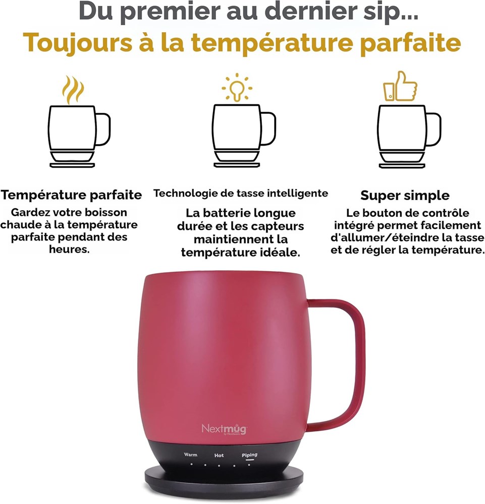 Toujours la temp rature parfaite : la tasse Nextmug gardera votre caf chaud, th ou boisson pr f r e la temp rature parfaite o que vous soyez. S lectionnez simplement Chaud (55 C), Chaud (60 C) ou Piping (65 C) et profitez pendant des heures. Technologie intelligente : la batterie longue dur e maintient votre temp rature id ale. Les lumi res LED affichent la dur e de vie de la batterie et la temp rature en temps r el. Comprend un couvercle r sistant aux d versements et un dessous de verre de charge. Super simple : le bouton de contr le int gr allume/ teint facilement la tasse et r gle la temp rature. Ne prend que quelques secondes pour r gler la tasse votre temp rature parfaite. Aucune application requise - Pas de mot de passe, de red marrage ou de probl mes de s curit . Fabrication soign e : l gante finition mate en c ramique recouvrant le corps durable en acier inoxydable de la tasse. Le corps et la poign e brevet s et ergonomiques tiennent parfaitement dans vos mains. Id al pour la maison, le bureau ou le bureau domicile. Le cadeau parfait : offrez le cadeau qui ravira certainement. Parfait pour tout le monde sur votre liste... mamans, papas, grands-parents, enseignants, anniversaires, remises de dipl me et plus encore Contenu : (1) Nextmug de 415 ml ; (2) sous-verre et cordon de 1,8 m pour charger la batterie lithium-ion l'int rieur du Nextmug ; (3) couvercle r sistant aux d versements pour garder les liquides chauds dans la tasse et aider maintenir la temp rature id ale pendant de longues p riodes. Tous les Nextmugs sont enti rement compatibles, y compris les tasses, les couvercles, les sous-verres et les accessoires.