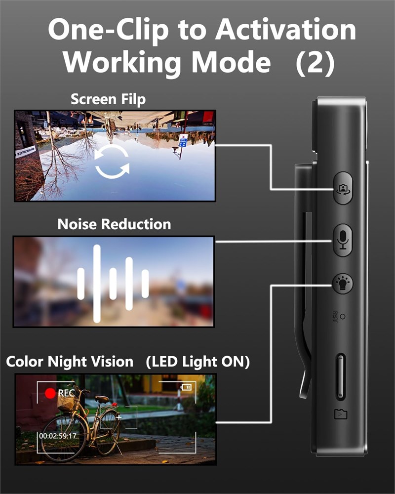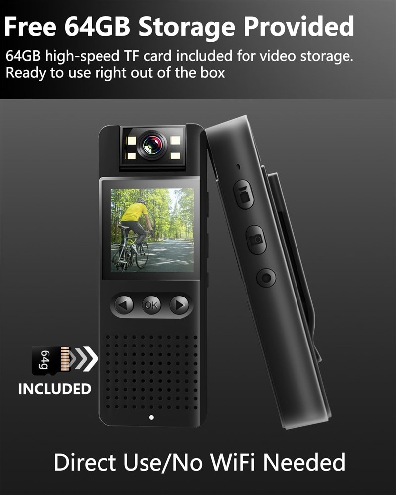Vid o Full HD 1080p et photos 16 MP : la cam ra corporelle capture des vid os cristallines en 1080p et prend des photos de haute qualit de 16 MP, assurant que chaque moment est pr serv avec des d tails vifs. Vision nocturne aux couleurs vives : cette cam ra corporelle capture des vid os et des images lumineuses et vives, m me dans les environnements les plus sombres avec une vision nocturne en couleur avanc e, assurant que chaque moment est visible. Lecture de l'appareil local : regardez instantan ment vos vid os et photos sur l' cran HD int gr de 1,4 pouces sans avoir besoin d'un PC. Vous pouvez galement supprimer rapidement des fichiers ou ajuster les param tres directement sur l'appareil. Longue dur e de vie de la batterie Aliment e par une batterie rechargeable de 1800 mAh, cette mini cam ra offre jusqu' 7 8 heures d'utilisation continue (en fonction de l'utilisation, du mode de fonctionnement et des param tres), parfaite pour les sports de plein air, la randonn e, le cyclisme, l'escalade et les voyages, vous assurant de ne jamais manquer un moment. Modes photo continus et chronom tr s pour une capture flexible : capturez chaque instant avec une prise de vue continue ou d finissez une minuterie pour des photos pr cises et planifi es. Que vous soyez en action ou que vous planifiez une prise de vue, cette mini cam ra corporelle vous offre la flexibilit de prendre des photos votre fa on. Rotation 180 et objectif grand angle de 140 pour des angles flexibles Profitez d'une prise de vue polyvalente avec l'objectif rotatif 180 et capturez des s quences larges et tendues avec l'objectif grand angle de 140 , vous assurant de ne jamais manquer un moment quel que soit la perspective. Deux modes de capture pour chaque besoin : choisissez le mode continu pour tout capturer, ou passez en mode d tection de mouvement pour conomiser du stockage en capturant uniquement lorsque un mouvement est d tect . Profitez de la flexibilit n cessaire pour capturer exactement ce dont vous avez besoin. Mode hotspot pour un t l chargement facile de vid os et de photos : avec le mode hotspot, vous pouvez rapidement t l charger et acc der vos vid os et photos directement depuis l'appareil photo, tout moment, n'importe o , sans avoir besoin de vous connecter au Wi-Fi ou un ordinateur. Plusieurs m thodes de visionnage Visualisez vos s quences de 4 fa ons diff rentes : directement sur l'appareil photo, via un ordinateur, via l'application t l phonique, ou en utilisant un lecteur de cartes. Plusieurs options de montage pour une utilisation polyvalente : la petite cam ra offre plusieurs options de montage, vous permettant de la monter facilement sur des v los, des voitures, des casques, ou de la clipser sur un sac dos et un ordinateur. Avec son design magn tique, vous pouvez galement le fixer en toute s curit sur n'importe quelle surface magn tique pour une utilisation mains libres et flexible.