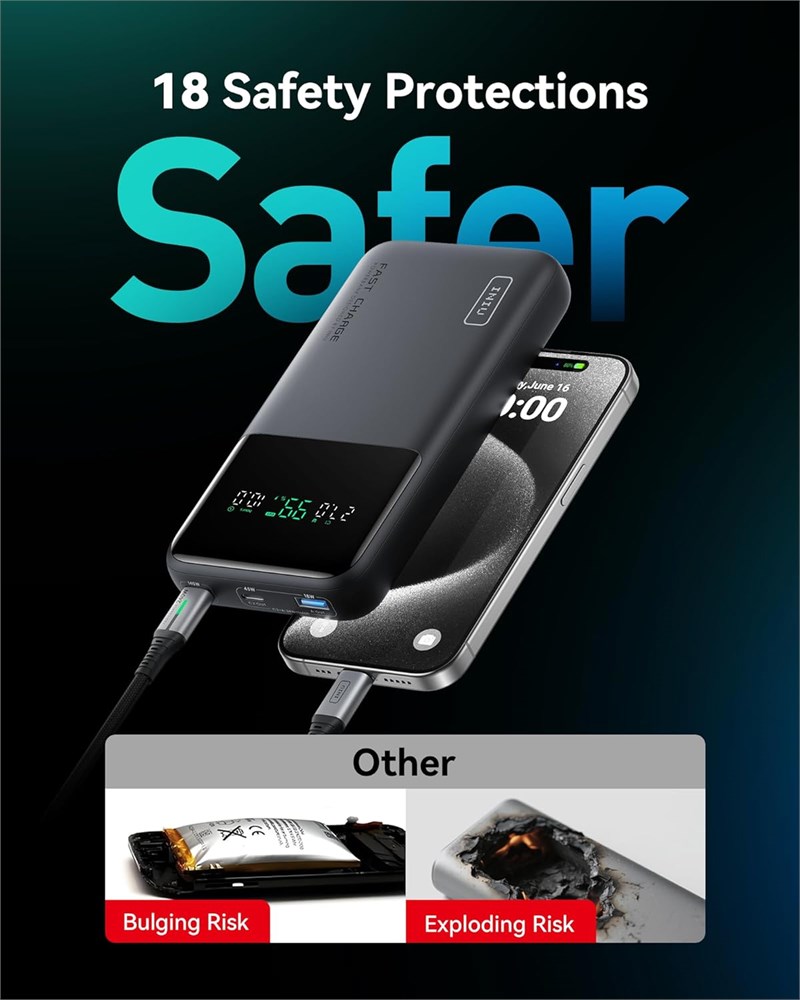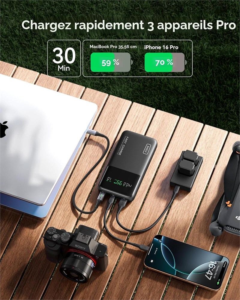 INIU offre une recharge rapide s curitaire et professionnelle : profitez de la charge la plus s curitaire avec plus de 38 millions d'utilisateurs dans le monde. Chez INIU, nous utilisons uniquement des mat riaux de la plus haute qualit . Recharge ultra-rapide PD 3.1 140 W : alors que d'autres peinent atteindre 65 W ou m me 100 W, notre PowerNova PD 3.1 140 W est suffisamment rapide pour alimenter tous les appareils forte consommation d' nergie, tels que les ordinateurs portables et SteamDeck. En seulement 30 minutes, vous aurez un MacBook Pro 16" 59 %, un SteamDeck 57 %, un iPhone 15 Pro Max 71 % et un S23 Ultra 75 %. Chargeur portatif avec une batterie massive de 27 000 mAh approuv e par les compagnies a riennes : avec une capacit impressionnante de 27 000 mAh approuv e par les compagnies a riennes, il permet de recharger plusieurs fois tous vos appareils lors de vos d placements en une seule recharge. Alimentez plus de 1 000 appareils, petits ou grands : que vous ayez un appareil Android, Apple ou d'une autre marque, ce chargeur portatif est fait pour vous. Une solution universelle pour tous vos besoins en mati re de recharge. Rechargez 3 appareils la fois : avec 3 ports de recharge, dont un port USB-C PD 3.1 140 W ultra-rapide, un port USB-C PD 45 W pour une recharge rapide et un port USB-A fiable, ce chargeur portatif est votre solution de recharge tout-en-un. Il fonctionne parfaitement avec diff rents types de c bles, garantissant une recharge rapide pour tous vos appareils. Affichage DEL intelligent indiquant le niveau d'alimentation : vous en avez assez de deviner combien de temps il reste votre chargeur portatif? Ou deviner combien d'heures il reste avant que le chargeur portatif soit compl tement recharg ? Notre cran DEL ne se contente pas d'afficher le pourcentage de batterie restant; il s'agit d'une interface dynamique et intuitive qui transforme votre exp rience de recharge. Contenu : 1 chargeur portatif PD3.1 de 140 W, 1 c ble USB-C vers USB-C, 1 tui de voyage, 1 guide de d marrage rapide, 1 manuel d'utilisation (fran ais non garanti)