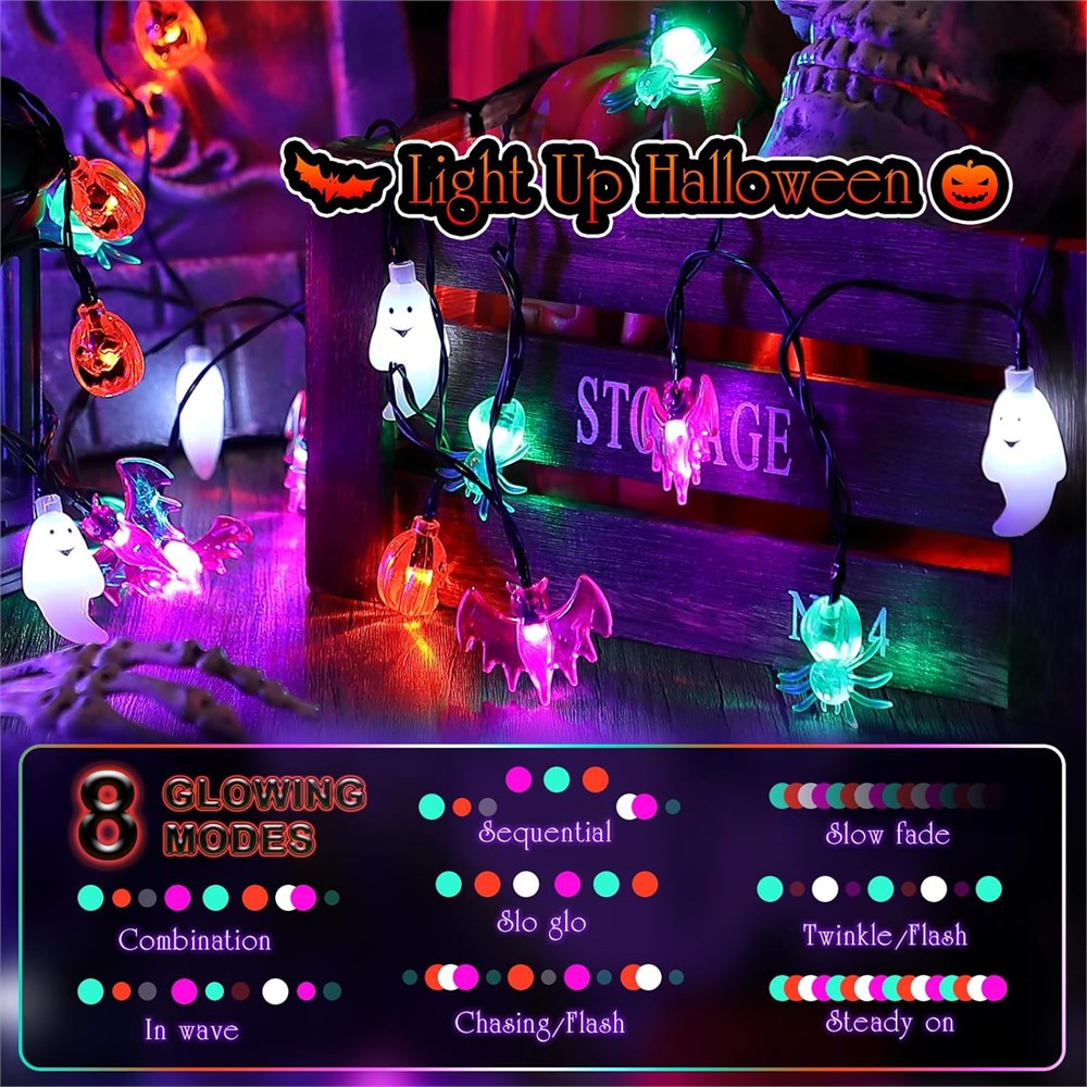 Product Specifications: The total length of the Solar Halloween String Lighs is 8 meters, including 10 white ghosts, 10 purple bats, 10 dark purple spiders, and 10 orange pumpkins; the hanging decoration and the light string are reinforced, so you don't have to worry about the hanging decoration falling off ;40 hanging ornaments and 8 meters in length are 2-3 times the specifications of other products, rich hanging ornaments make your Halloween more shining. High-efficiency Solar Power Supply: the halloween string lights uses A-grade solar chip power supply, the conversion efficiency of electrical energy is higher, charging 4 hours can make the light bulb flash for 10 hours; solar panel with light receptor, the light will not light up during the day, when the night comes, the light will automatically light up. 8 Lighting Modes: the Solar Halloween String Lighs has 8 lighting modes (combination, wave, sequence, slow light, chasing light/flash, slow gradient, flashing/flash and constant), and is equipped with 4 different colors of lights, white Ghosts, purple bats and spiders, orange pumpkins, create the creepy but fun vibe you want. IP44 waterproof: the light string is IP65 waterproof, and the solar panel is IP44 waterproof; put the Solar Halloween String Lighs on an outdoor tree or wrap it around a fence, and you don t have to worry about the light string being damaged by rain or moisture, and it can easily resist rain and snow. Severe weather; Safe and efficient solar string lights keep your Halloween unaffected; Upgrade the quality; in order to solve the problem that the light strings are easy to be entangled and knotted, we have upgraded the solar halloween string lighs, using thick and high-quality leather wires, which are not easy to knot and break; the product can be easily wound on trees or fences without any problems. one time purchase can be recycled for a long time.