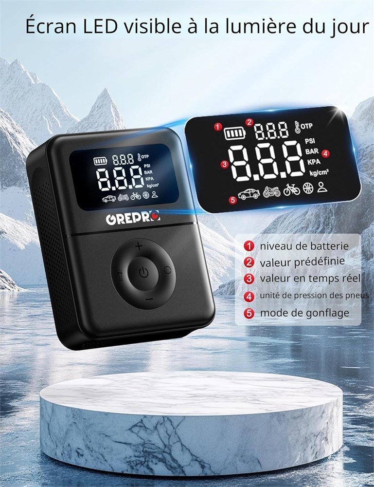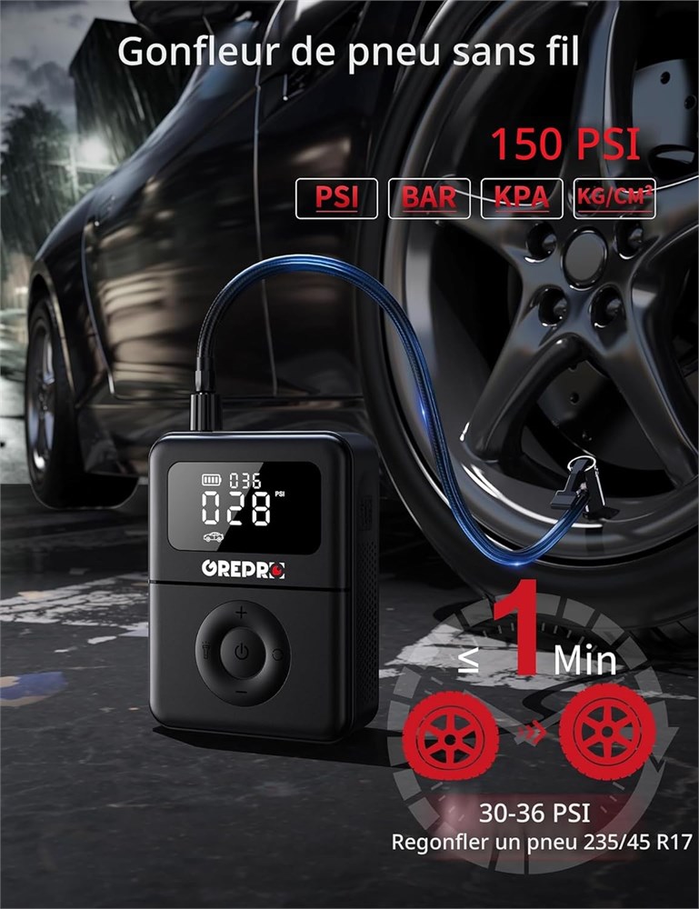 Booster portable Ce d marreur de batterie de voiture de 5000 A peut d marrer rapidement la plupart des v hicules 12 V (moteurs essence 10,0 L/diesel 8,0 L). M me si la tension de la batterie est extr mement faible, appuyez simplement sur le bouton BOOST pour d marrer votre voiture de force. Cette bo te de d marrage d'urgence batterie est con ue pour r sister des conditions m t orologiques extr mes allant de -20 C 60 C, adapt e aux voitures, camions, motos et SUV. Ce produit est environ 25 % plus petit en volume que les d marreurs similaires avec compresseur d air, ce qui le rend plus facile transporter et ranger. Gonfleur de pneu sans fil Le d marreur de voiture avec compresseur d'air offre 5 types de modes de gonflage (voiture, moto, v lo, ballon et personnalis ), avec une pression maximale int gr e de 150 PSI. Vous pouvez pr r gler la valeur (PSI, BAR, KPA, KG/cm ) que vous souhaitez et il s' teindra automatiquement lorsque la pression est atteinte. La pompe air peut gonfler un pneu 235/45 R17 de 30 PSI 36 PSI en seulement une minute. Remarque : laissez le compresseur d'air reposer pendant au moins 10 minutes apr s 15 minutes de fonctionnement continu. Double cran d'affichage : Le d marreur de batterie est quip d'un grand cran LCD et d'une fonction de jauge de pression des pneus, qui affiche les valeurs de pression en temps r el et les valeurs pr d finies, ce qui facilite la surveillance de l' tat de la pression des pneus. Vous pouvez pr r gler la valeur (PSI, BAR, KPA, KG/cm ) que vous voulez et il s' teint automatiquement lorsque la pression est atteinte, ce qui rend votre op ration plus pratique. Plusieurs protections de s curit : le booster avec compresseur d'air a un design unique de dissipation qui permet au d marreur de batterie d'obtenir plus de puissance. Les performances de s curit sont am lior es de 30%, sa dur e de vie est prolong e de 50%. C bles de d marrage intelligents am lior s avec technologie anti- tincelles et dix protections int gr es pour prot ger le booster de batterie de voiture contre les surintensit s, les courts-circuits, les surcharges, les surtensions, les surcharges. Les deux prot geront efficacement vous et votre voiture contre les dangers potentiels. Outil d'urgence multifonctionnel Ce d marreur avec compresseur d'air est quip de 3 modes d' clairage LED sur le dessus ( clairage / Stroboscopique / SOS) pour tre utilis comme lumi re d'urgence en cas d'urgence. De plus, le syst me d'aide au d marrage est dot d'une batterie int gr e de grande capacit et dispose d'une entr e USB C/sortie A, vous permettant de charger votre t l phone ou d'autres appareils lectroniques pendant que vous tes en d placement. 10 choses que vous pouvez obtenir 1 d marreur, 1 c bles de d marrage intelligents, 1 sac de transport portable, 1 tube de pompe, 3 buses d'air, 1 c ble USB-C, 1 bo te d'emballage, 1 manuel d'utilisation. Le d marreur portable GREPRO pour voiture est galement un excellent cadeau pour No l ou un anniversaire. Remarque : si l'appareil n'est pas utilis pendant une longue p riode, nous vous recommandons de le charger tous les trois mois pour prolonger la dur e de vie du booster.