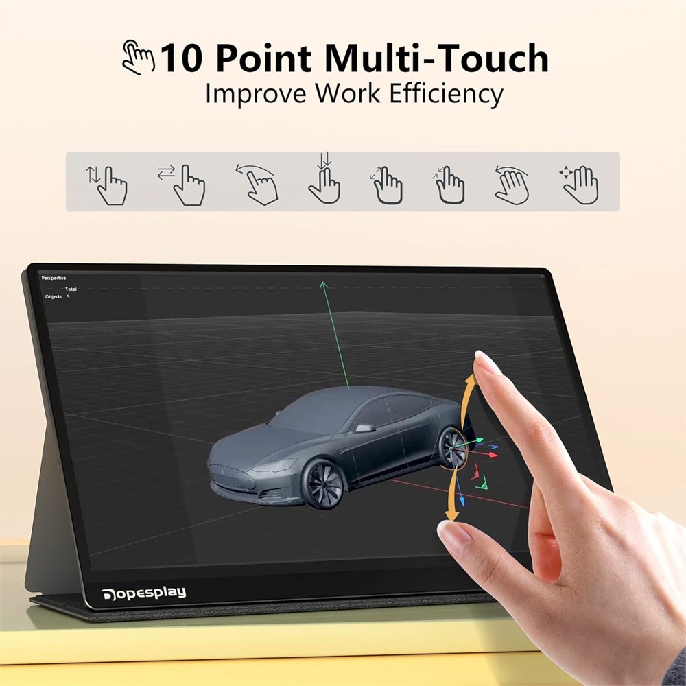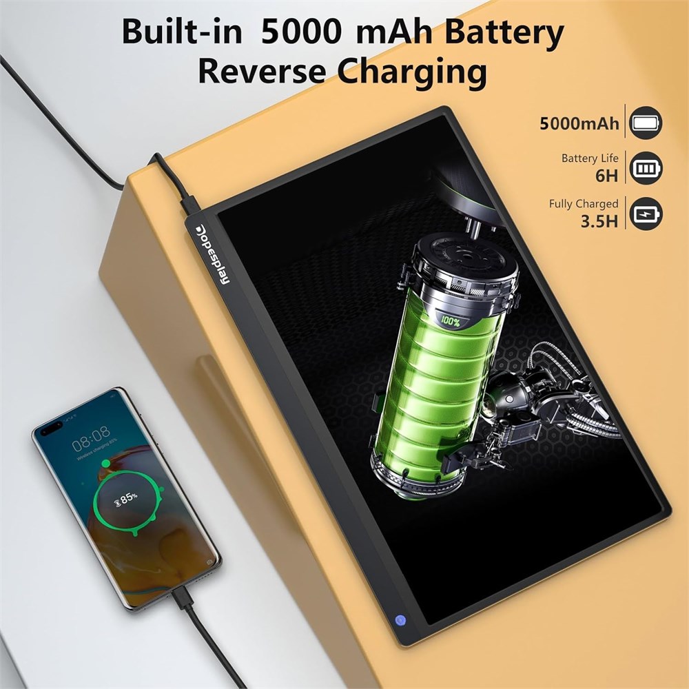 Notice Before Purchasing Due to operating system limitations, Apple devices do not support touch screen functionality, but do support projection screen. Other devices need to be connected to type-c to use the touch screen function. Please check if your device Type-C port is full-featured. 10-Points Touch Screen Dopesplay portable monitor supports 10-point captivate multi-touch, adopted G+FF technology, provide more precise and sensitive touch, no extra app/driver needed, just connect a full-featured Type-C port on the touch screen monitor to your device to achieve the touch function. FHD 1080P Portable Monitor Dopesplay portable gaming monitor adopts HDR technology and 15.6'advanced IPS screen with 178 wide viewing angle and 16: 9 aspect ratio, delivering 1920*1080 resolution with incredible image quality. The portable laptop monitor is built-in 4pcs speakers, great ideal for extending your phone screen for video watching or gaming. Built-in 5000mAh Battery Dopesplay portable monitor with battery built-in 5000mAh, it not only provides power supply for the monitor, but also can reversely charged your mobile phone via type-c port. It's your best on-the-go portable screen for laptop you can take it anywhere when business trip as a travel monitor. Wide Compatibility Dopesplay second screen for laptop is compatible with Laptop, PC, Mac, Surface, Android Phone,PS4, PS5, Xbox, Nintendo Switch, Camera and etc. It supports duplicate and extend mode to expand your screen. These Samsung phones (Galaxy S8/S9/S10/S20/S21/S22/S23 series; Galaxy Note8/9/10/20series; Galaxy Fold, Z Fold 2/3/4) can work with monitor by our original USB-C cable. Other Phones without a full-function Type-c port require an adapter (not included) to connect.