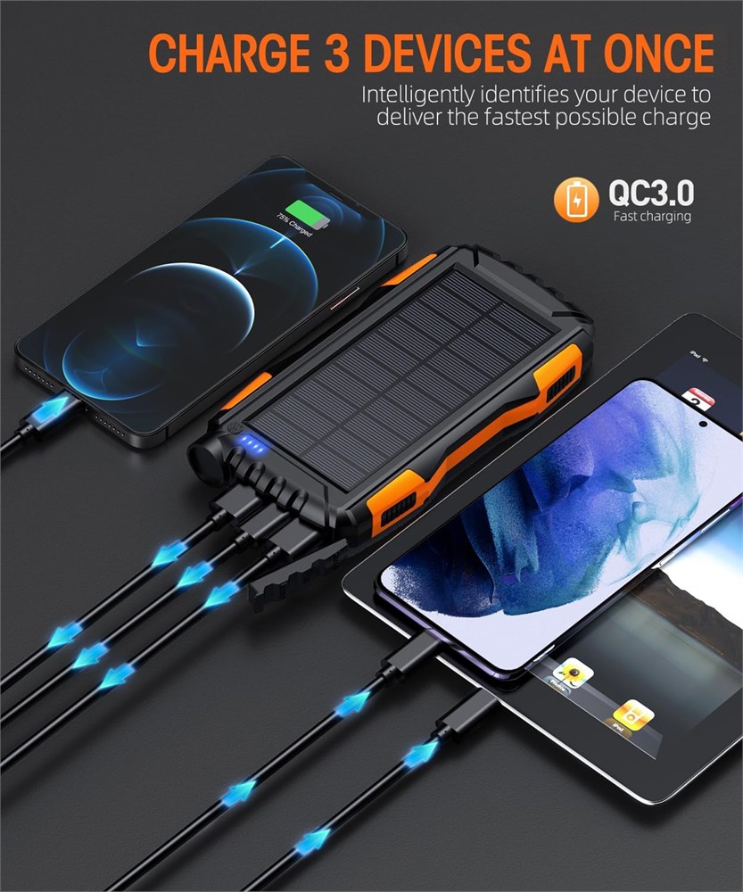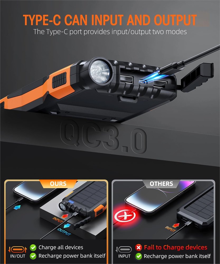 Solar charger power bank has a large battery capacity of 42800mAh, and uses high-density batteries to load a larger capacity without changing the volume and weight. The super battery life allows you to get rid of the anxiety and worries about the depletion of the device power anytime and anywhere. Portable charger is compatible with all USB devices such as smartphones and tablets. The battery pack charger portable has 2 USB output ports, if the device is compatible, the portable battery pack can support the QC3.0 fast charge protocol. Solar phone charger is equipped with a super bright LED flashlight with a long range, It can work continuously for up to 100 hours. Solar power bank portable charger uses strong professional ABS material, Chemical resistant, heat-resistant, and has super surface hardness, high elasticity and toughness. IP67 waterproof,drop-proof and dust-proof, so you no longer worry about damage caused by water/drop, the powerbank can work in extreme environments. Friendly reminder: When the solar panel is being cared for, it will generate current to charge the battery, and the indicator light will flash.Solar charging is affected by the instability of sunshine intensity and duration. The battery capacity of the portable charger power bank is very large, so the charging will be very slow and should be used as an emergency function. For daily charging, please use a charger with a power above 5V2A to charge the portable phone charger.