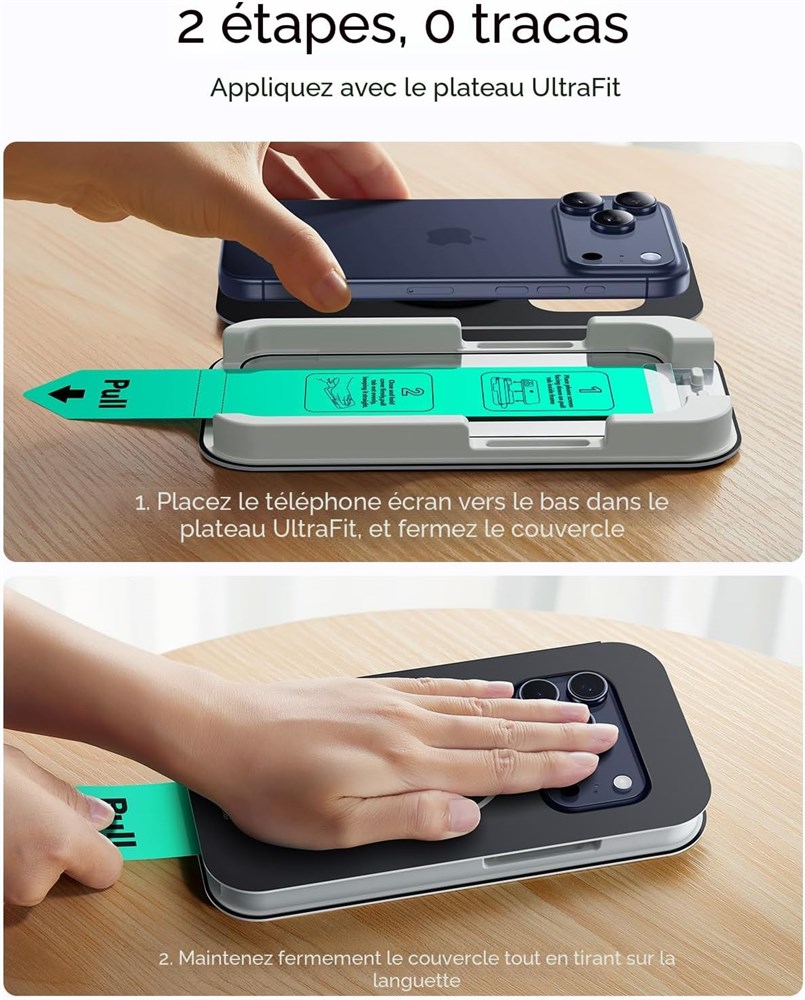 Compatibilit : uniquement pour iPhone 17 Pro Max UltraFit en un clair : comprend un kit de nettoyage et un plateau UltraFit pour le protecteur d' cran (lire les instructions avant utilisation), pour une application rapide et facile, sans bulles chaque fois Sans bulles ni poussi re : la technologie avanc e d'adh sif nano garantit un ajustement parfait sans bulles ni poussi re, tout en maintenant une qualit d' cran cristalline Protection de qualit militaire : le verre tremp ultra r sistant r siste jusqu' 15 kg de pression, prot geant votre cran des chutes, des chocs et des rayures Dans la bo te : protecteurs d' cran ESR (lot de 3, uniquement pour iPhone 17 Pro Max), bac UltraFit, kit de nettoyage et manuel Support client complet : vid os de configuration d taill es, FAQ, plan de protection complet de 12 mois, assistance illimit e et aide personnalis e.